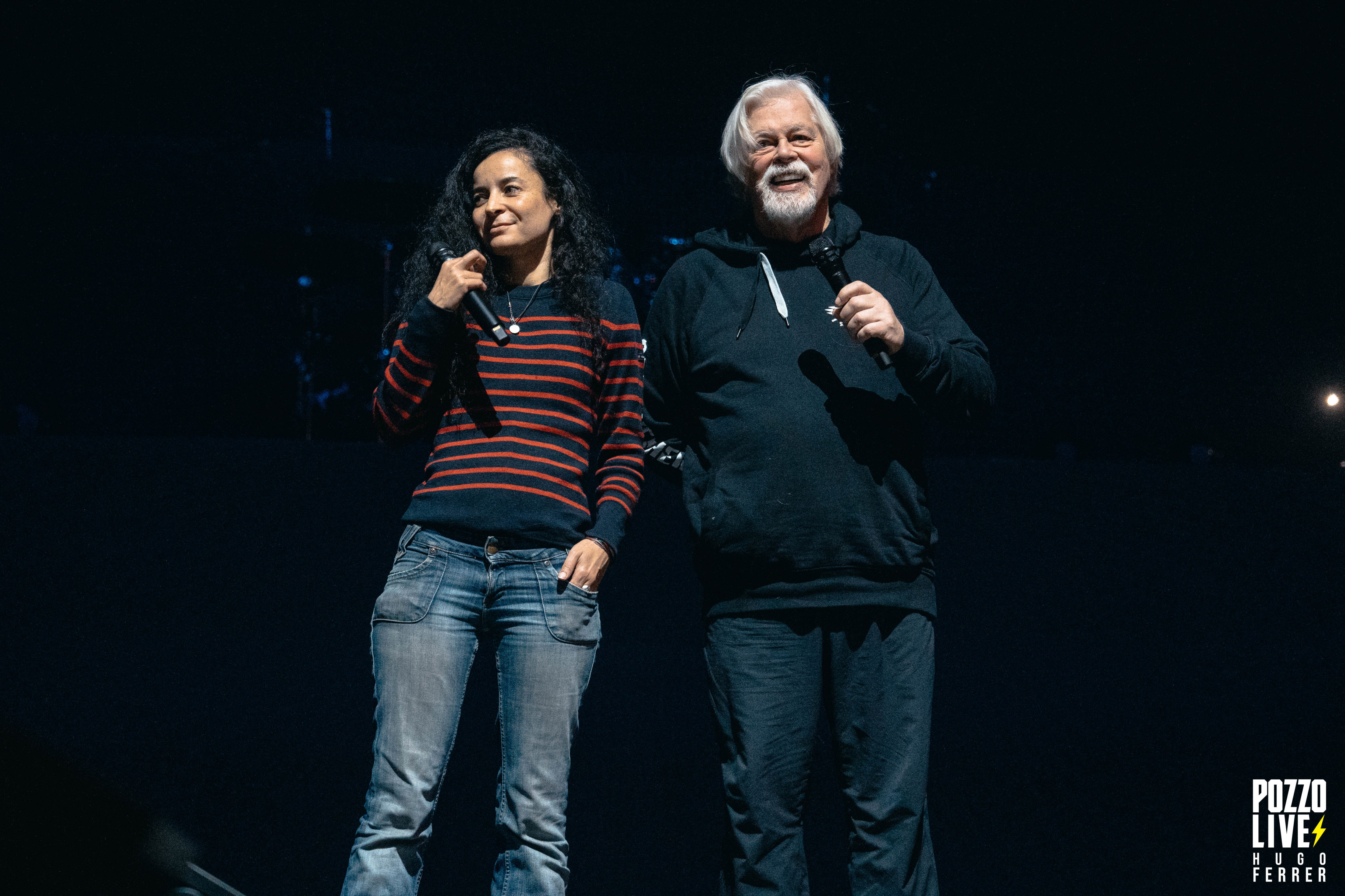 Quelques minutes avant l’entrée d’Architects, nous voyons arrivés sur scène des militants de Sea Shepherd dont le Capitaine Paul Watson, venu présenter l’association pour la protection des océans. Il est 21h lorsque Architects rejoint la scène, on découvre alors la scéno avec une scène montée sur 3 étages parés d’écrans lumineux. Le ton est donné lorsque les notes de Seeing Red font monter les cris du public, alors que les paroles sont affichés sur les écrans, Sam Carter tout en haut de la scène. Comme un air de déjà vu avec Bring Me The Horizon… Mais qu’est ce que ça fonctionne bien ! Le spectacle est entier autant visuel que sonore tout le monde peut en profiter.