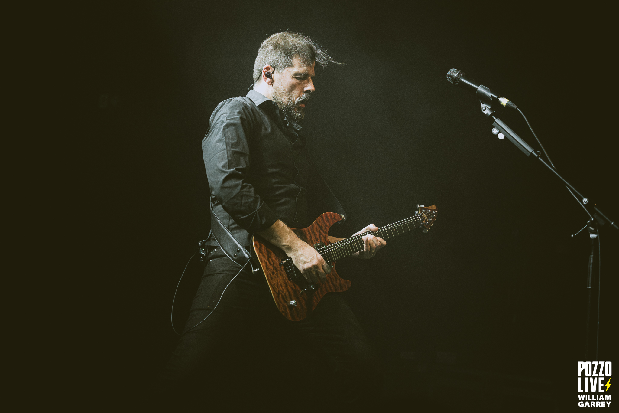 Le plat de résistance de la soirée, Dark Tranquility, investit une scène dans sa configuration la plus large, avec un mur de lumière à l’arrière des musiciens. Dès leur entrée en scène, l’ambiance monte d’un cran avec une fosse qui se rapproche au plus près de la scène.