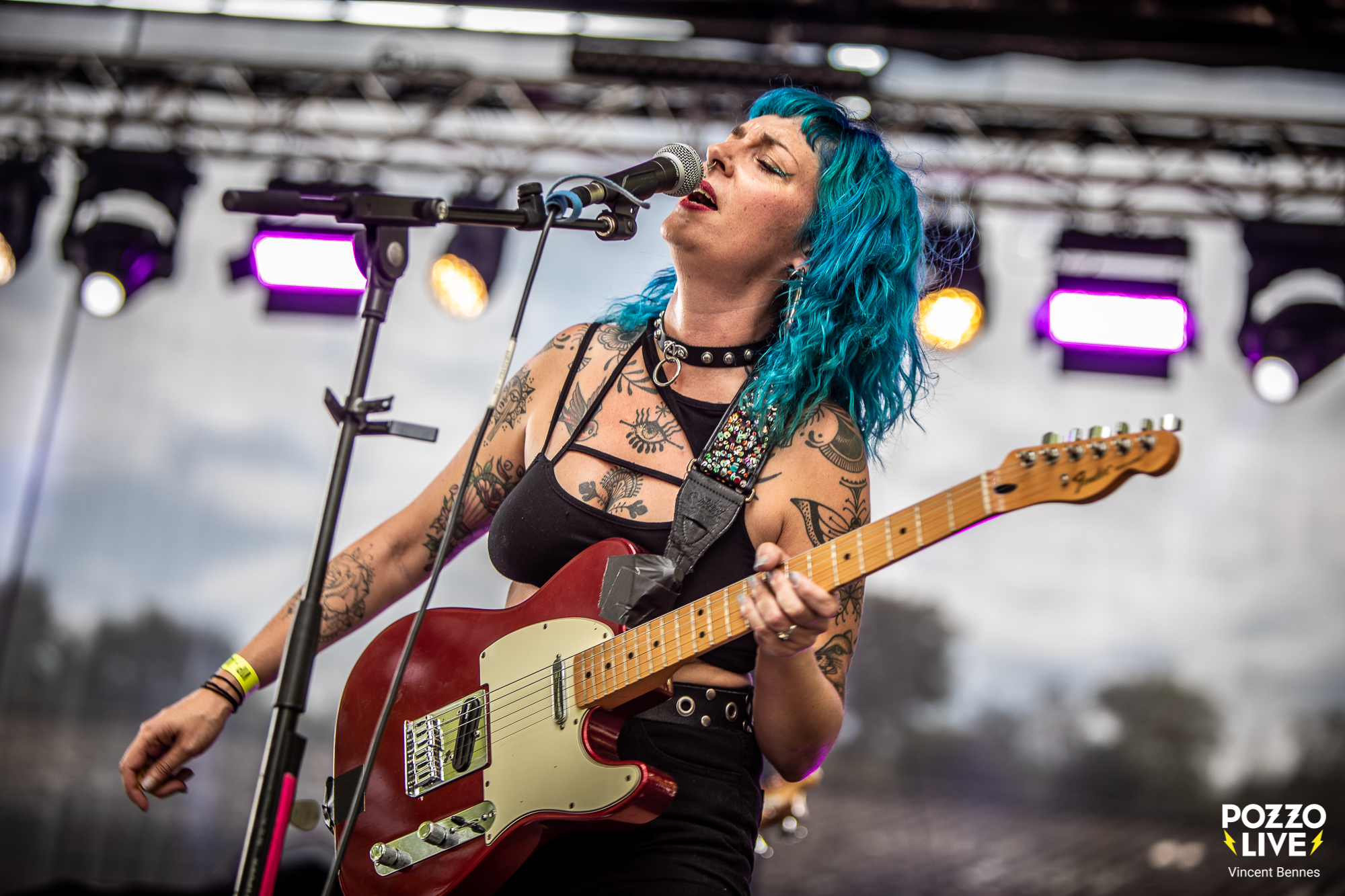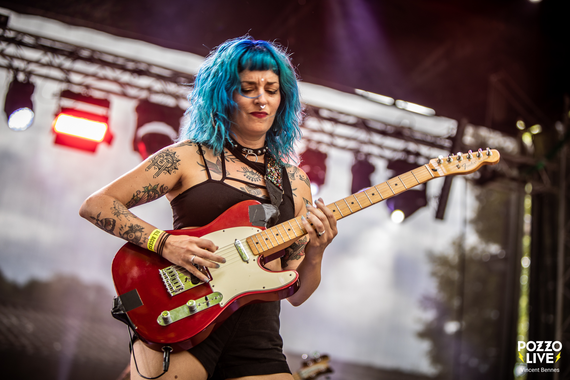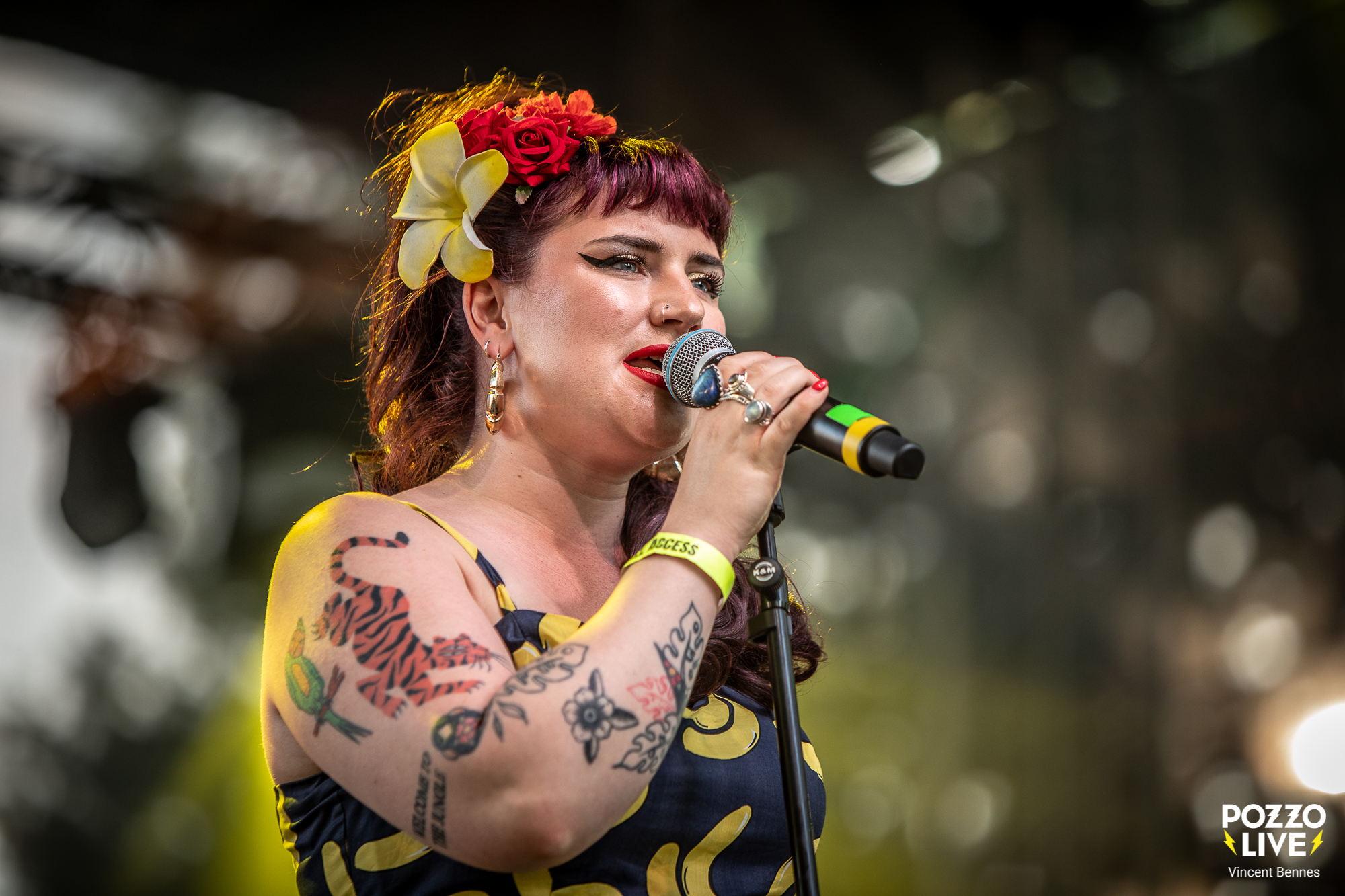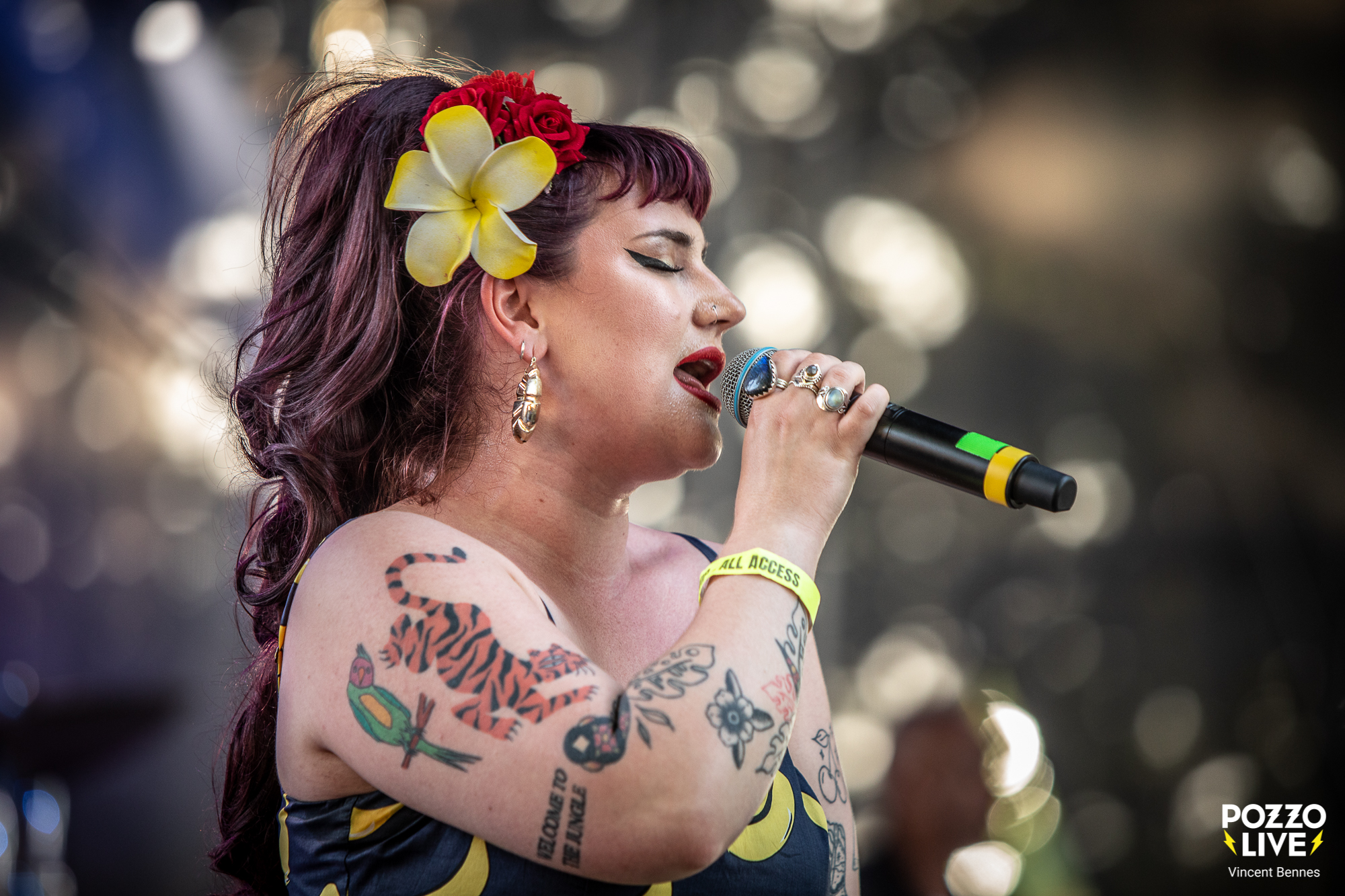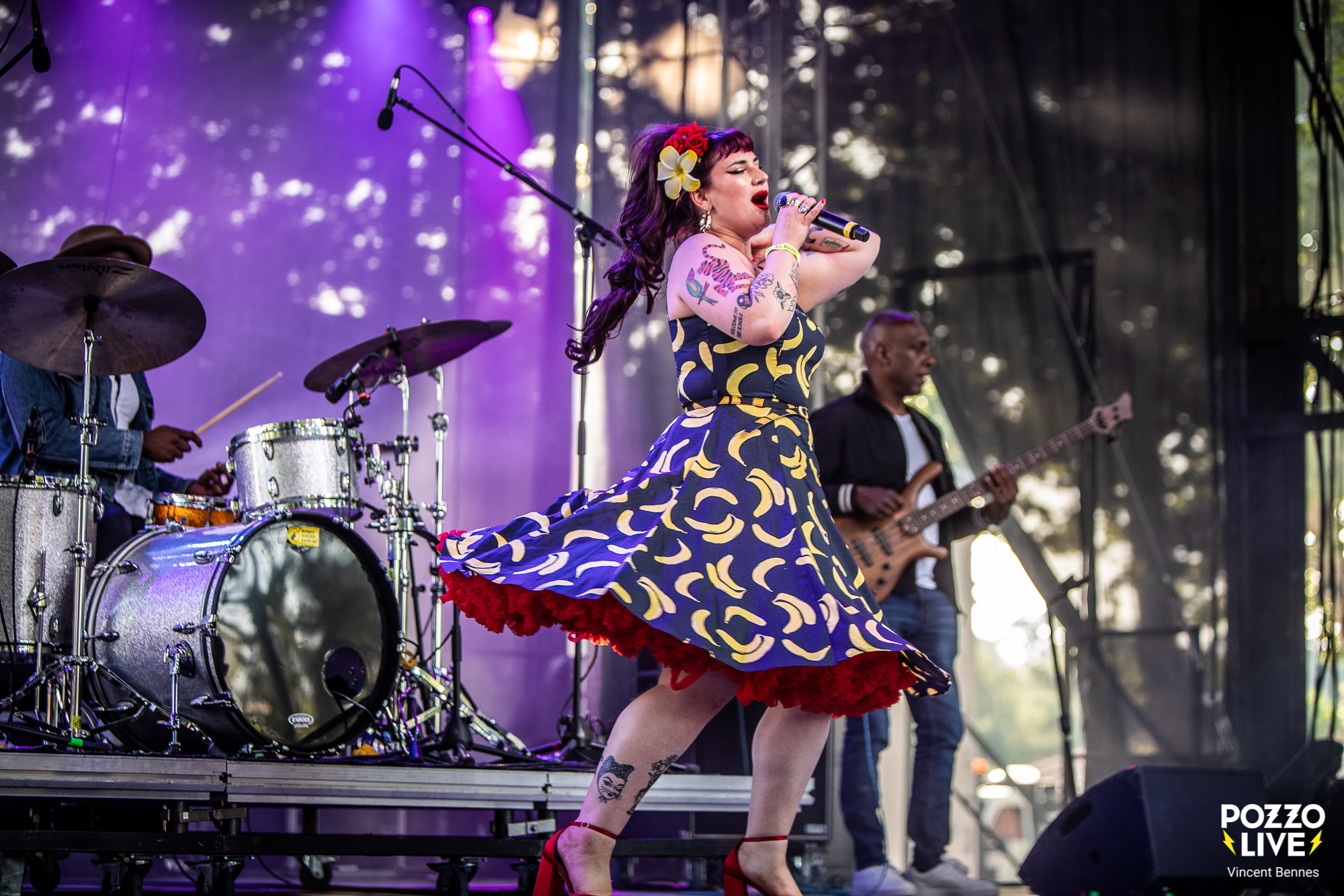 Bon, disons-le tout net, ce soir il y a un mélange de fébrilité et de doute au sein du public. En effet, les festivaliers, nombreux aux avant-postes, savent qu’ils vont retrouver les musiciens d’Amy Winehouse, mais une question flotte dans l’air : la « nouvelle » chanteuse sera-t-elle à la hauteur ? Entre véritable engouement et crainte d’être déçus, les premiers regards vers la scène se font prudents. Car toucher au répertoire d’Amy sans tomber dans la caricature ni trahir son esprit, relève de l’équilibrisme. Et même si c’est Dale Davis, le bassiste, ami, confident et directeur musical d’Amy Winehouse qui a monté ce projet, l’inquiétude est belle et bien réelle…
