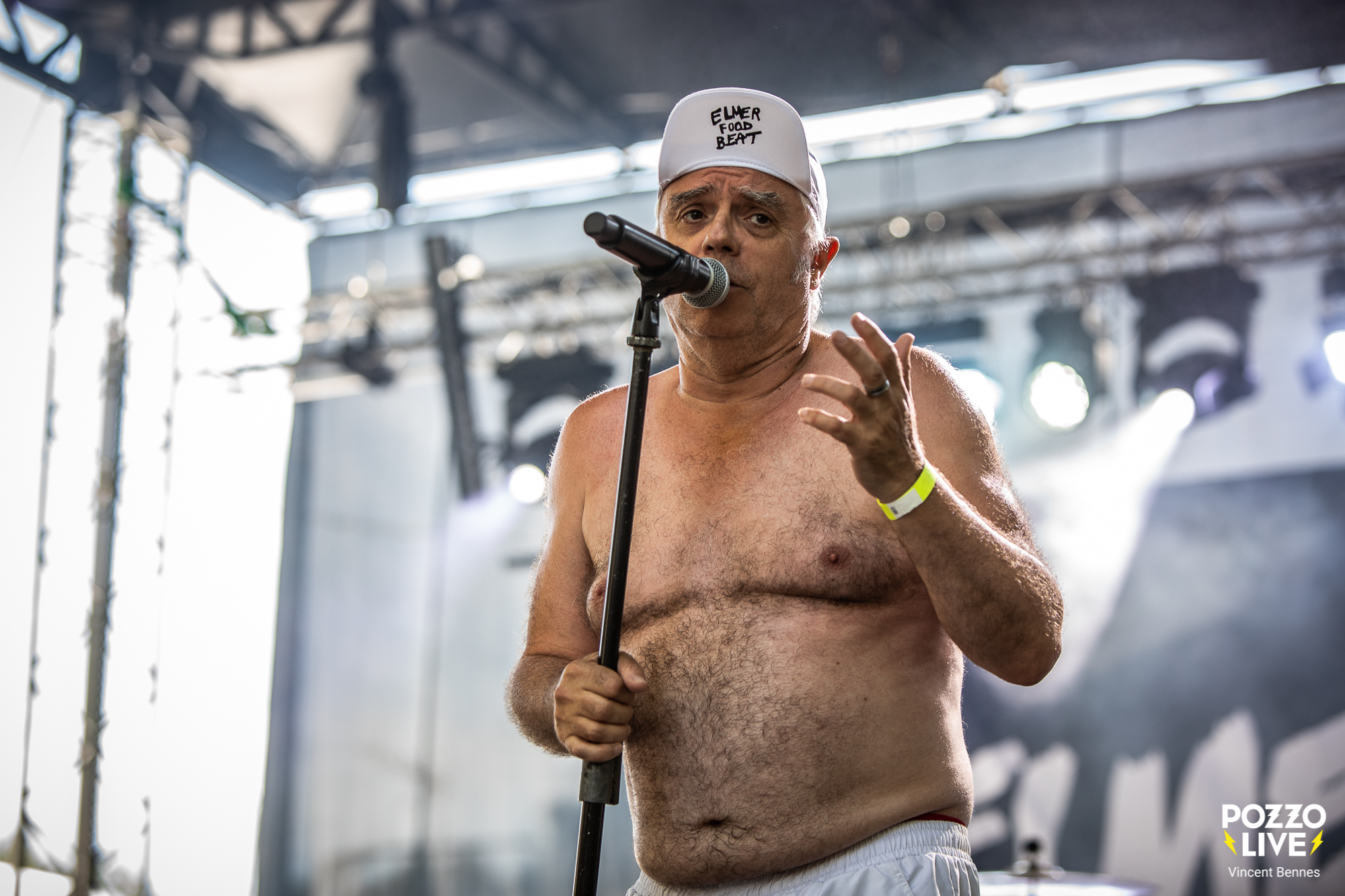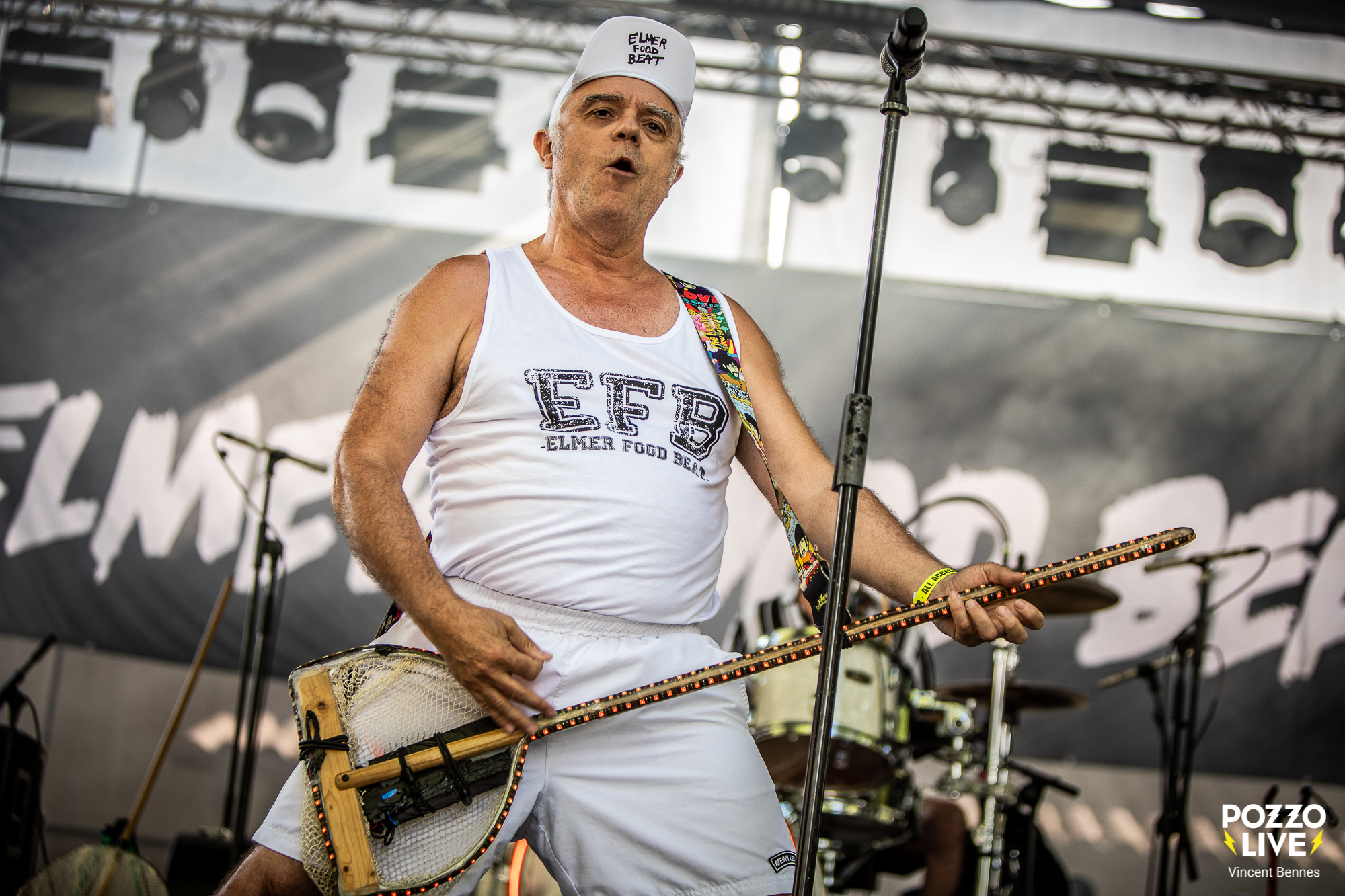 Dès 18h10, la Place du Champ de Mars est bien remplie et dans la foule hétéroclite – familles avec enfants, quinquas nostalgiques, ados curieux, festivaliers aguerris, on aperçoit déjà quelques casquettes siglées « Elmer Food Beat », des poupées gonflables et même, pour les plus connaisseurs, des paires de chaussettes montées à mi- tibias en guise de clin d’œil. Pas de doute, les Nantais d’Elmer Food Beat sont attendus de pied ferme.