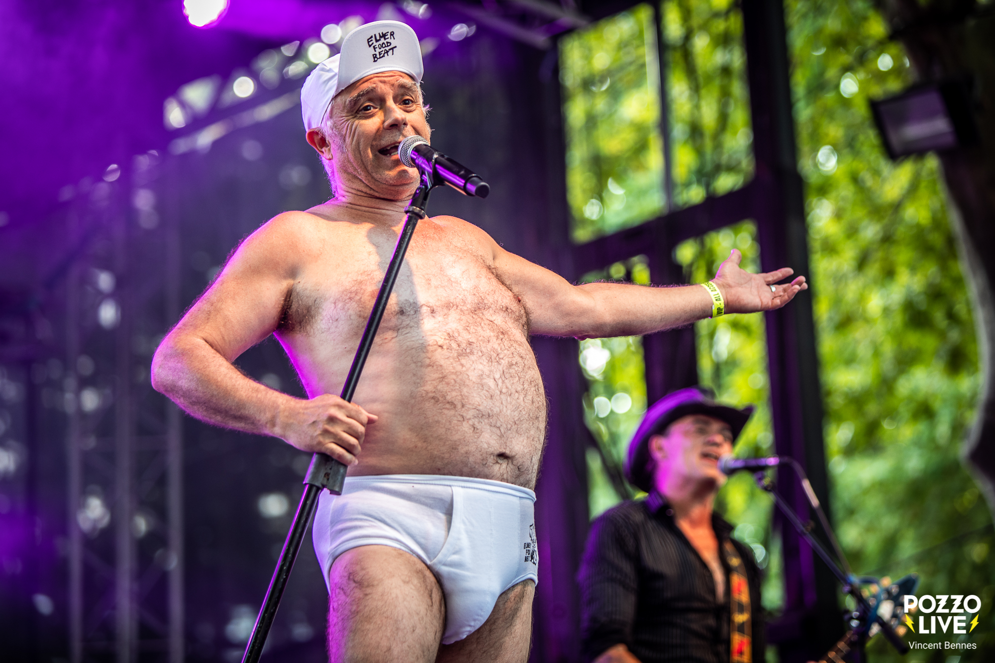 Et quand le chanteur Manou débarque sur scène dans son éternel accoutrement – short, marcel, casquette et épuisette en guise de guitare – c’est l’explosion. Sans sommation, le groupe balance un « Ça c’est Rock » d’ouverture qui donne le ton : ce sera sale, drôle, chaleureux… et rock n’roll jusqu’au bout du slip kangourou. En l’espace de quelques accords, la mayonnaise prend immédiatement et le rock potache d’EFB retrouve son trône. Autant dire que côté setlist, les incontournables de l’album 30 cm sont bien sûr de la partie avec « L’Infirmière », « Est-ce Que Tu La Sens ? », « Couroucoucou Roploplo », « La Caissière de chez Leclerc » ou encore « Brigitte » qui font vibrer les enceintes et les cordes vocales d’un public véritablement conquis. D’ailleurs, les plus jeunes découvrent avec stupeur qu’on peut rire de tout en musique tandis que les plus anciens qui chantent à pleins poumons des textes grivois sont visiblement heureux de retomber dans une adolescence débridée. Voilà, un curieux jeux de miroirs inter générationnel…