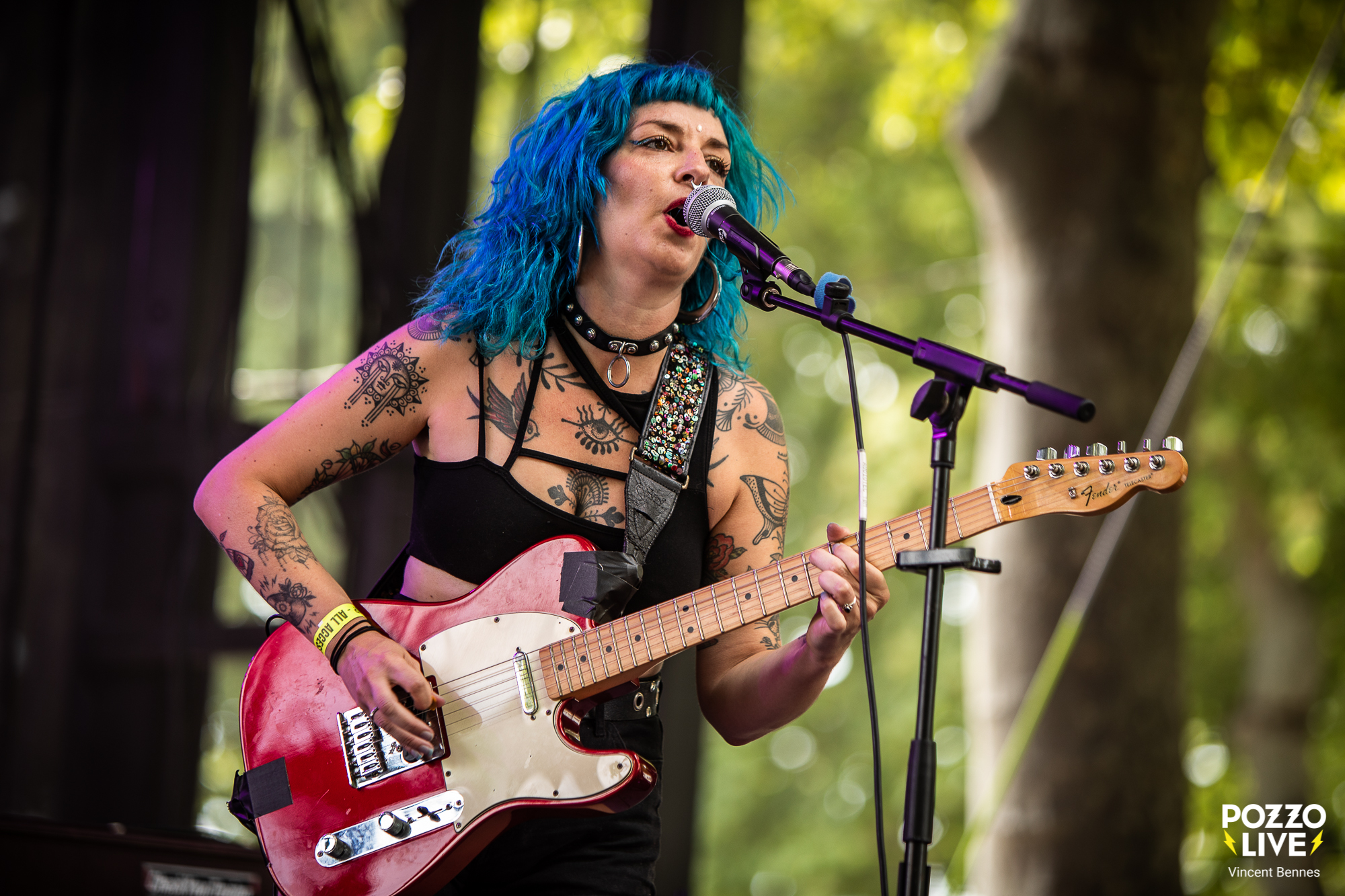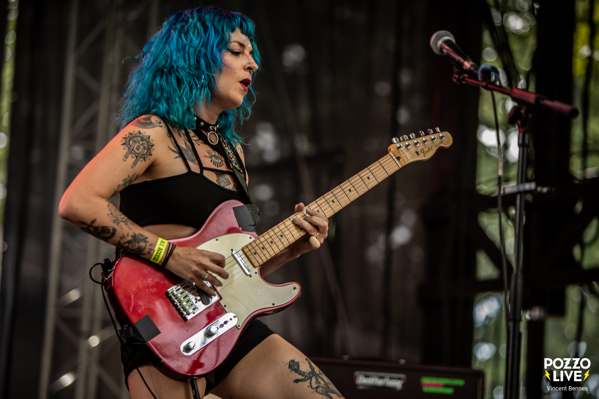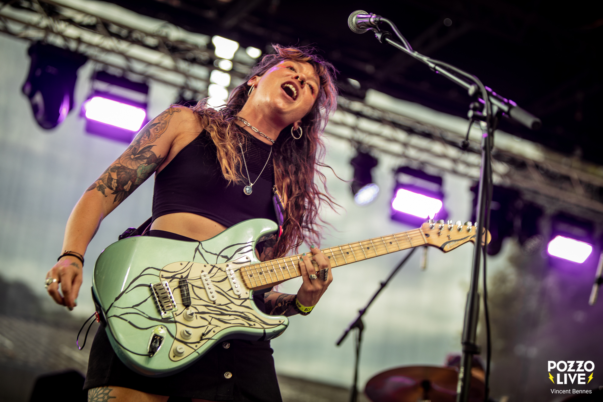 17h tapantes, le quatuor Pussy Miel monte sur les planches pour prendre possession de la scène des Voix Sonneuses avec la lourde tâche de lancer les concerts de ce second jour de festival. Un horaire pas évident, avec un public encore clairsemé, les pieds dans l’herbe et les yeux à moitié fermés. Mais ça n’a pas freiné le quatuor landais, bien au contraire. À l’image de son set l’année dernière dans le cadre de l’Xtreme Fest, les quatre musiciennes ont joué le jeu à fond au travers d’un set généreux, intense et toujours furieusement sincère.