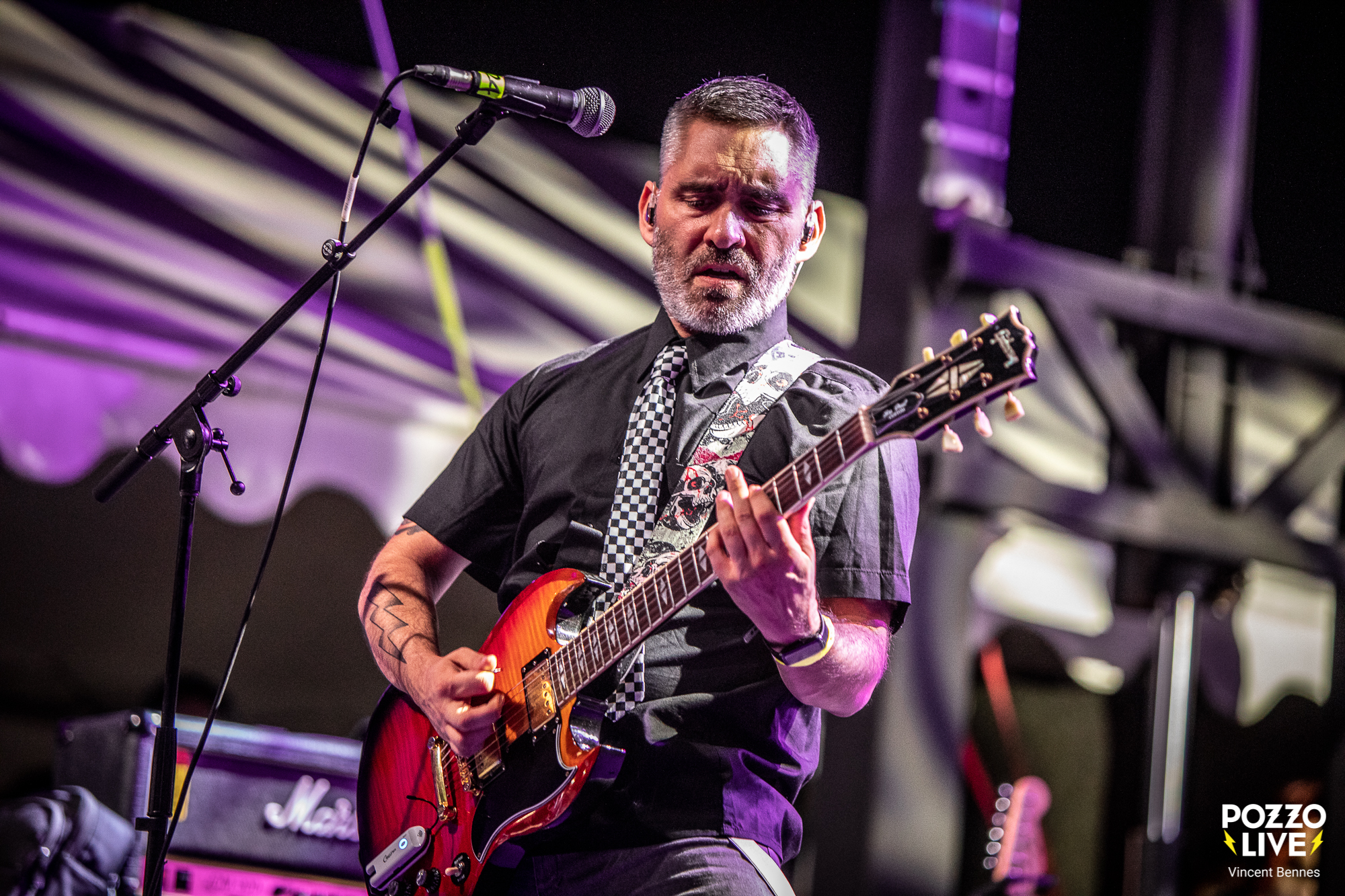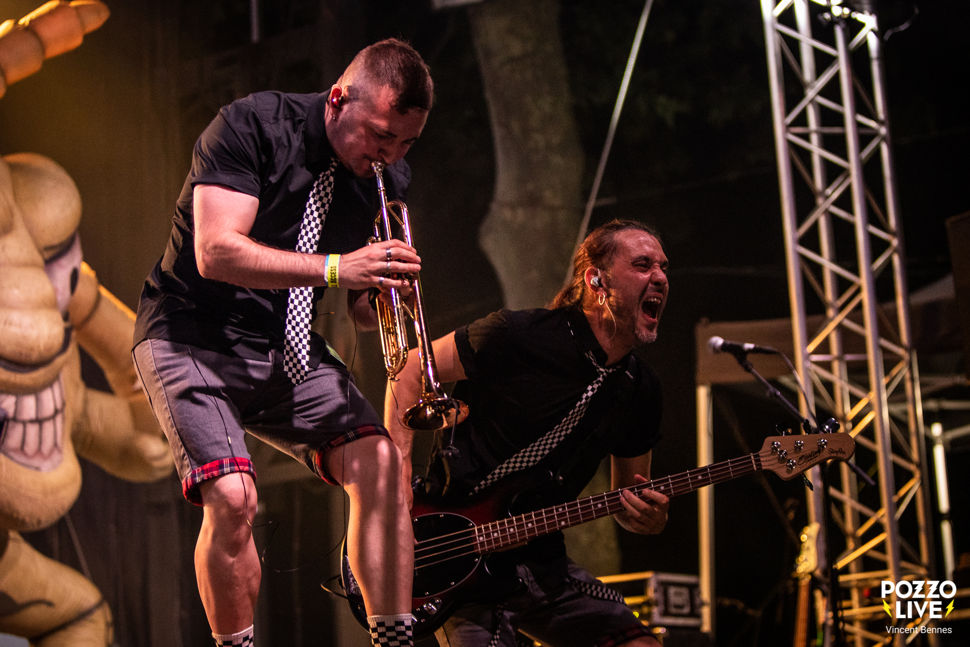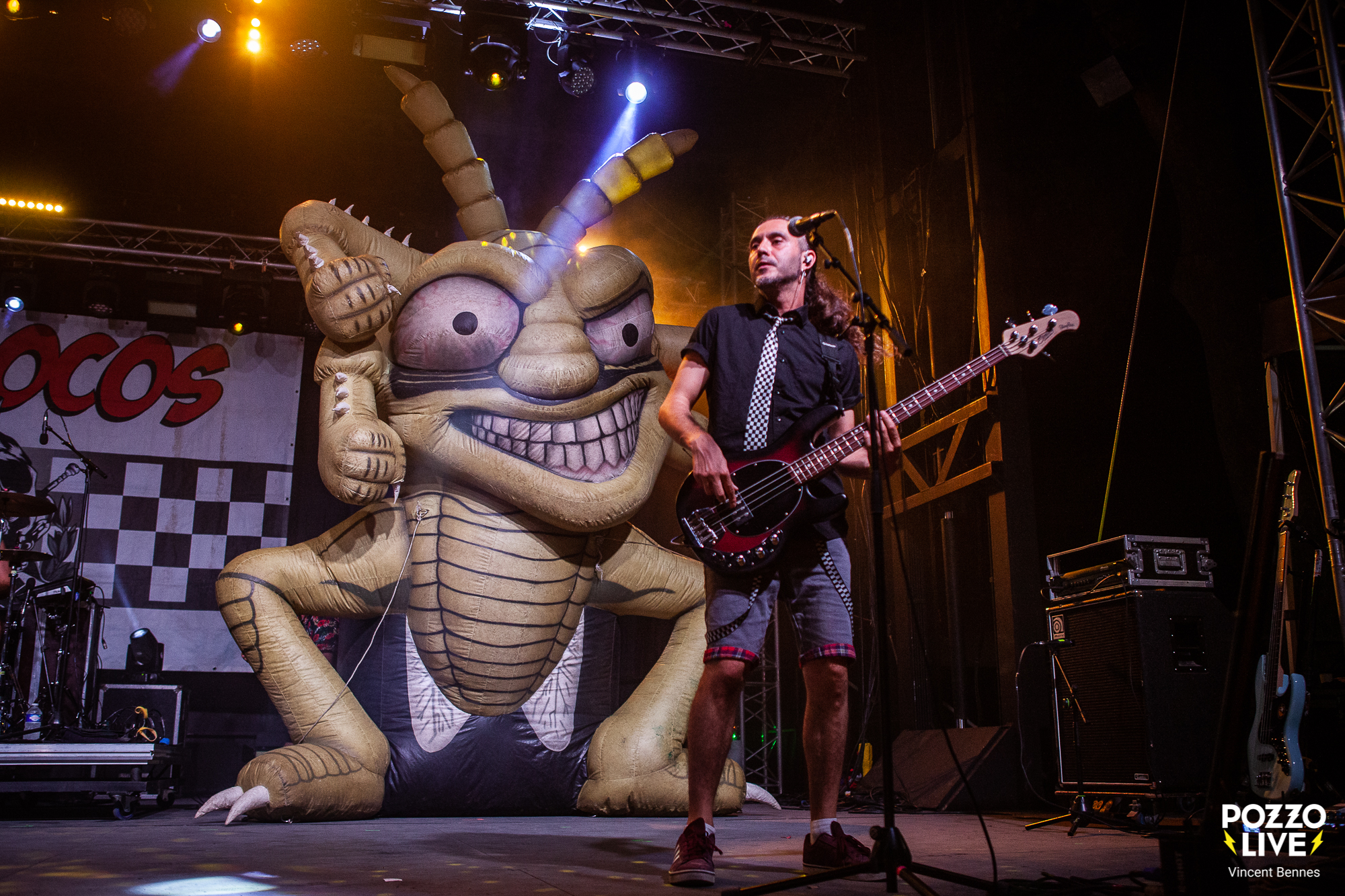 Pour clore ce second jour du festival des Voix Sonneuses Sud De France, la température a soudainement grimpé d’un cran aux alentours de 23h30. Non pas à cause du mercure mais de l’arrivée en scène de The Locos, le groupe mené par le chanteur Ricardo Delgado alias Pipi, l’ex trublion de Ska-P qui a fait les beaux jours du groupe entre 1994 et 2017 et enregistré les albums classiques El Vals Del Obrero, Eurosis, Planeta Eskoria ou ¡¡ Que Corra La Voz !!. Bref, le public, venu en nombre, n’a pas mis longtemps à plonger dans le grand bain ska punk bouillant servi par ces madrilènes déchaînés.