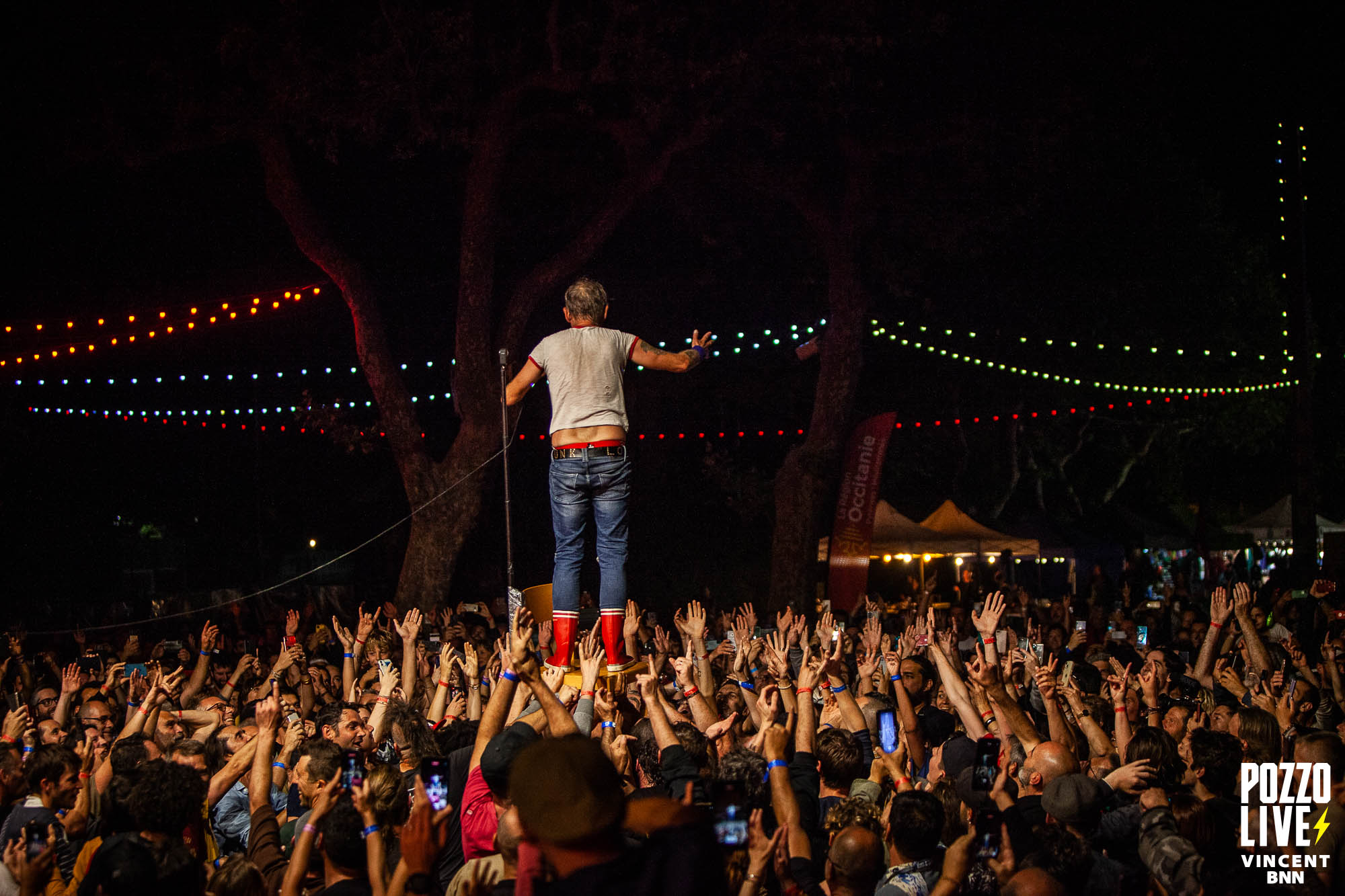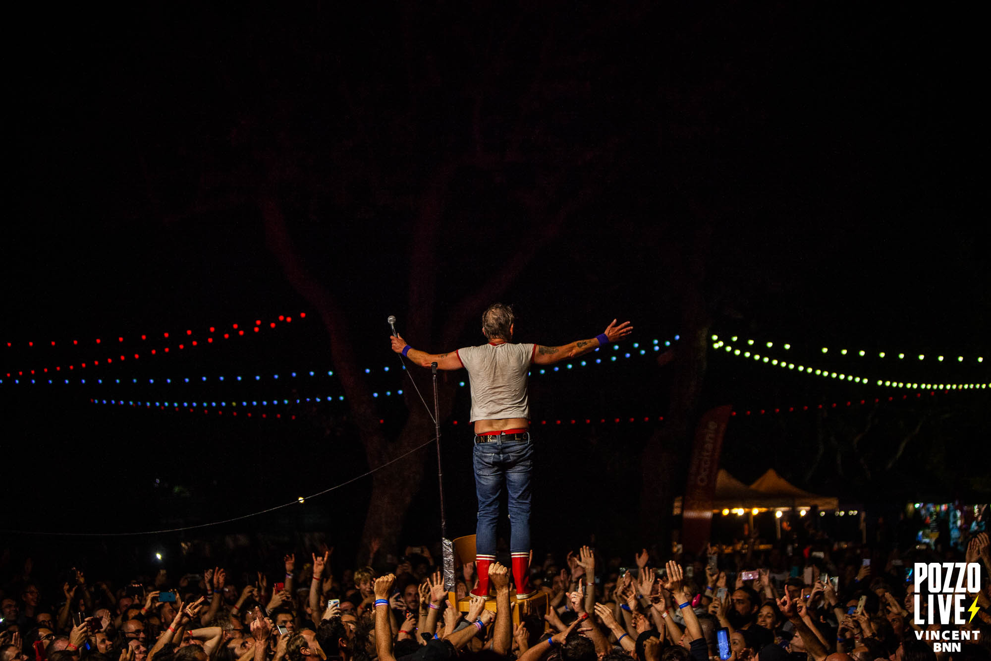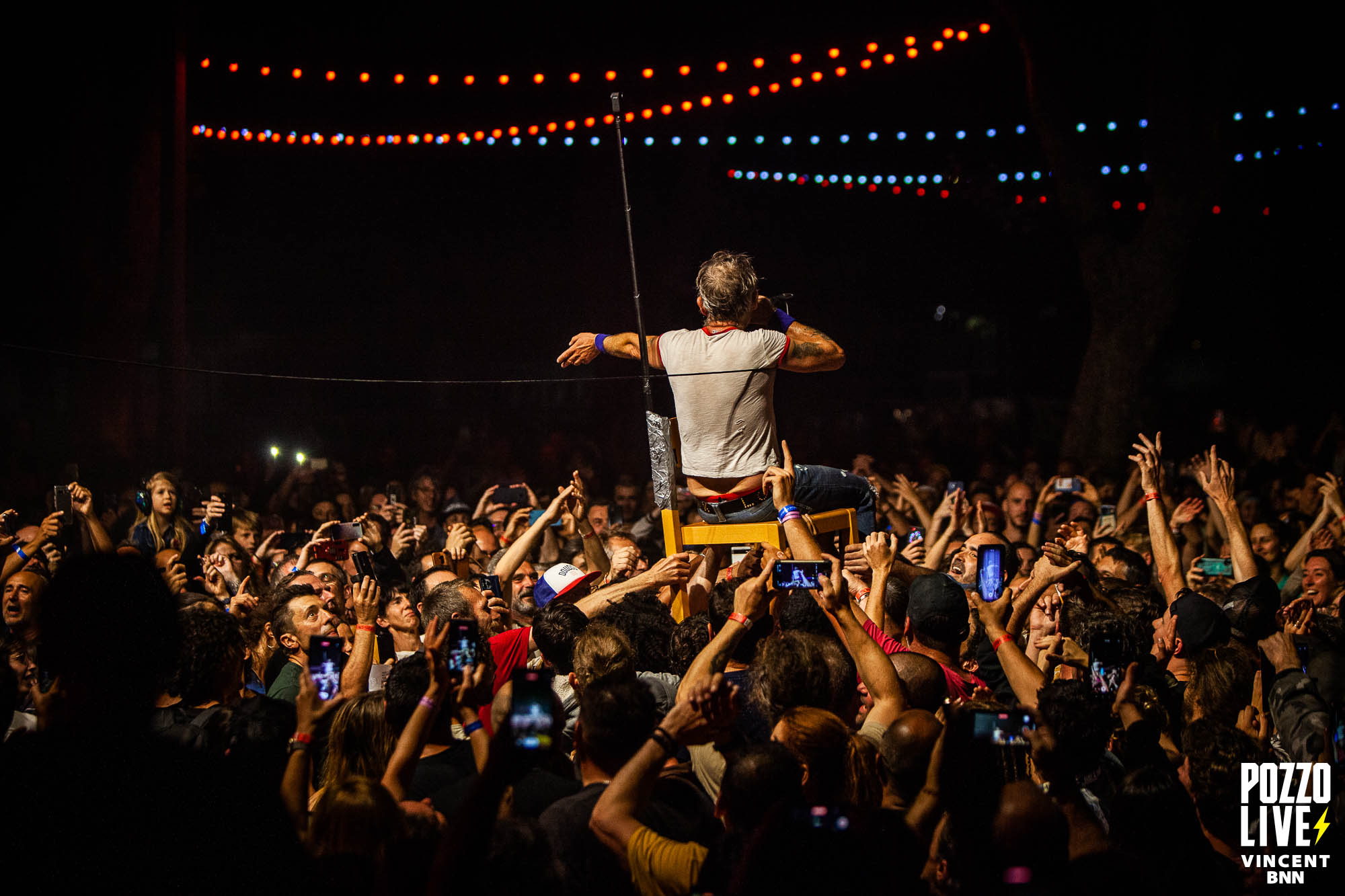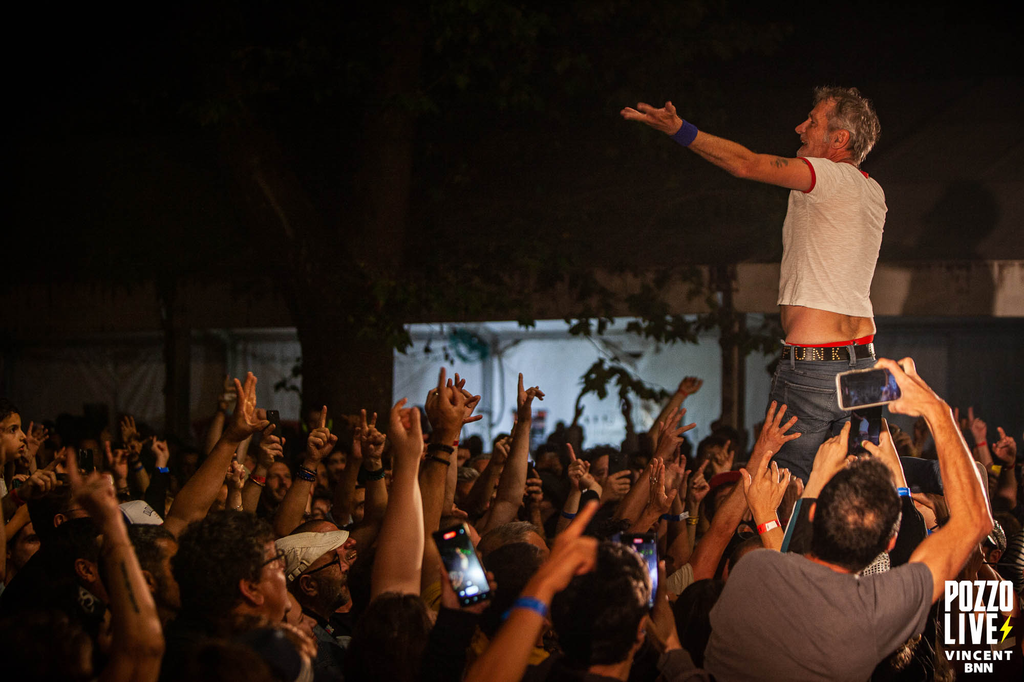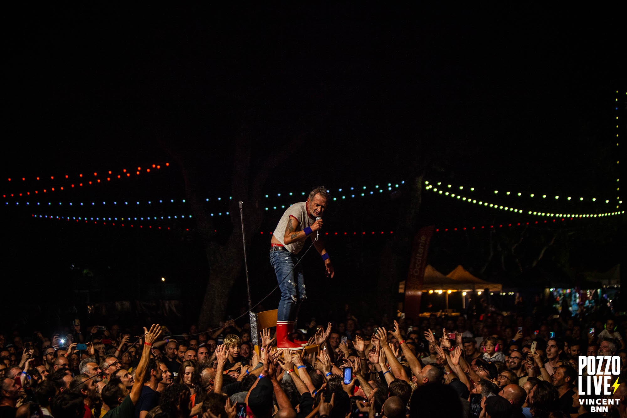 À son retour sur scène, il récupère des bottes rouges envoyées un spectateur (en référence à la chanson « Les Bottes Rouges », ndr) et continuera son concert divinement chaussé… Même si le poids des années (et des excès) se fait parfois sentir dans le chant du frontman (« Frontignan Blues », par exemple), l’homme a pris le parti de se donner corps et âme dans tous les morceaux, n’hésitant pas à escalader les amplis (« Punk Ouvrier ») ou à inviter le public (et même la section PMR) à faire un wall of death en prenant une grosse voix de meeetaaaôôÔÔL. Autant dire que les festivaliers s’en donnent à cœur-joie devant ce joyeux bordel, si bien que les fans et les familles qui découvrent ce soir Les Wampas, se retrouvent sur la même longueur d’onde. Qui plus est, dès les premiers accords de la chanson désormais classique « Manu Chao », la foule saute comme un seul homme et reprend à gorge déployée le refrain. C’est d’ailleurs à ce moment-là que sera tiré un feu d’artifice au-dessus de la scène des Voix Sonneuses. Cela ne pouvait pas mieux tomber. À partir de là, Didier sera intenable et fera des allers-retours entre le public et les planches sans aucun temps mort.