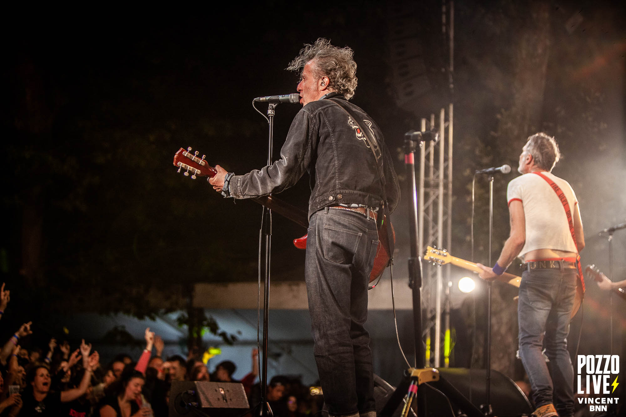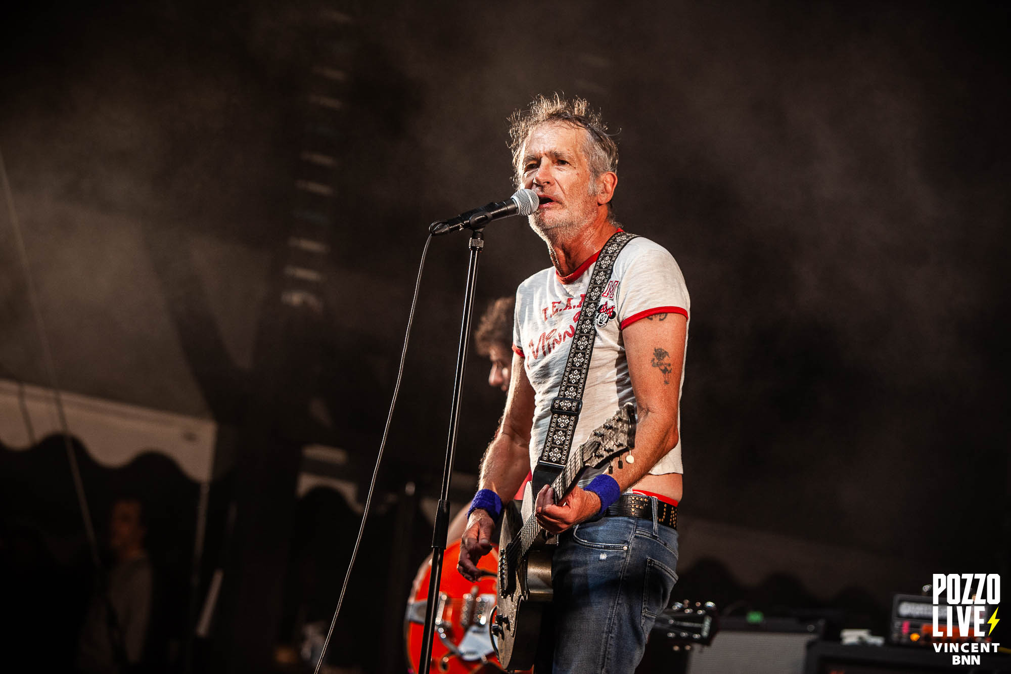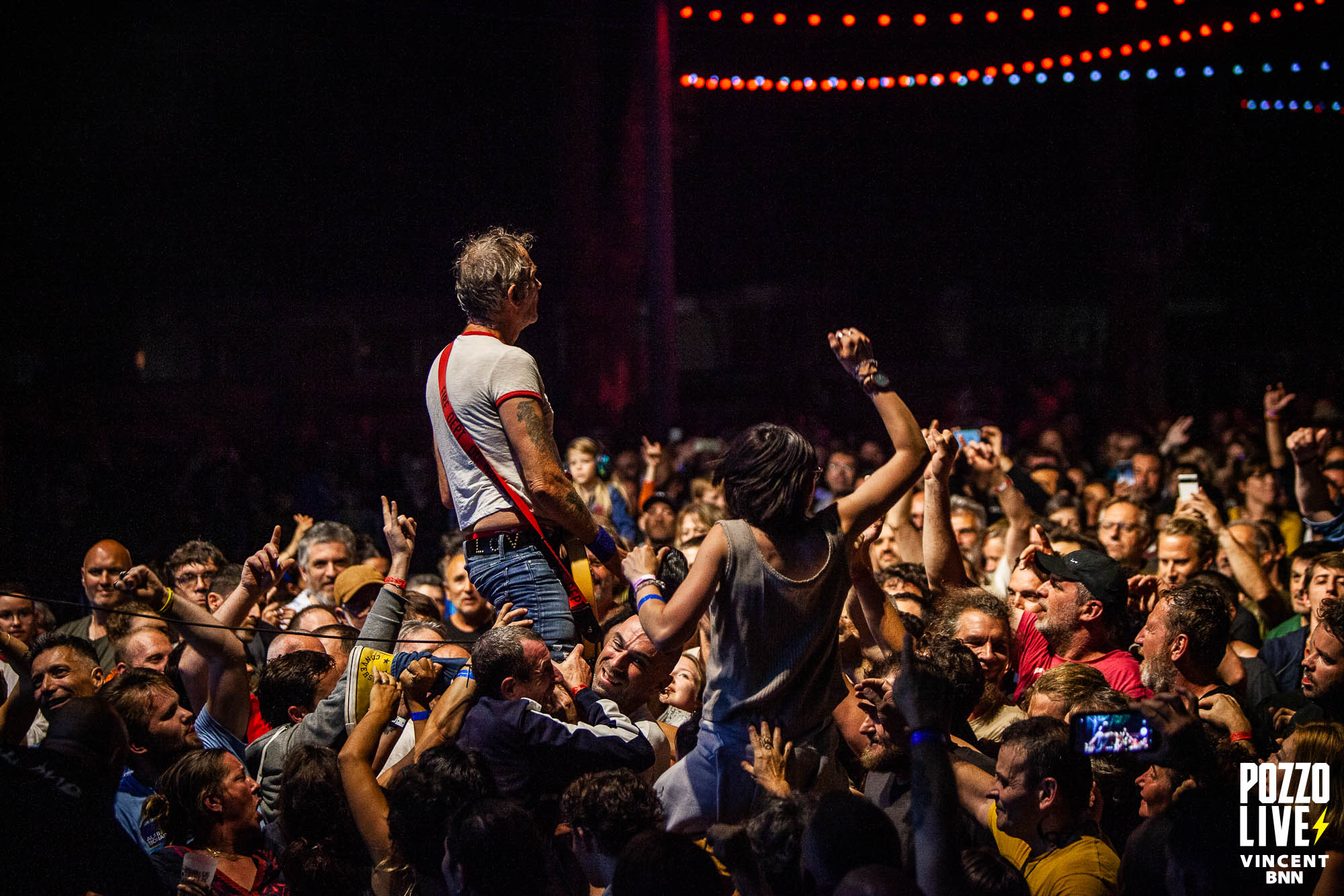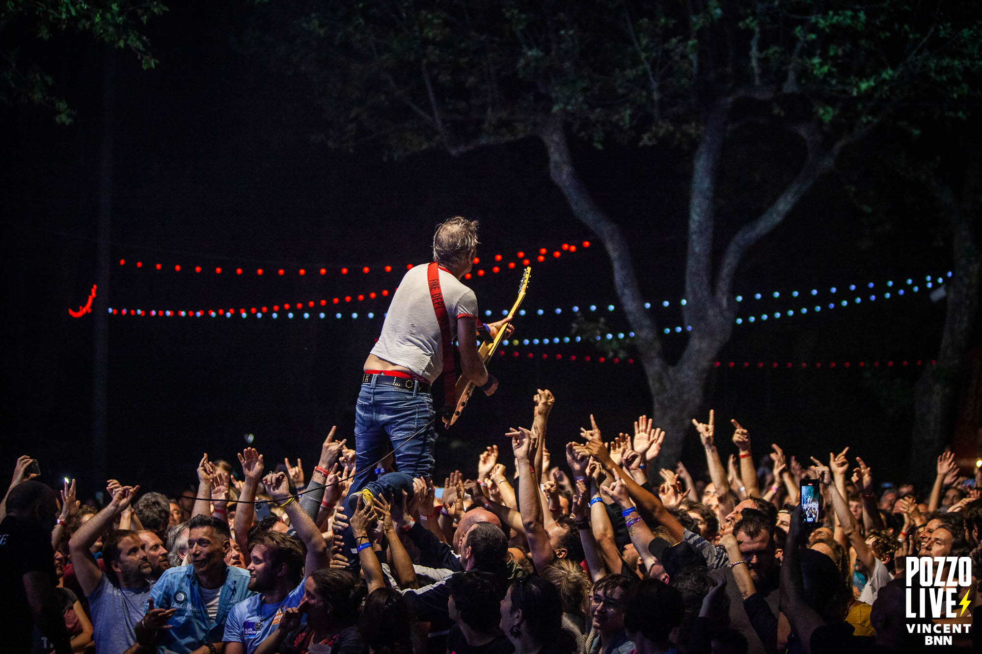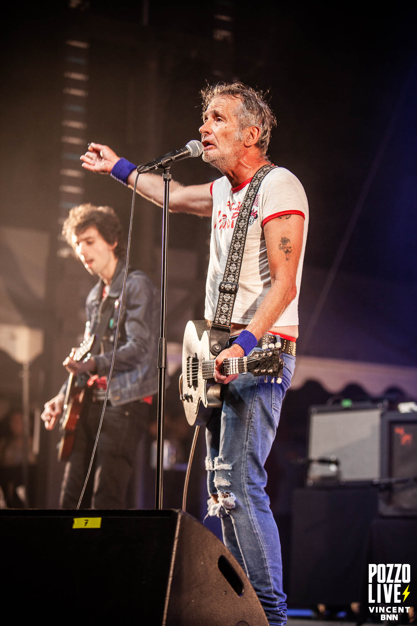 À son retour sur scène, il récupère des bottes rouges envoyées un spectateur (en référence à la chanson « Les Bottes Rouges », ndr) et continuera son concert divinement chaussé… Même si le poids des années (et des excès) se fait parfois sentir dans le chant du frontman (« Frontignan Blues », par exemple), l’homme a pris le parti de se donner corps et âme dans tous les morceaux, n’hésitant pas à escalader les amplis (« Punk Ouvrier ») ou à inviter le public (et même la section PMR) à faire un wall of death en prenant une grosse voix de meeetaaaôôÔÔL. Autant dire que les festivaliers s’en donnent à cœur-joie devant ce joyeux bordel, si bien que les fans et les familles qui découvrent ce soir Les Wampas, se retrouvent sur la même longueur d’onde. Qui plus est, dès les premiers accords de la chanson désormais classique « Manu Chao », la foule saute comme un seul homme et reprend à gorge déployée le refrain. C’est d’ailleurs à ce moment-là que sera tiré un feu d’artifice au-dessus de la scène des Voix Sonneuses. Cela ne pouvait pas mieux tomber. À partir de là, Didier sera intenable et fera des allers-retours entre le public et les planches sans aucun temps mort.