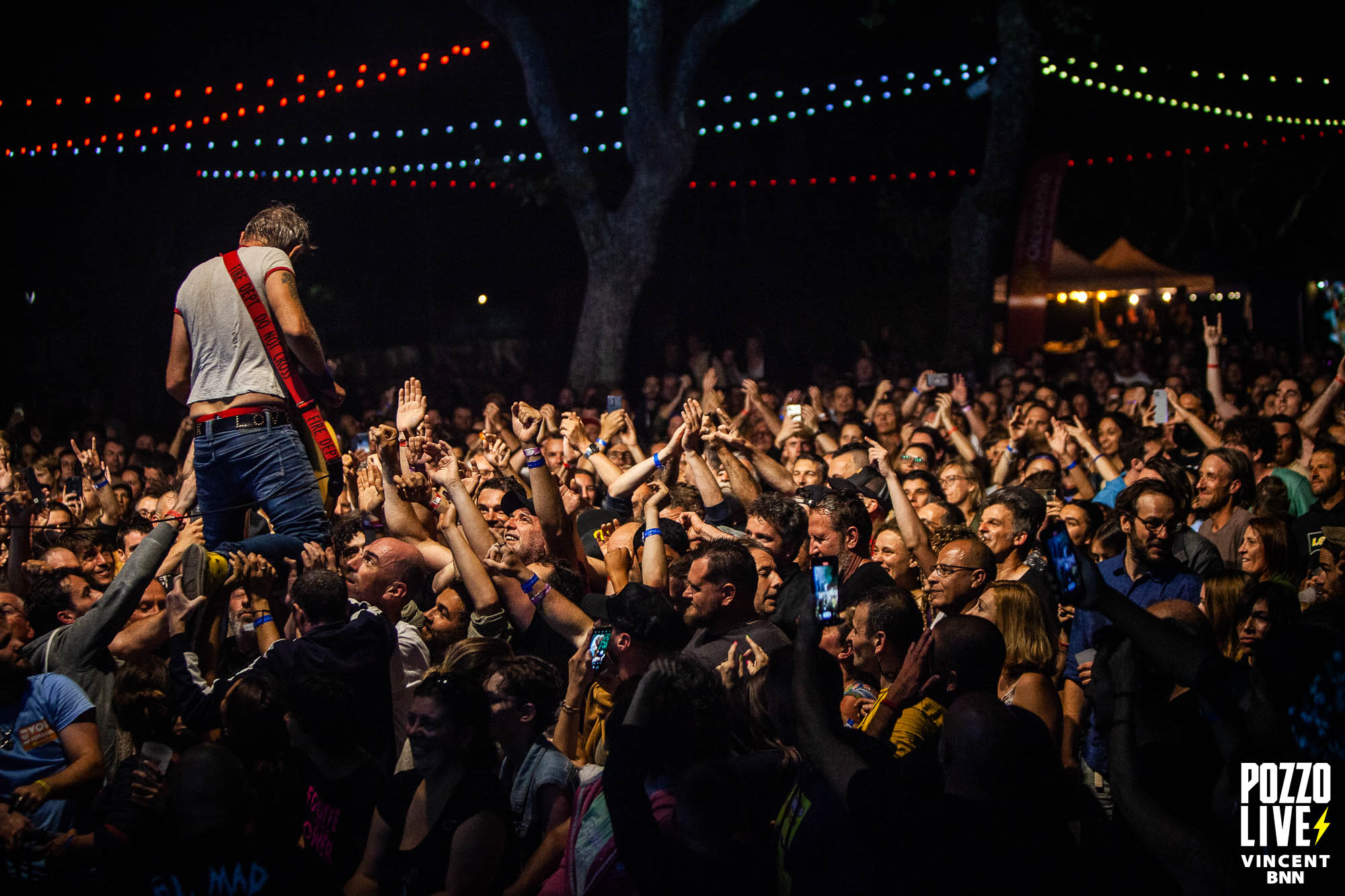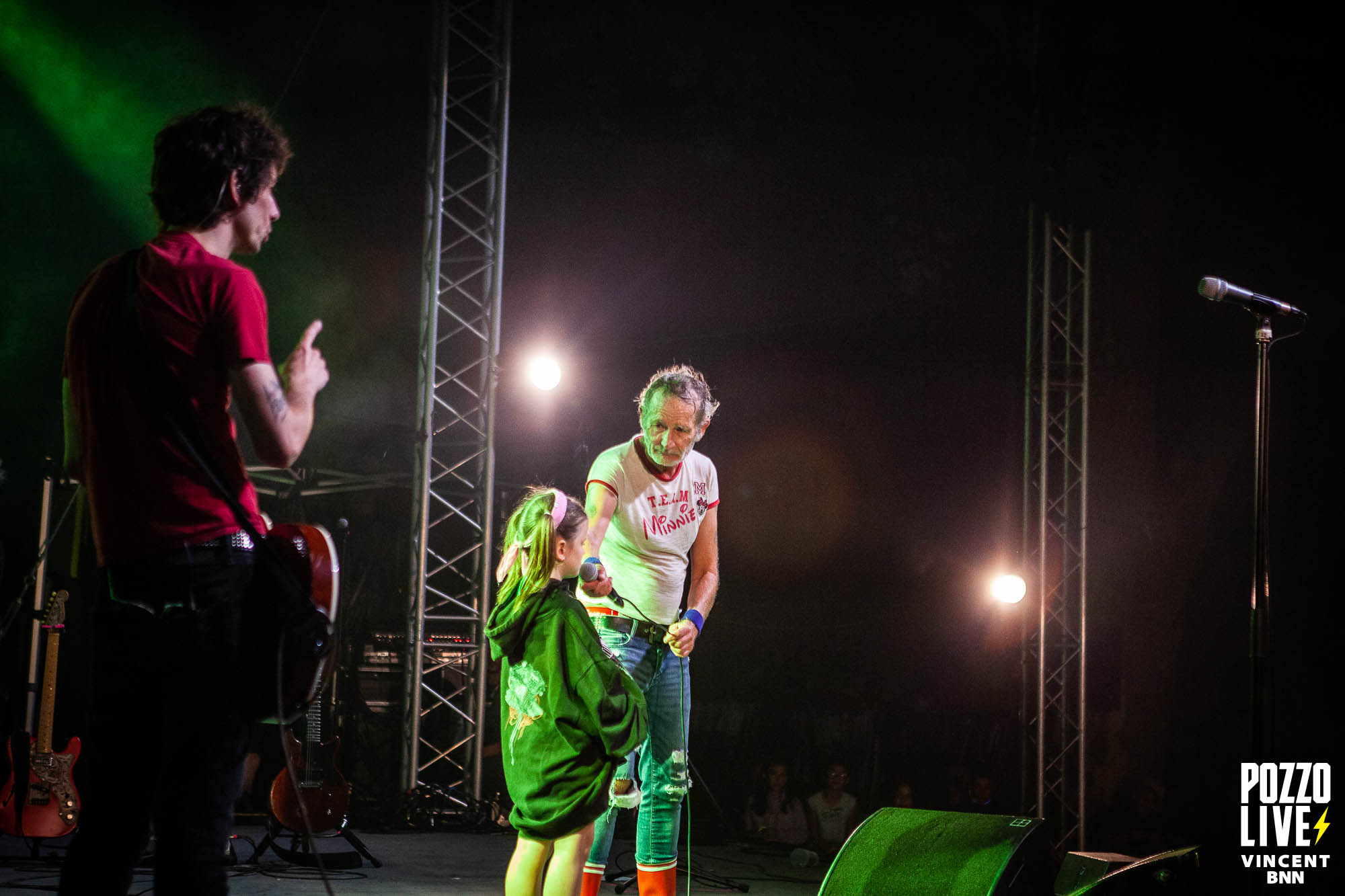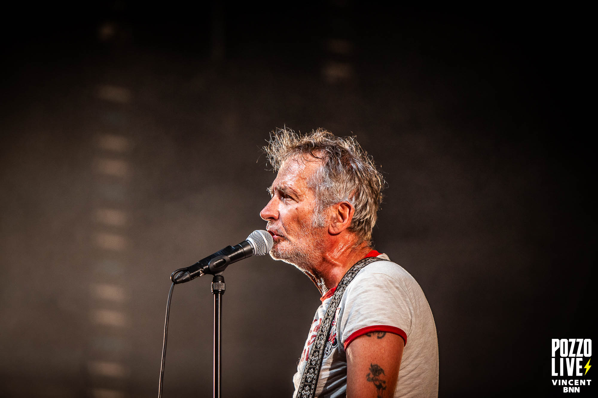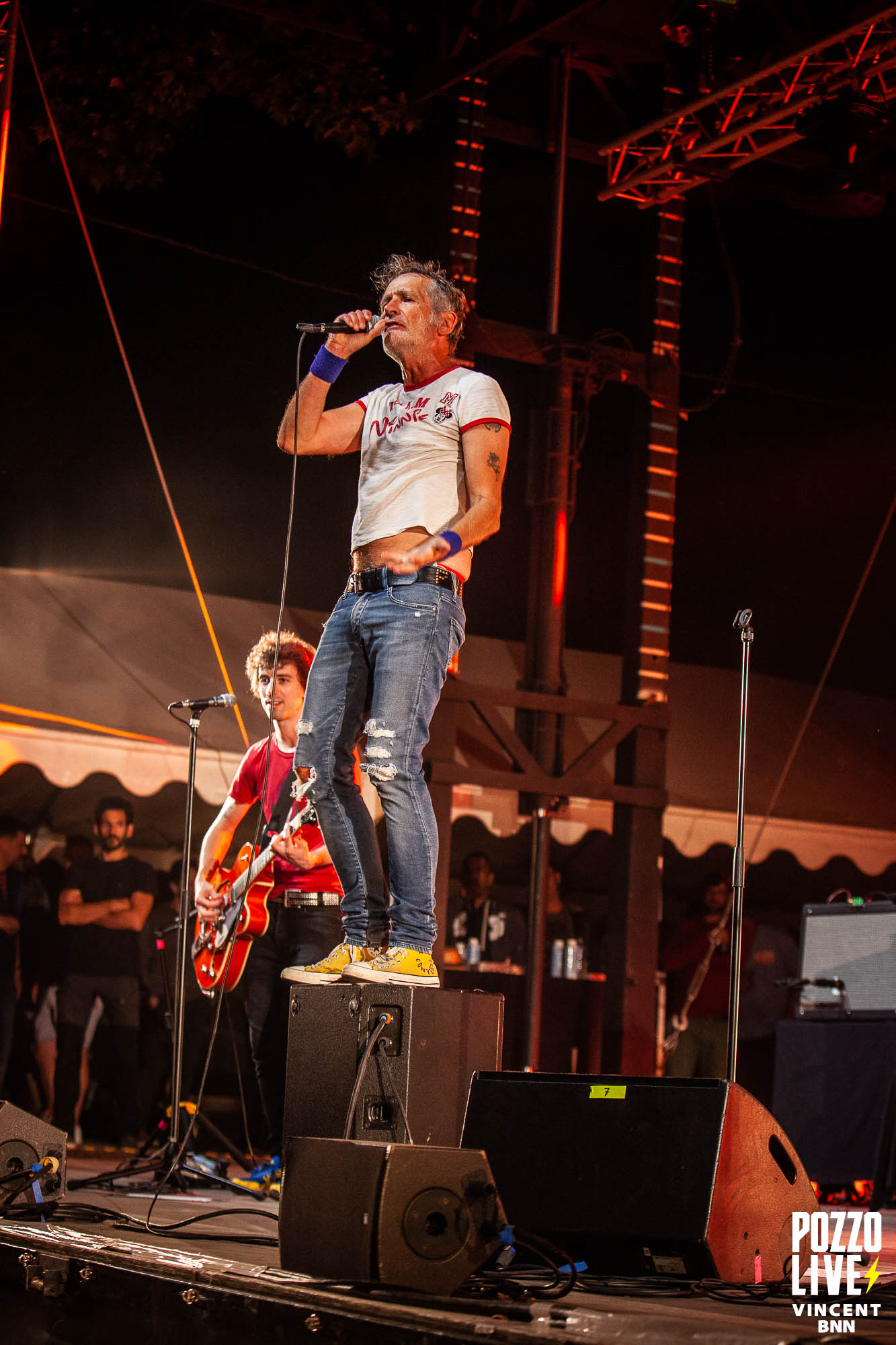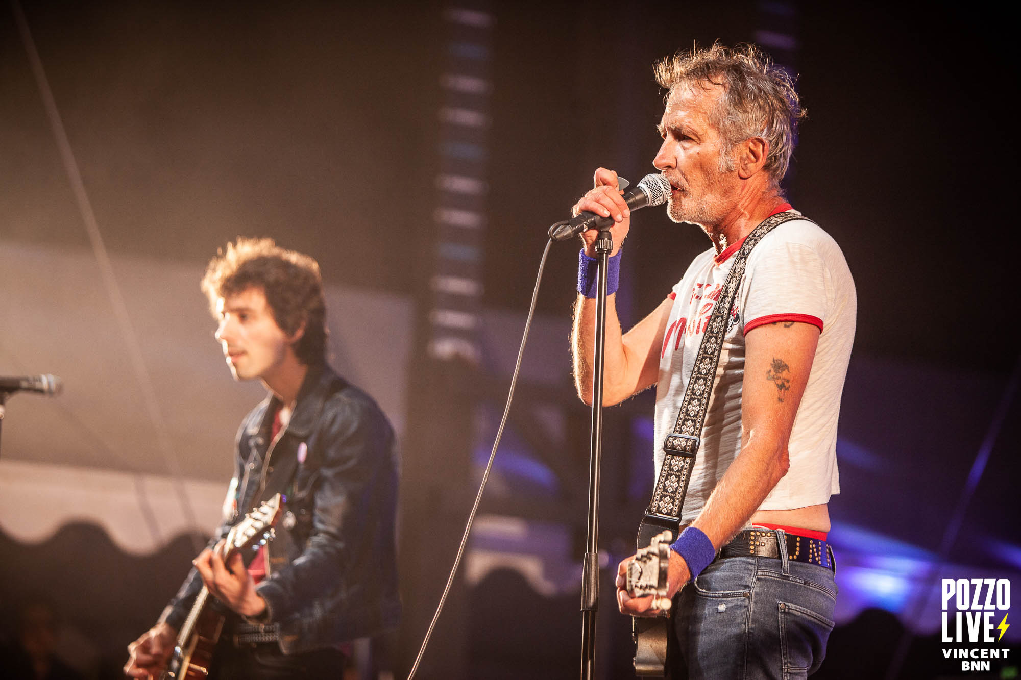 À son retour sur scène, il récupère des bottes rouges envoyées un spectateur (en référence à la chanson « Les Bottes Rouges », ndr) et continuera son concert divinement chaussé… Même si le poids des années (et des excès) se fait parfois sentir dans le chant du frontman (« Frontignan Blues », par exemple), l’homme a pris le parti de se donner corps et âme dans tous les morceaux, n’hésitant pas à escalader les amplis (« Punk Ouvrier ») ou à inviter le public (et même la section PMR) à faire un wall of death en prenant une grosse voix de meeetaaaôôÔÔL. Autant dire que les festivaliers s’en donnent à cœur-joie devant ce joyeux bordel, si bien que les fans et les familles qui découvrent ce soir Les Wampas, se retrouvent sur la même longueur d’onde. Qui plus est, dès les premiers accords de la chanson désormais classique « Manu Chao », la foule saute comme un seul homme et reprend à gorge déployée le refrain. C’est d’ailleurs à ce moment-là que sera tiré un feu d’artifice au-dessus de la scène des Voix Sonneuses. Cela ne pouvait pas mieux tomber. À partir de là, Didier sera intenable et fera des allers-retours entre le public et les planches sans aucun temps mort.