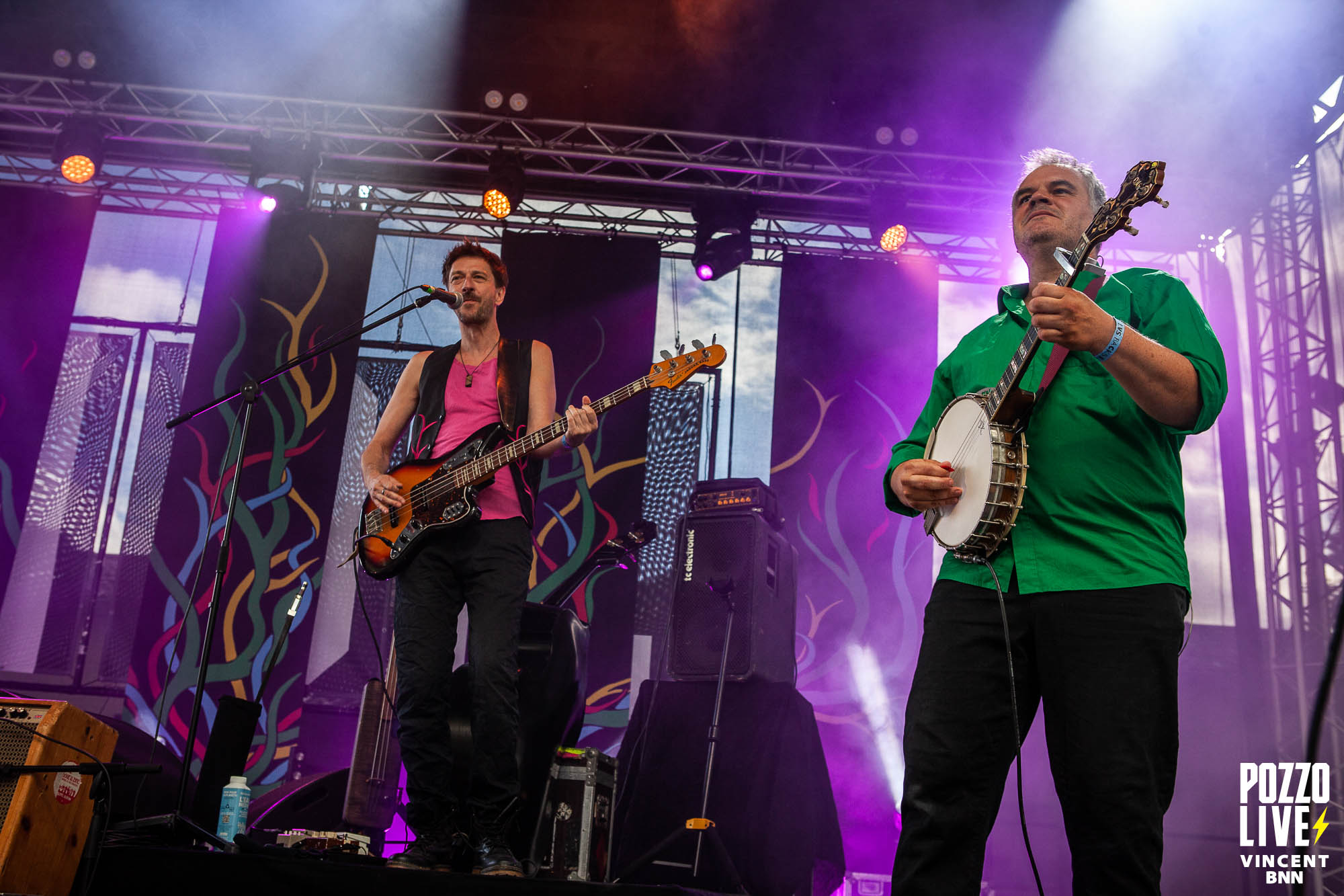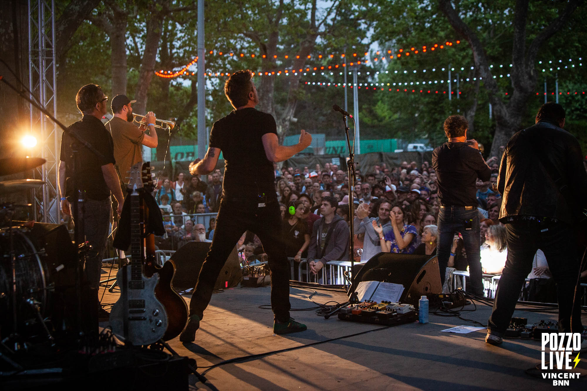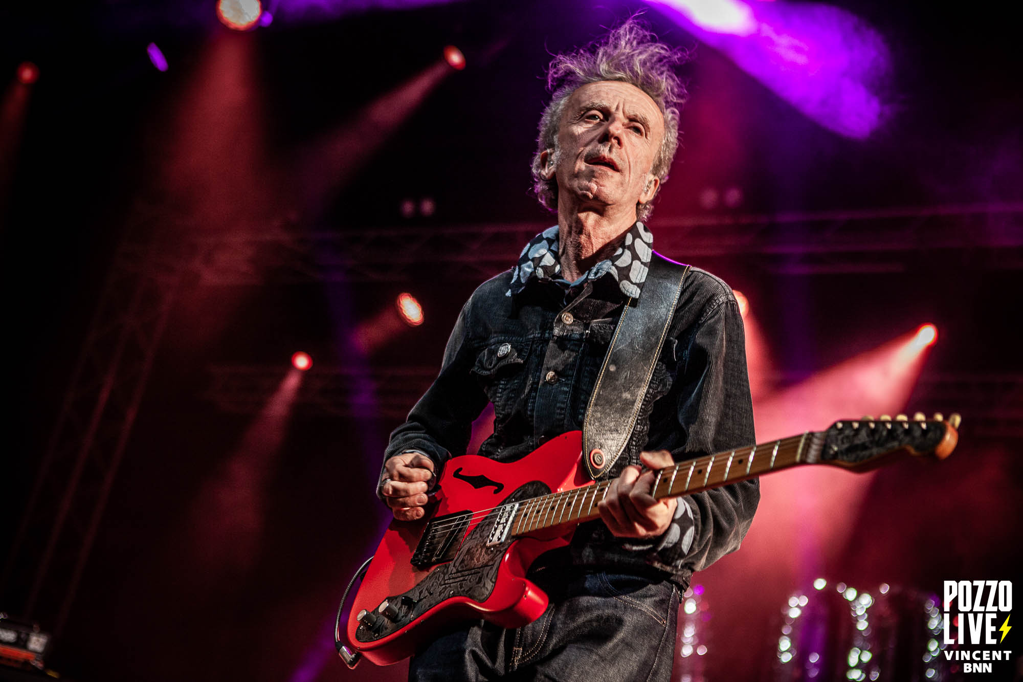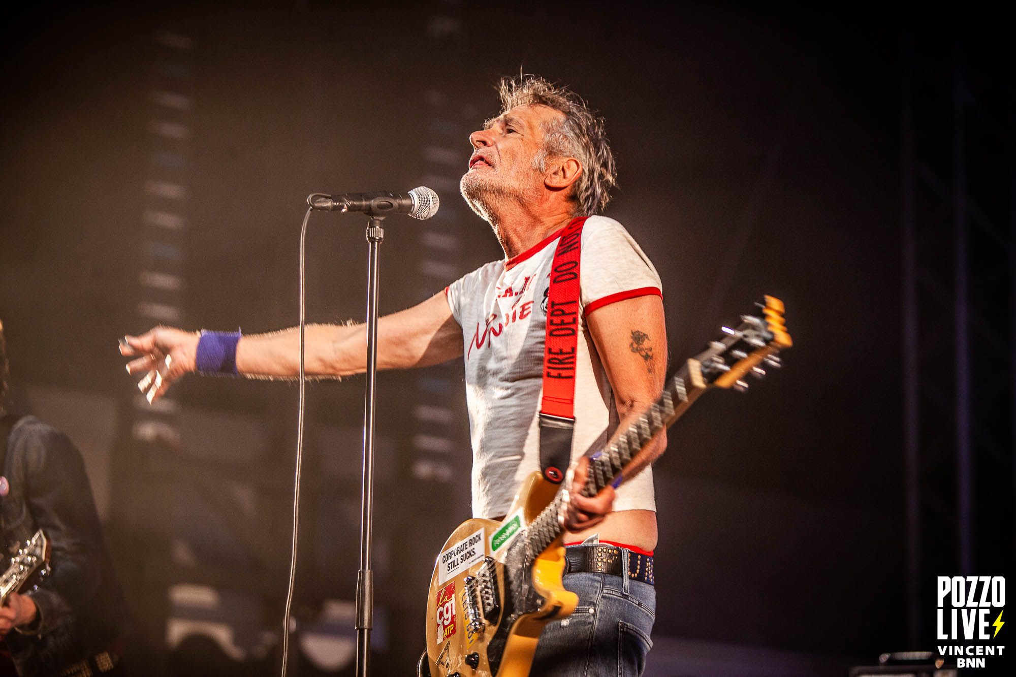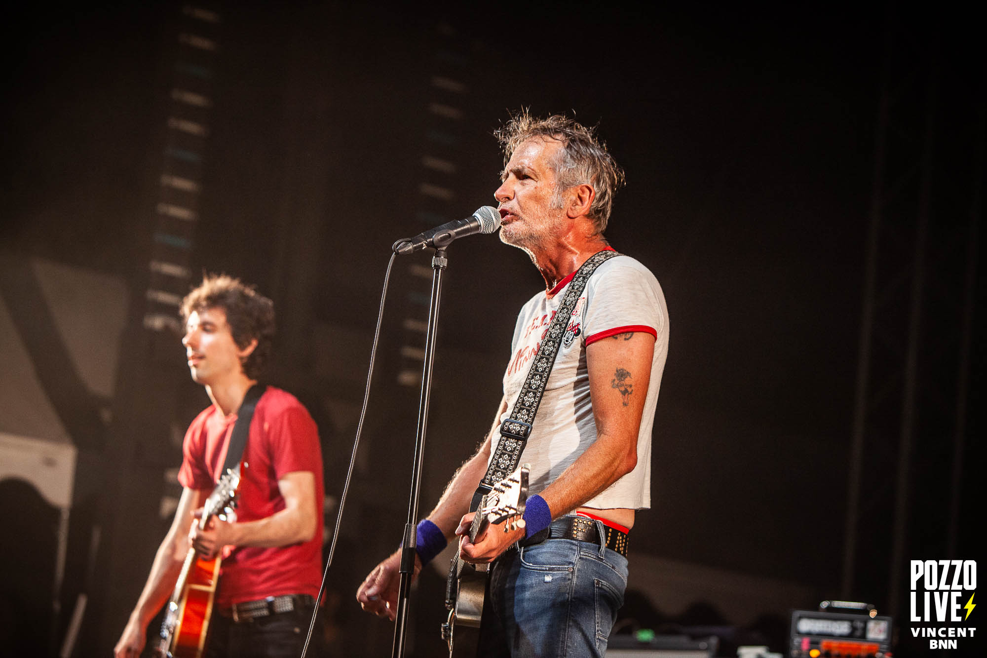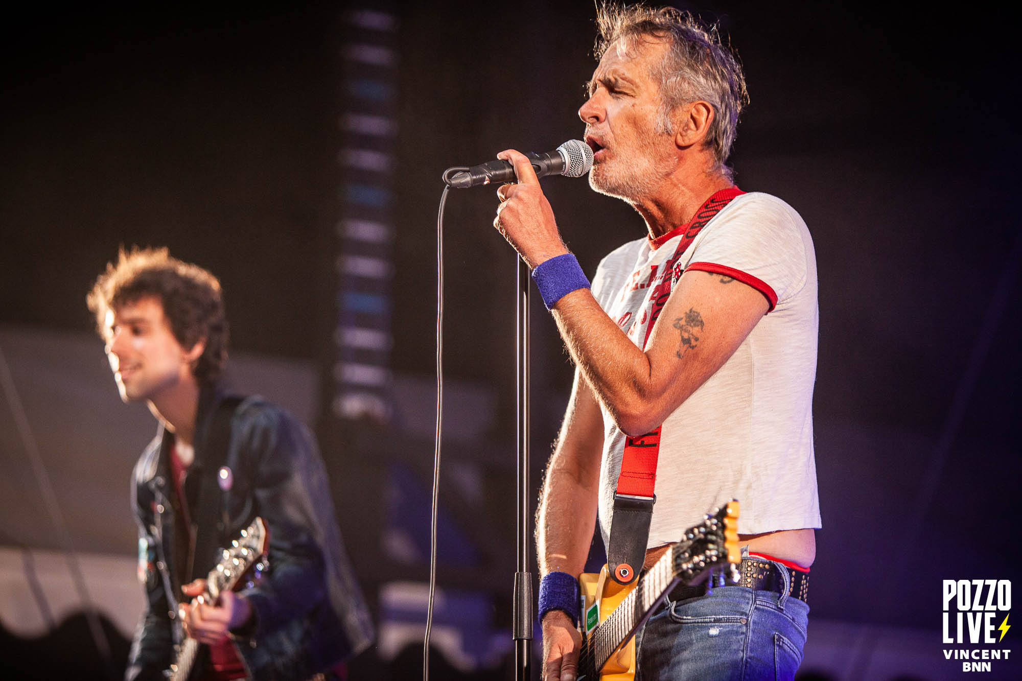 À son retour sur scène, il récupère des bottes rouges envoyées un spectateur (en référence à la chanson « Les Bottes Rouges », ndr) et continuera son concert divinement chaussé… Même si le poids des années (et des excès) se fait parfois sentir dans le chant du frontman (« Frontignan Blues », par exemple), l’homme a pris le parti de se donner corps et âme dans tous les morceaux, n’hésitant pas à escalader les amplis (« Punk Ouvrier ») ou à inviter le public (et même la section PMR) à faire un wall of death en prenant une grosse voix de meeetaaaôôÔÔL. Autant dire que les festivaliers s’en donnent à cœur-joie devant ce joyeux bordel, si bien que les fans et les familles qui découvrent ce soir Les Wampas, se retrouvent sur la même longueur d’onde. Qui plus est, dès les premiers accords de la chanson désormais classique « Manu Chao », la foule saute comme un seul homme et reprend à gorge déployée le refrain. C’est d’ailleurs à ce moment-là que sera tiré un feu d’artifice au-dessus de la scène des Voix Sonneuses. Cela ne pouvait pas mieux tomber. À partir de là, Didier sera intenable et fera des allers-retours entre le public et les planches sans aucun temps mort.