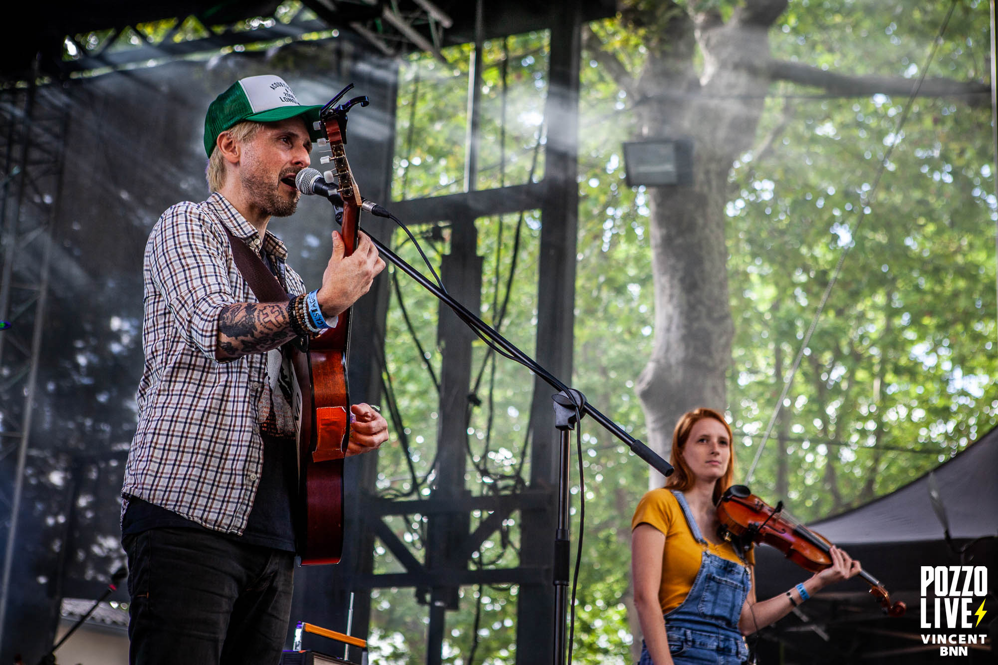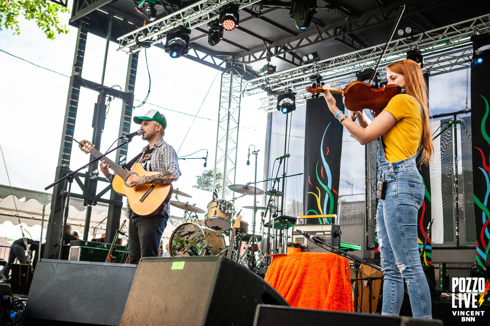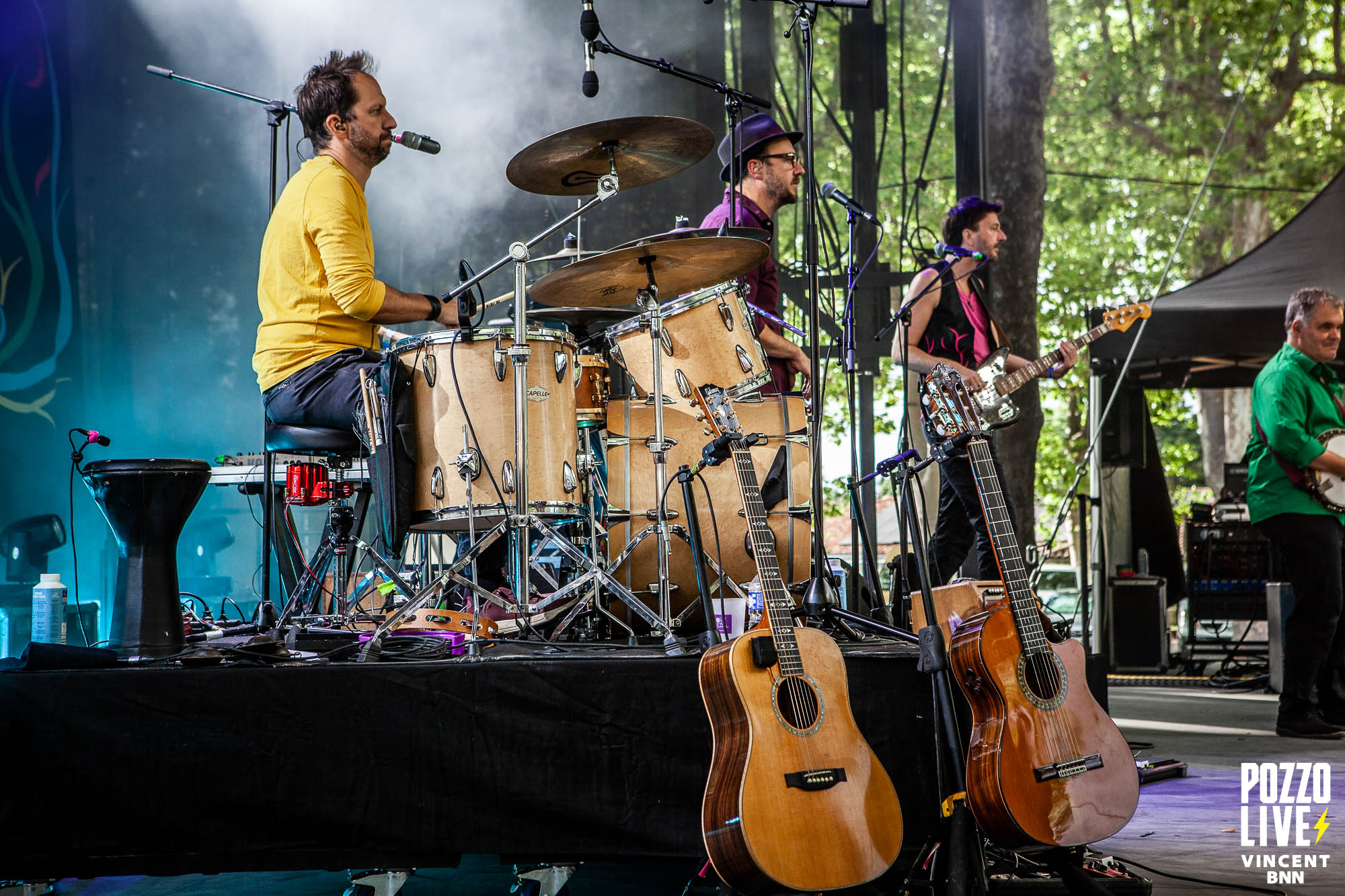 Mais ce soir, DSLZ n’est pas là pour le jeune public mais bel et bien pour donner à l’audience des Voix Sonneuses un étalage de sa musique qui transcende les étiquettes musicales. Ainsi, quand le combo envoie d’entrée de jeu « L’Orage », le morceau fait mouche avec son rock agréable qui laisse la part belle aux mélodies et qui permet ainsi aux festivaliers de se mettre dans le bain, en douceur. Alternant les instruments en fonction des styles musicaux mis en avant, les musiciens de Debout Sur Le Zinc apportent sur un plateau une véritable invitation au voyage aux festivaliers qui découvrent toute la palette mélodique du groupe dans ce set. De fait, DSLZ n’hésite pas à mettre en avant des chansons incisives (« Passe Me Voir», « Plus Rien À Perdre ») ou plus intimistes (« Petite Pause ») avec des parties plus dansantes qui flirtent parfois vers le folk celtique et la musique orientale (« L’invisible »). Et le moins que l’on puisse dire, c’est que ce parti pris est payant car le public répond positivement à la musique de Debout Sur Le Zinc, si bien qu’on voir des couples danser ici et là.