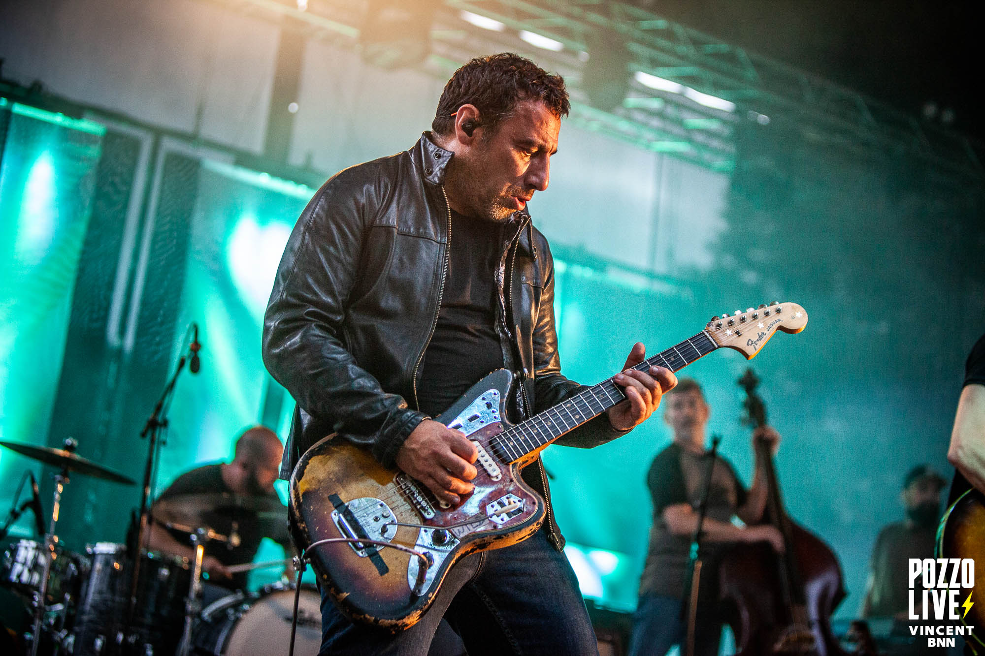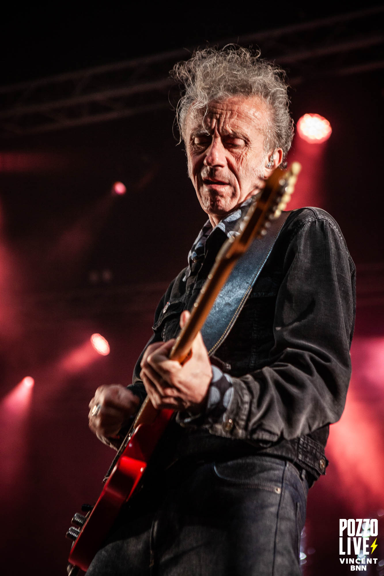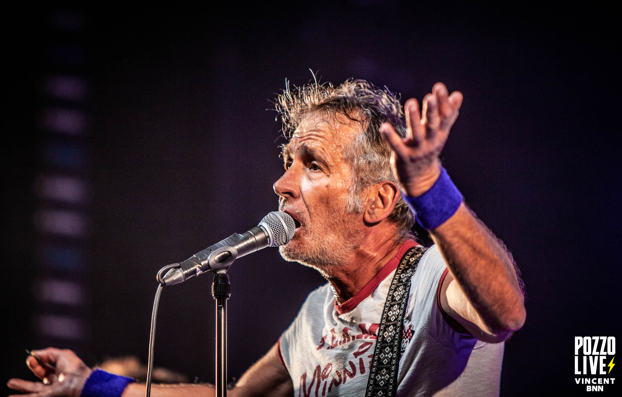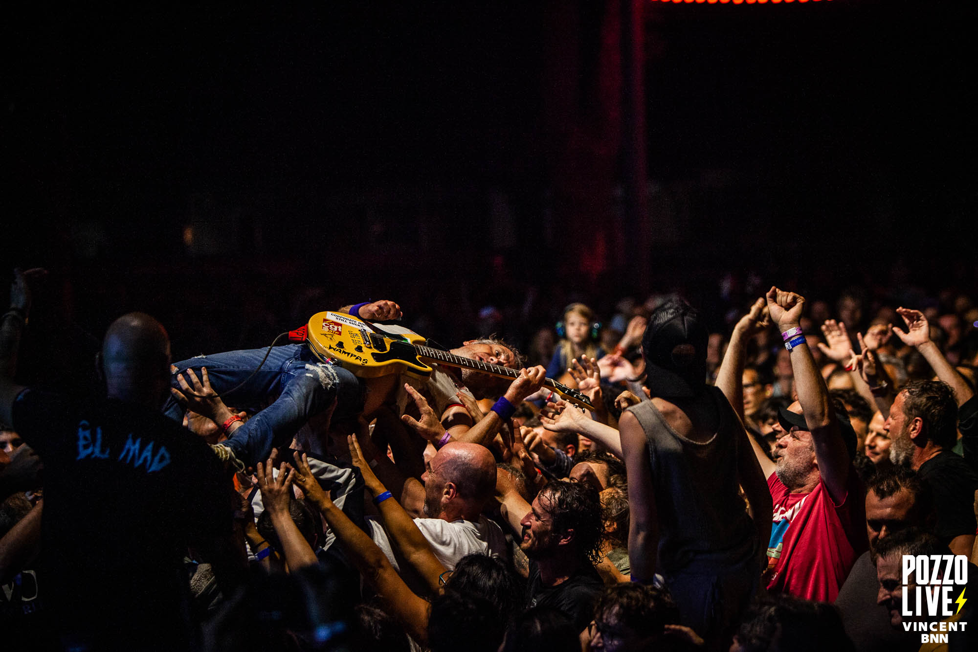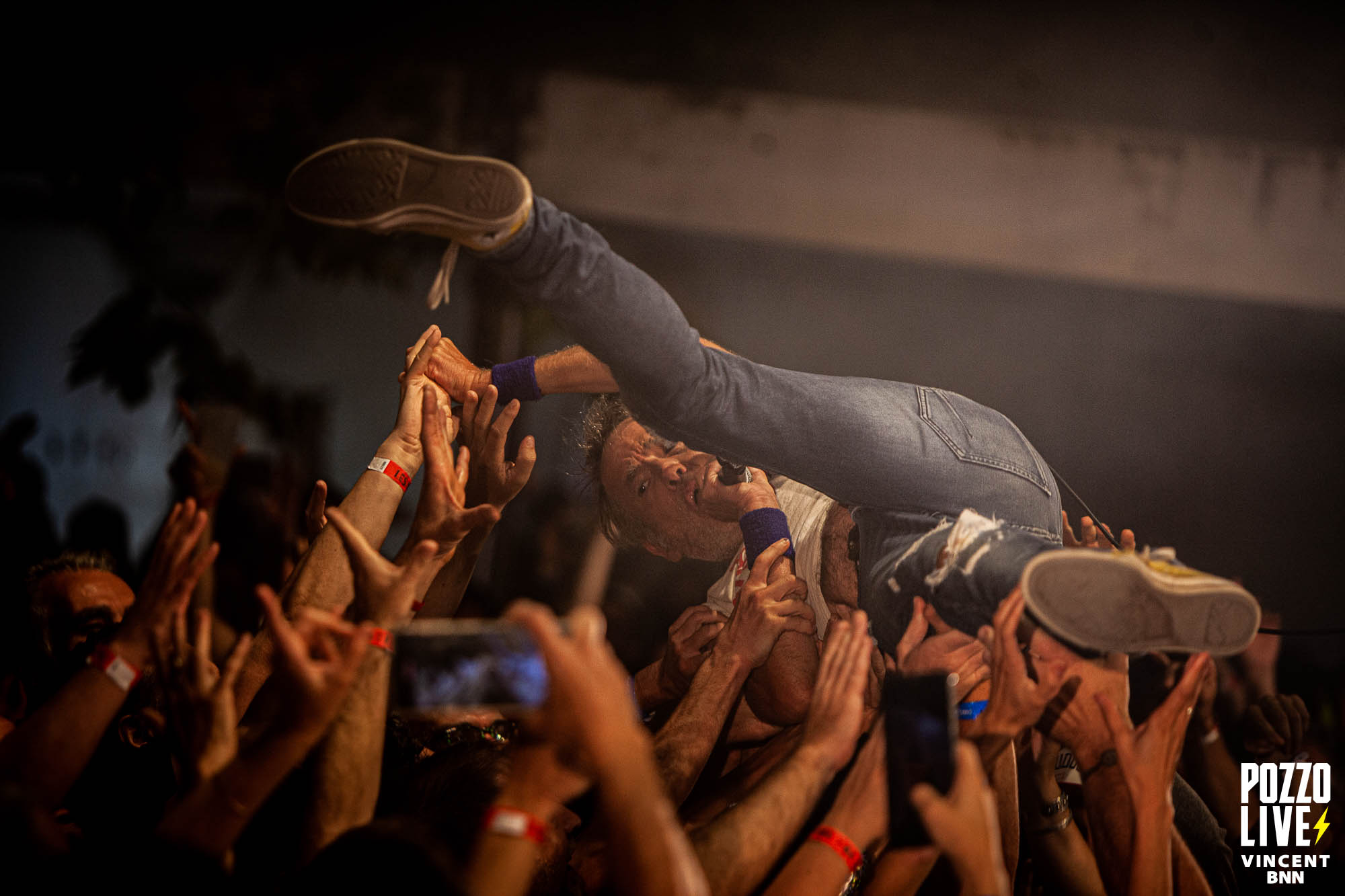 Fort d’un nouvel album en poche, Tempête, Tempête sorti le 30 septembre 2022 chez Verycords, le groupe est en pleine promotion au travers de quelques dates depuis octobre et est déjà bien rôdé. De fait, dès l’opener « Sauver Le Monde » enchaîné avec « Tempête, Tempête », l’ami Didier monte vite en puissance derrière le micro et n’hésite pas à se rapprocher du public via l’avancée de la scène pour faire monter la pression ! Dans le pit, l’ambiance monte d’un cran et les barrières commencent à sacrément bouger, notamment sur les premières notes du terrible « C’est L’Amour » repris en chœur par tous les fans. Il n’en fallait pas moins pour que le chanteur passe à l’attaque et se jette dans le public pour slammer !