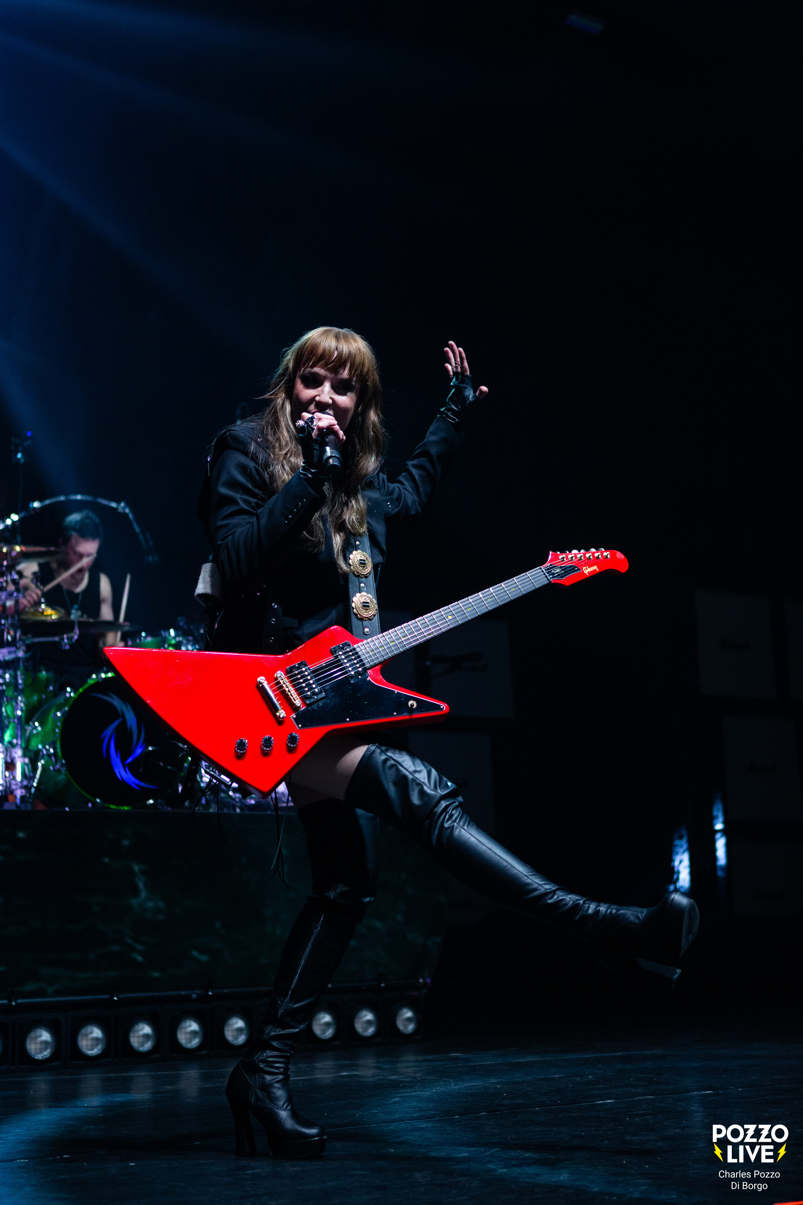 C’est au tour des américains de Halestorm d’entrée sur la mythique scène de l’Olympia. Un drap blanc a été déployé, cachant la scène. Le groupe fait son entrée avec des jeux d’ombres sur le rideau. Puis ce dernier tombe dévoilant les musiciens qui démarrent Fallen Star.