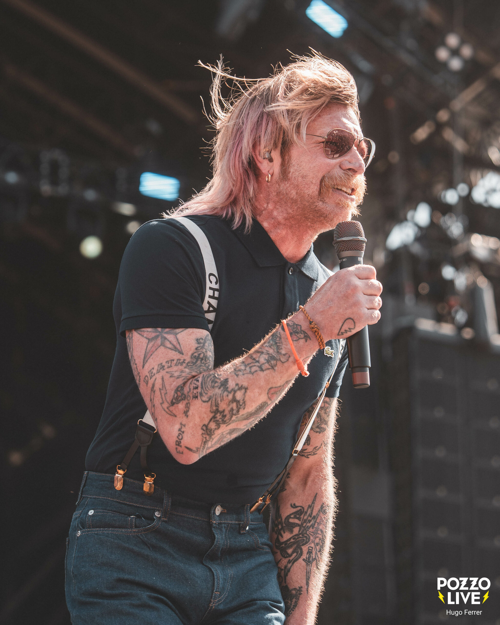 Bien que j’adore Eagles Of Death Metal, je ne pensais pas les mettre dans mes coups de cœur pour autant. Mais il s’est passé quelque chose d’assez dingue dès le début de ce concert. Après une entrée de scène sur We Are Family des Sister Sledge, Jesse Hughes, leader du groupe, commence un discours sur l’amour, le présentant comme la seule solution à tous nos problèmes. Un discours fort qui résonne d’autant plus en France, 10 ans après les terribles attaques du Bataclan qui l’ont ciblés. Suite à ce discours, il descendra dans le public pour faire des câlins et des bisous aux fans du premiers rangs. Et aussi simple que cela puisse paraître, ça m’a ému aux larmes. On voyait toute la sincérité de Jesse Hughes dans son sourire, heureux d’être debout sur cette scène, heureux d’être encore là, heureux que le public français l’ai pardonné. Après des dernières années difficiles, il semble avoir eu le déclic dont il avait besoin, et être en paix avec lui même. Le voir ainsi était fort, et ce beau message d’amour délivré a fait du bien. Peace, Love, Death Metal !