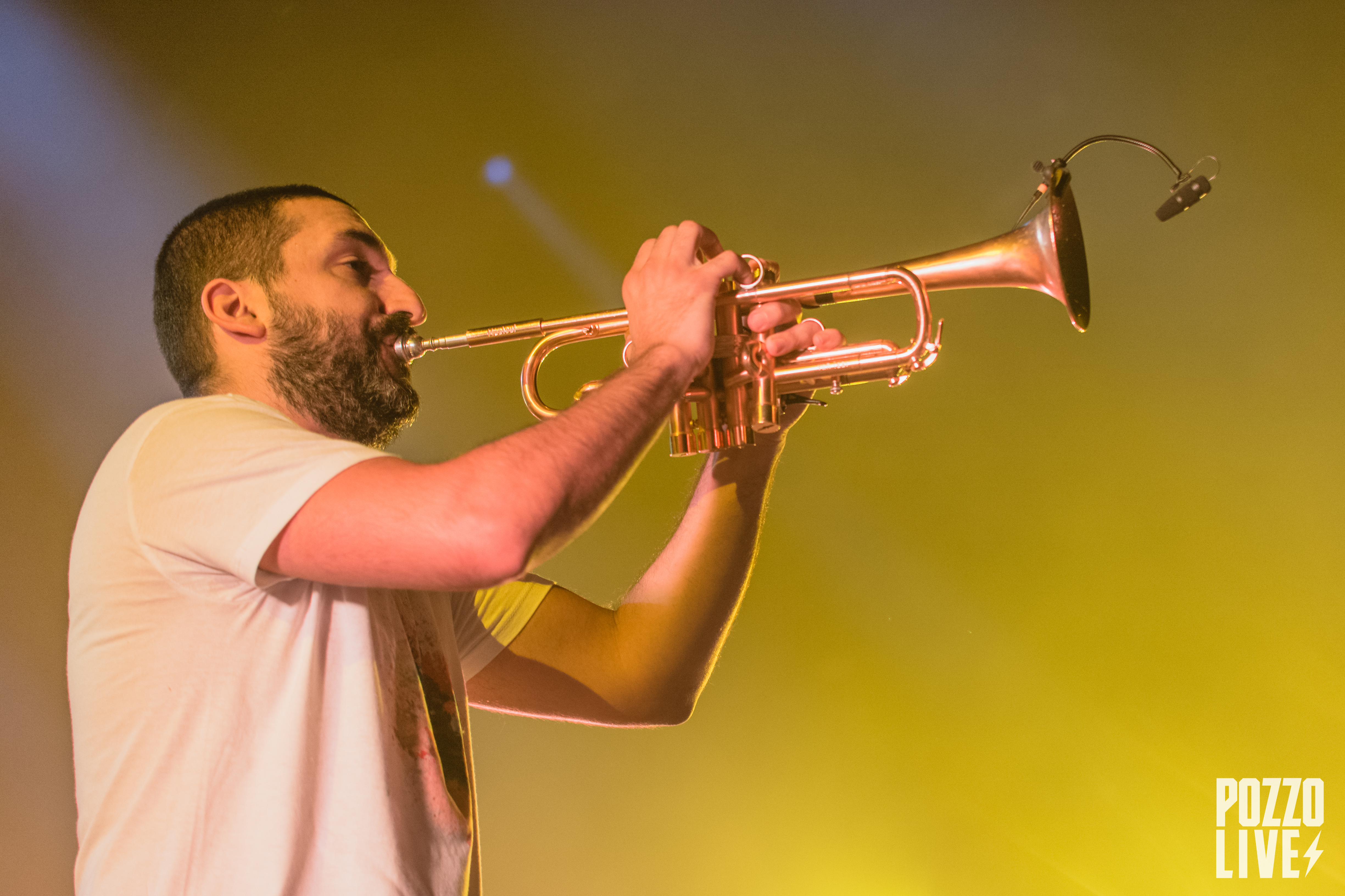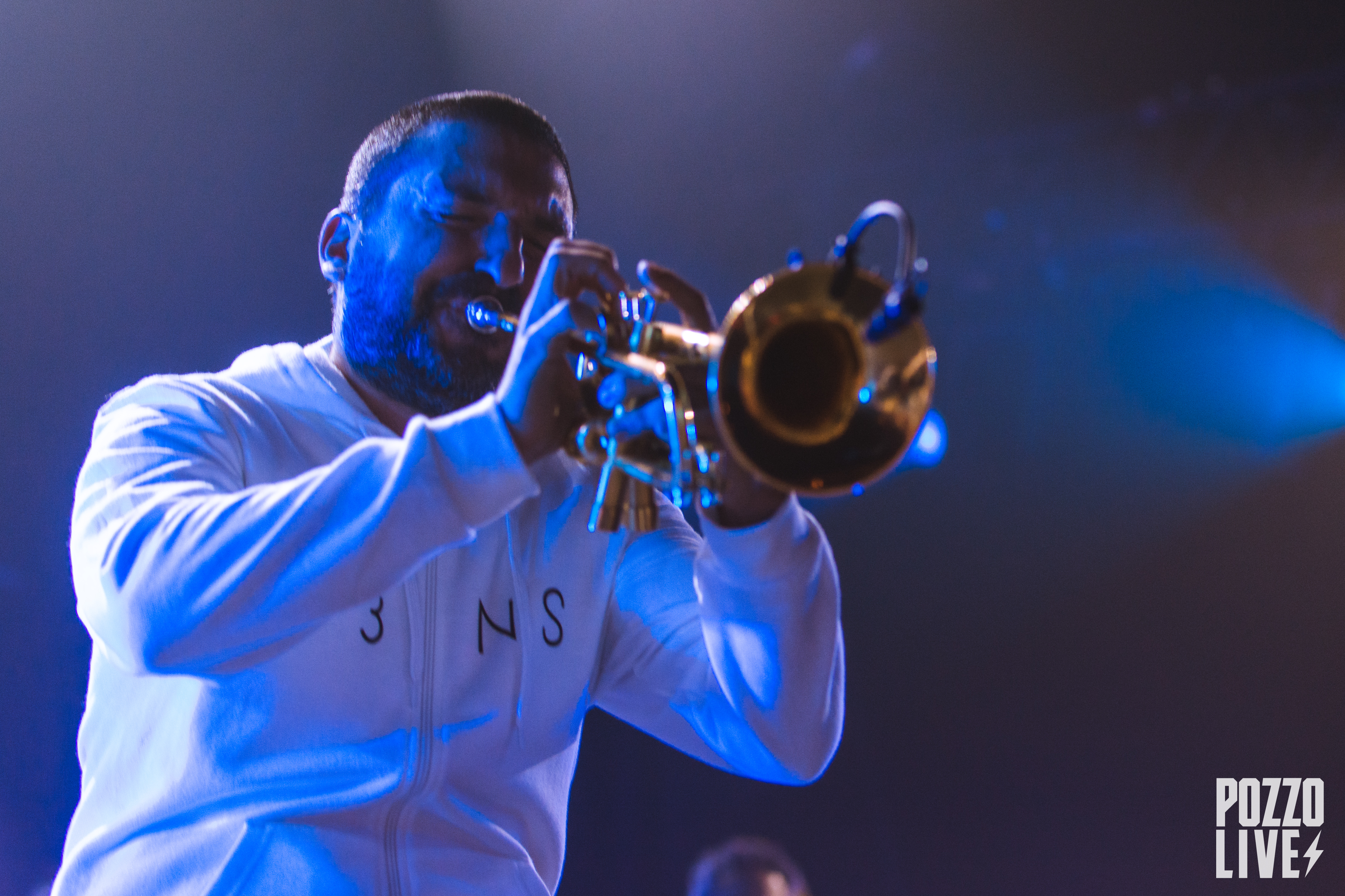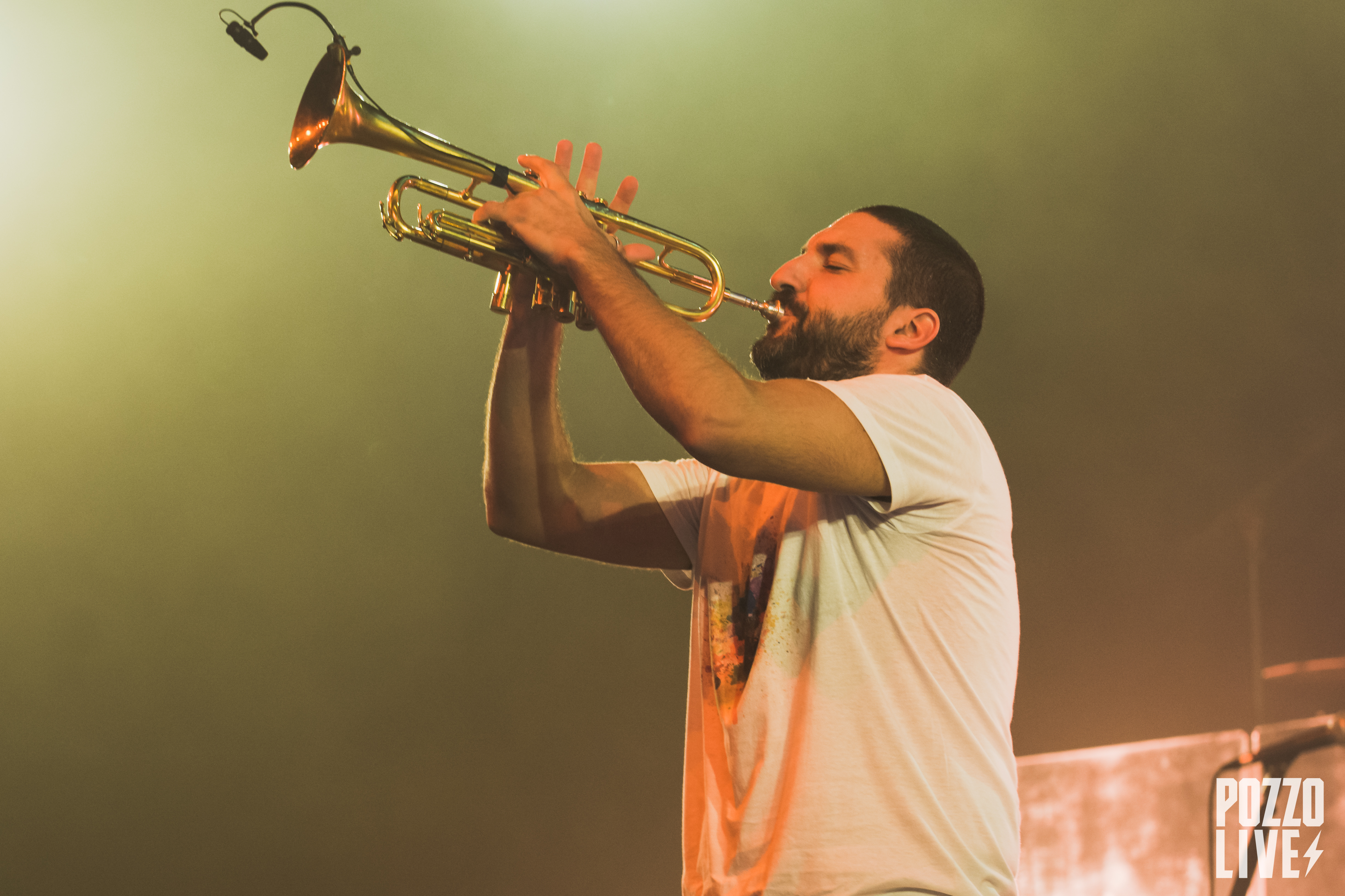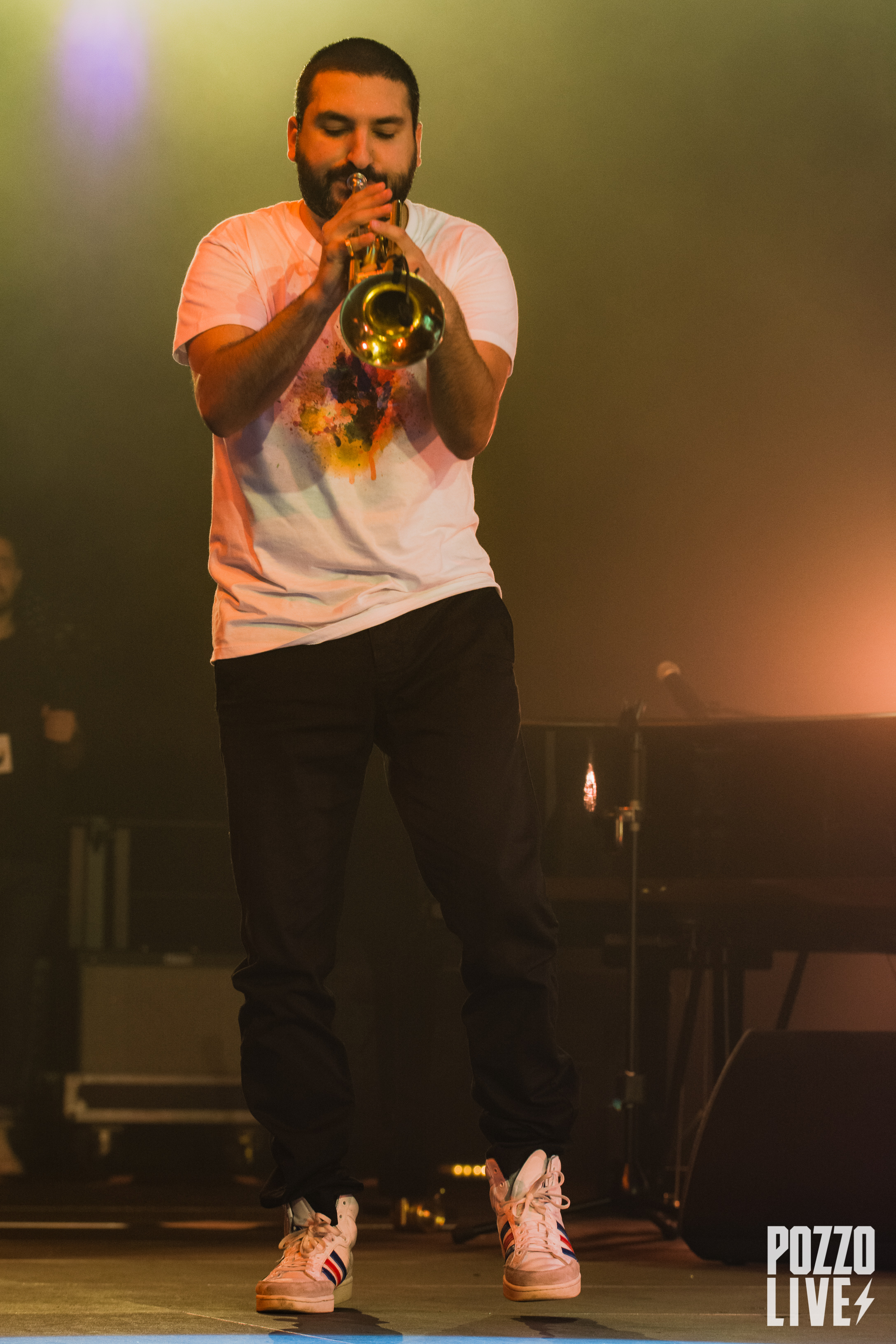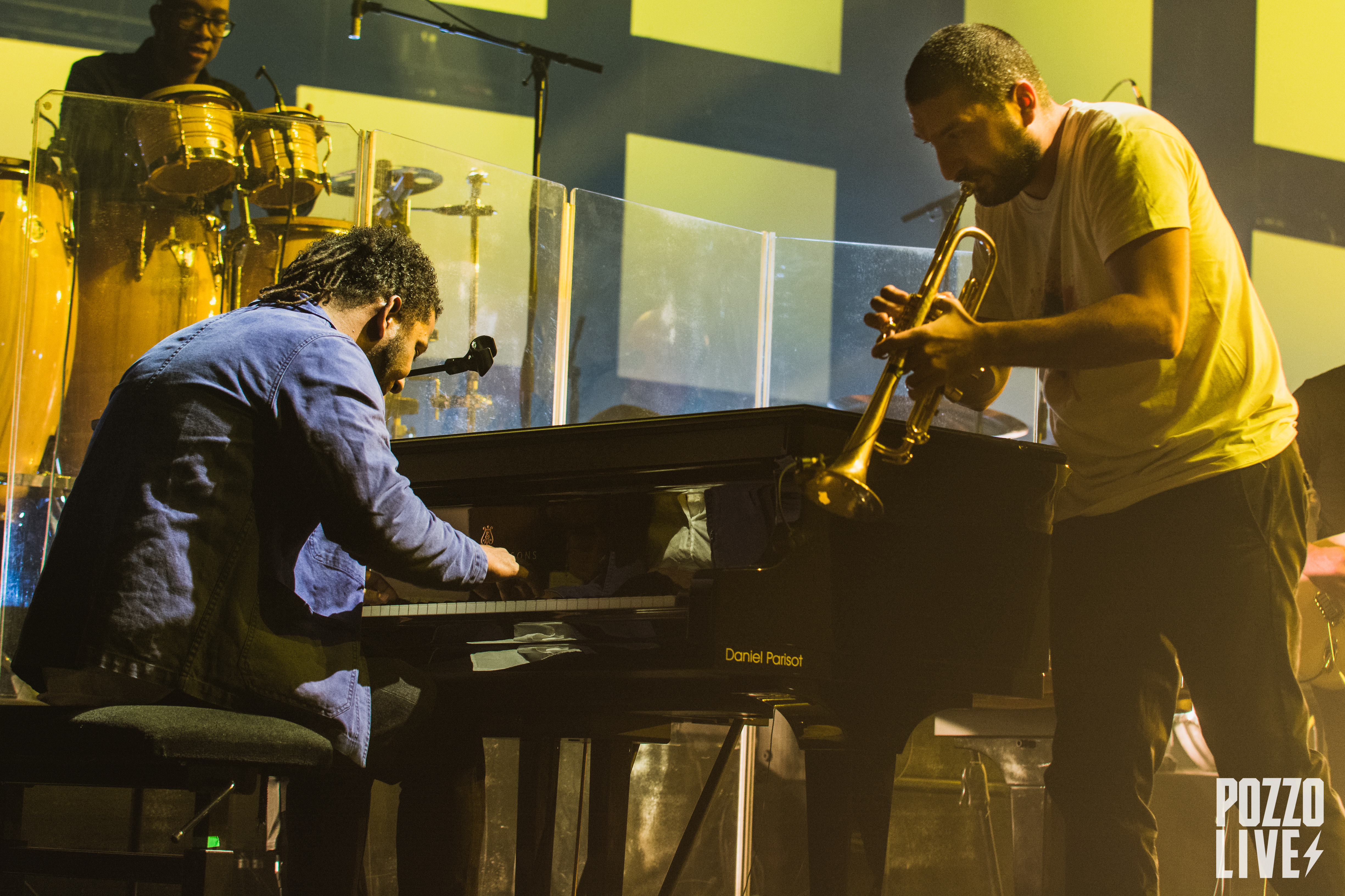 20h45, les musiciens entrent en scène. Un brass band de 6 cuivres et un percussionniste viennent compléter le groupe habituel (pianoguitarebasse et batterie). Ibrahim entre en scène trompette à la main, et c’est parti pour 2h de concert dantesque!