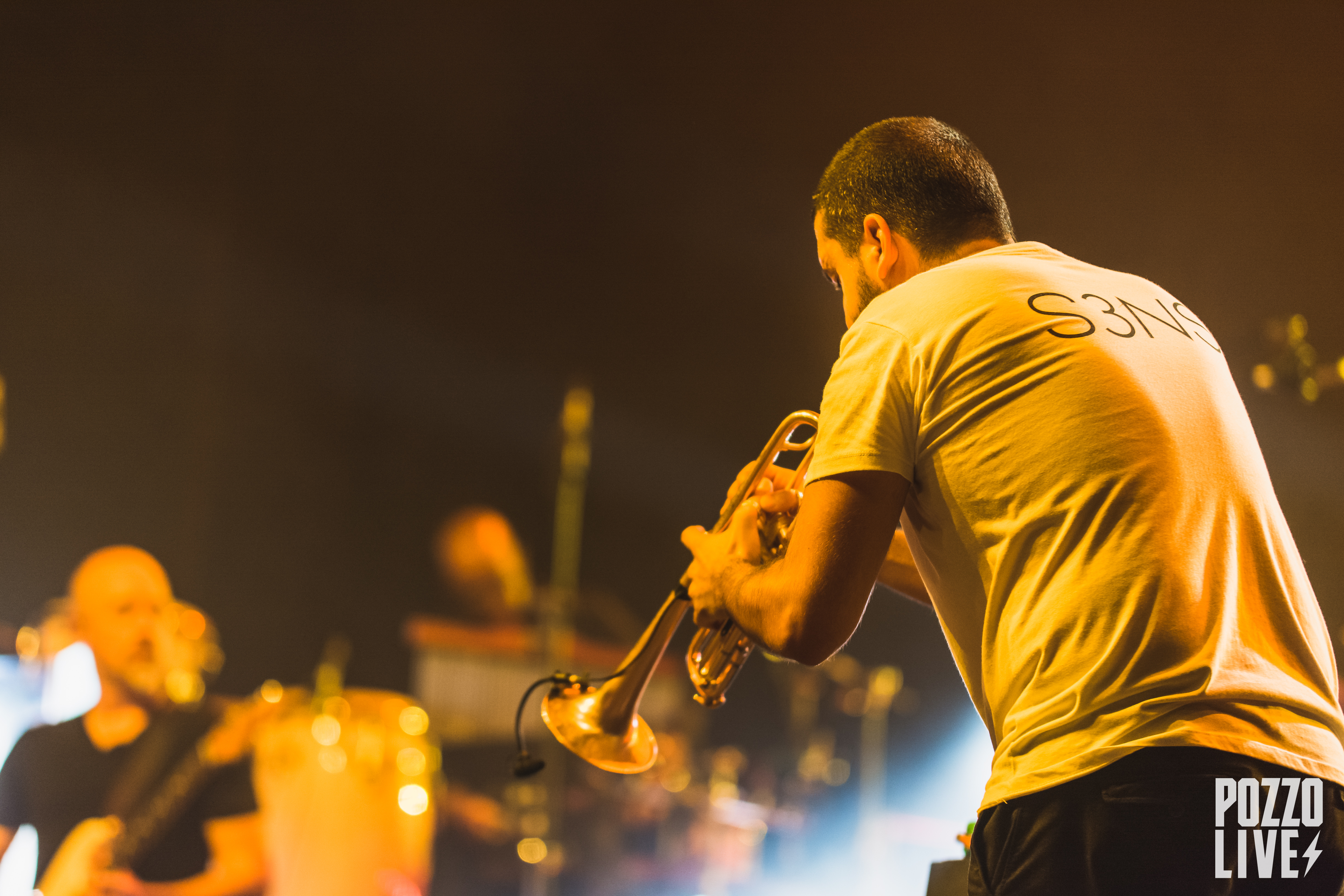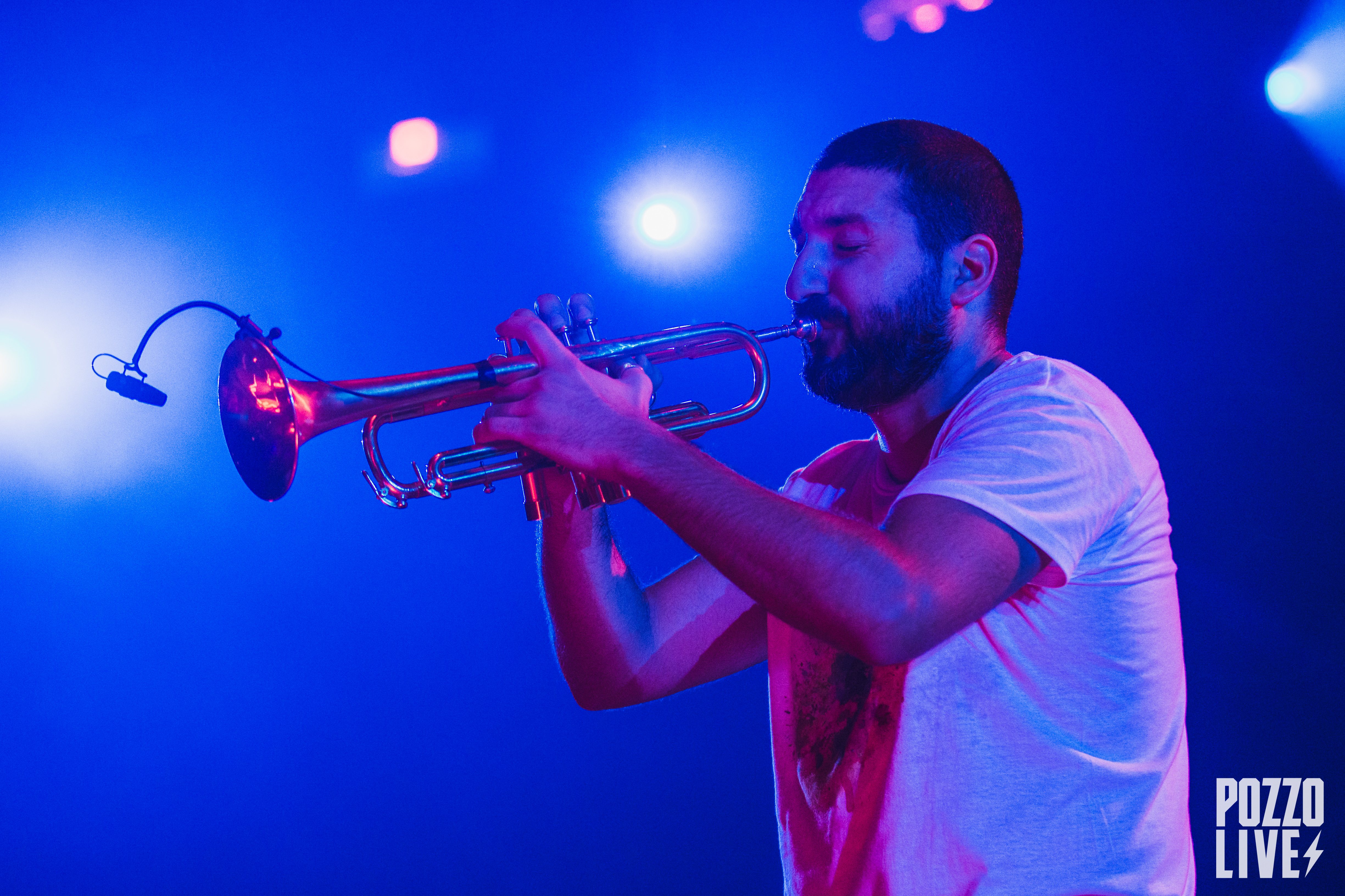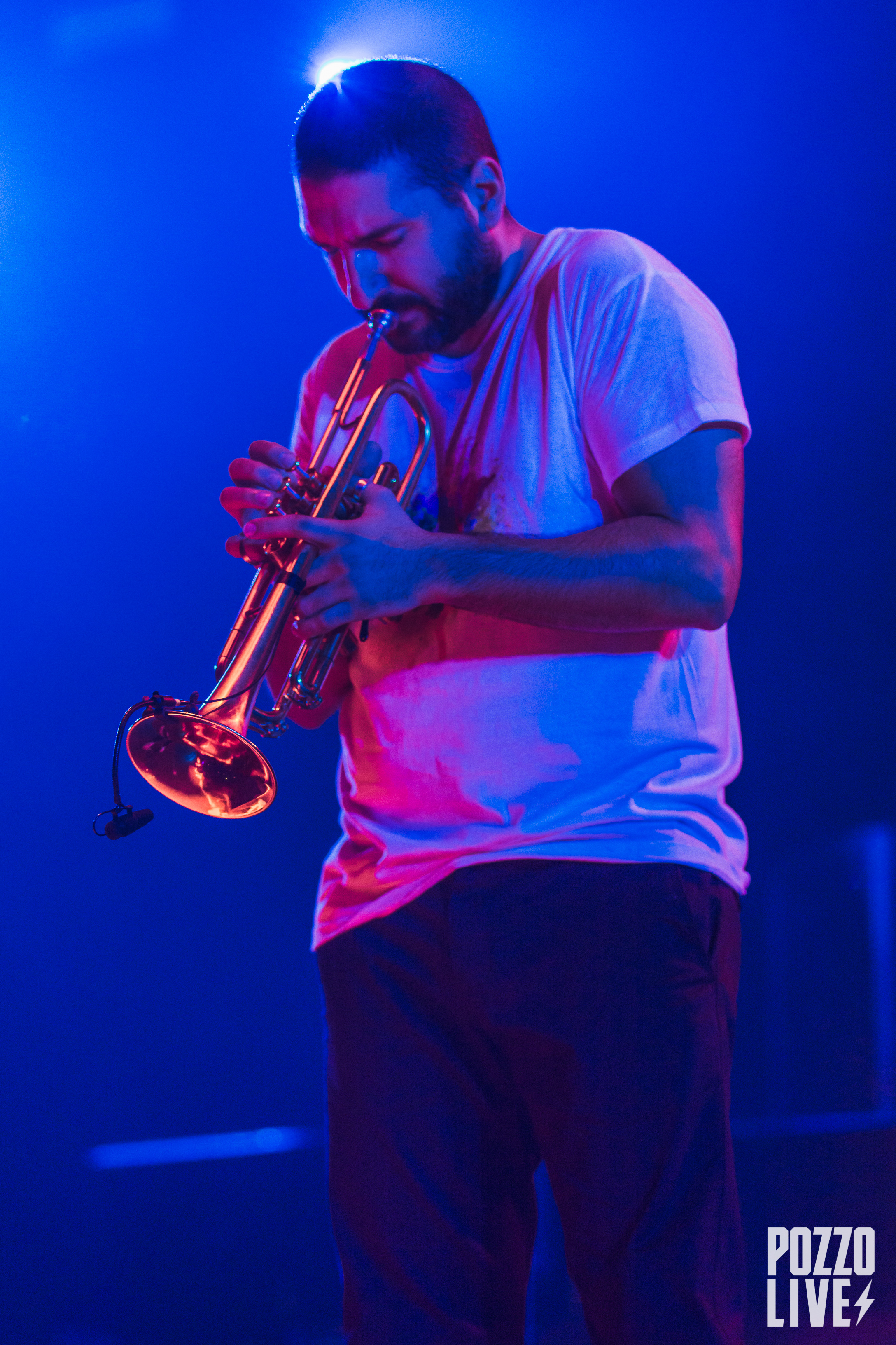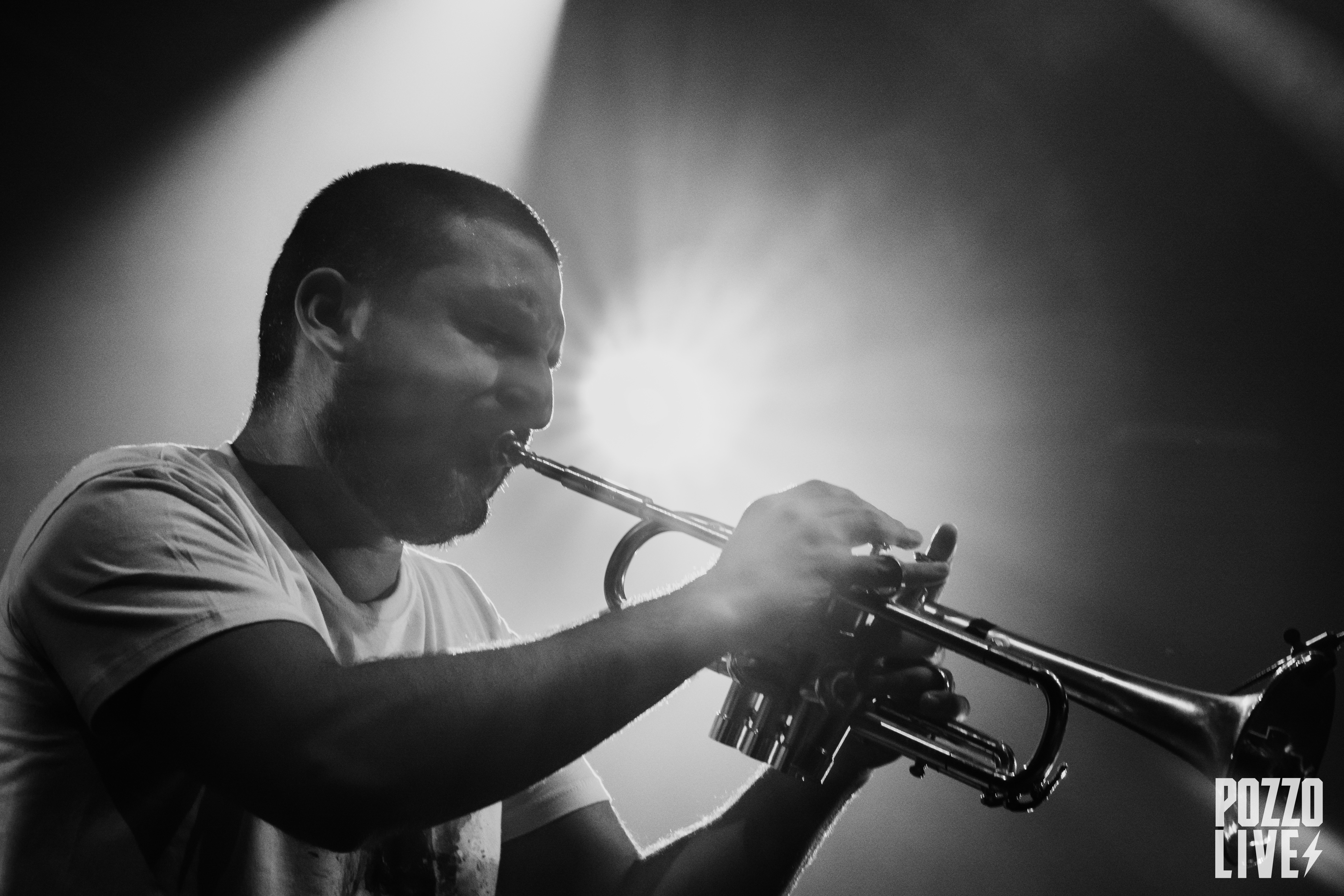 20h45, les musiciens entrent en scène. Un brass band de 6 cuivres et un percussionniste viennent compléter le groupe habituel (pianoguitarebasse et batterie). Ibrahim entre en scène trompette à la main, et c’est parti pour 2h de concert dantesque!