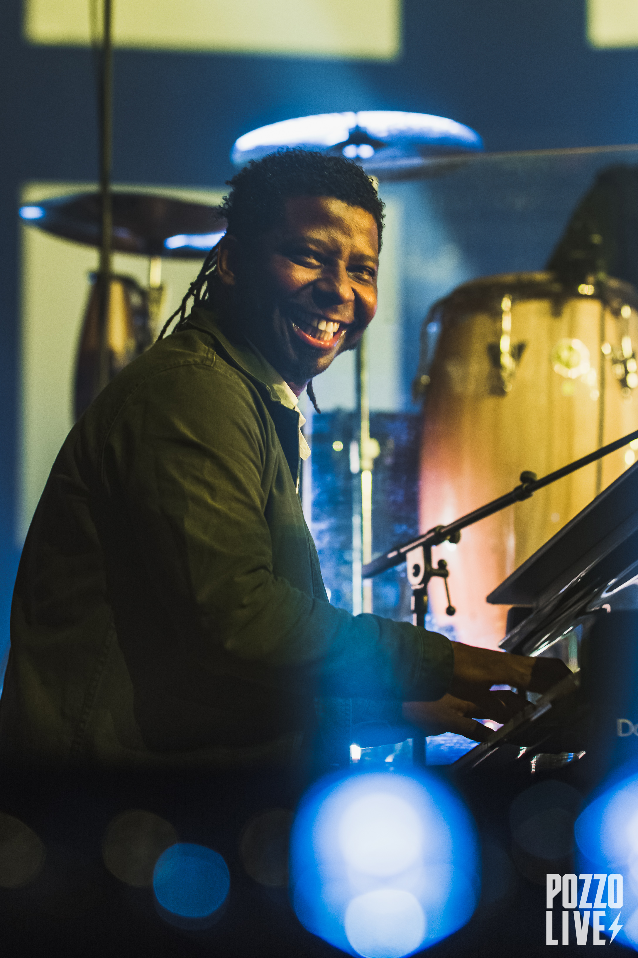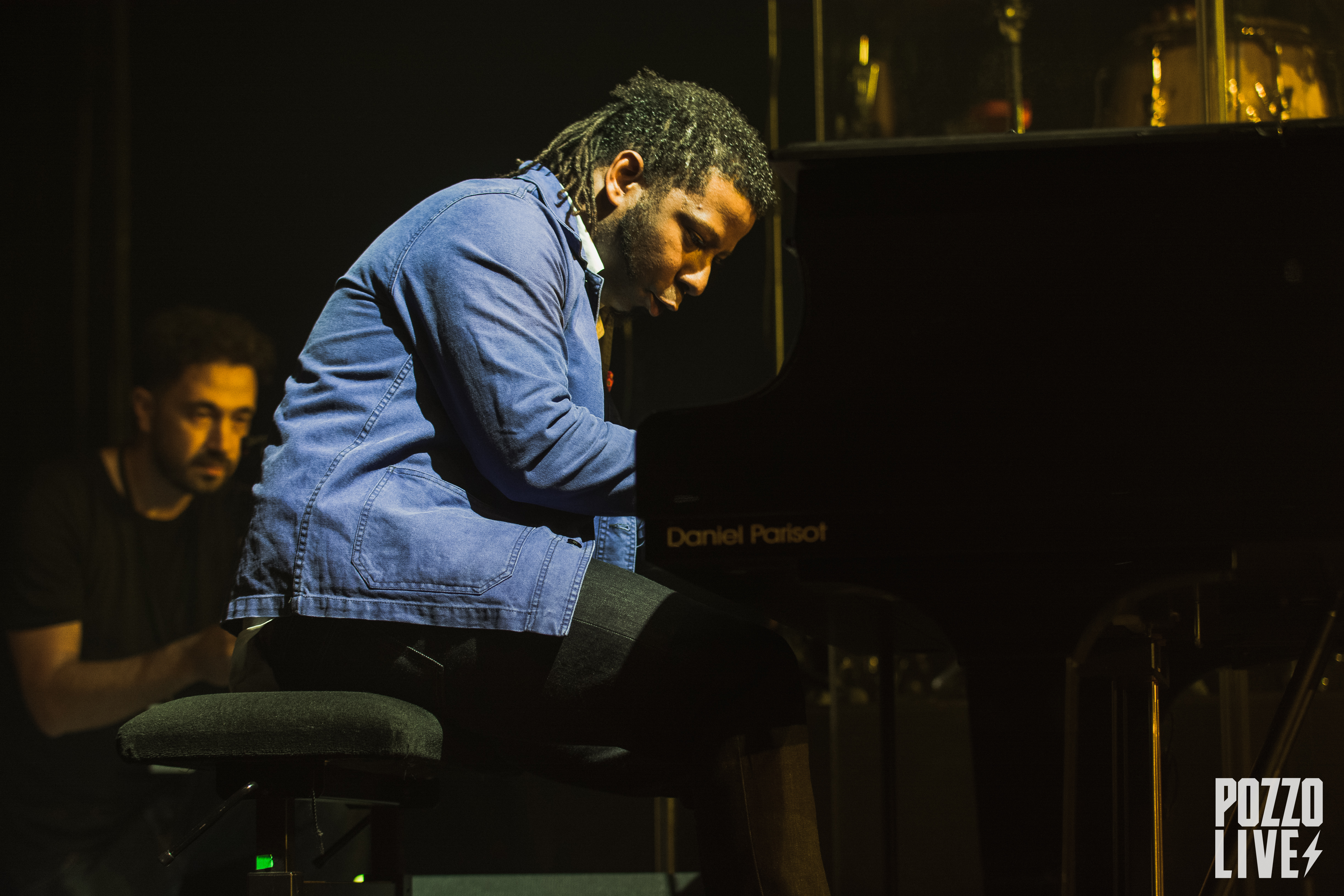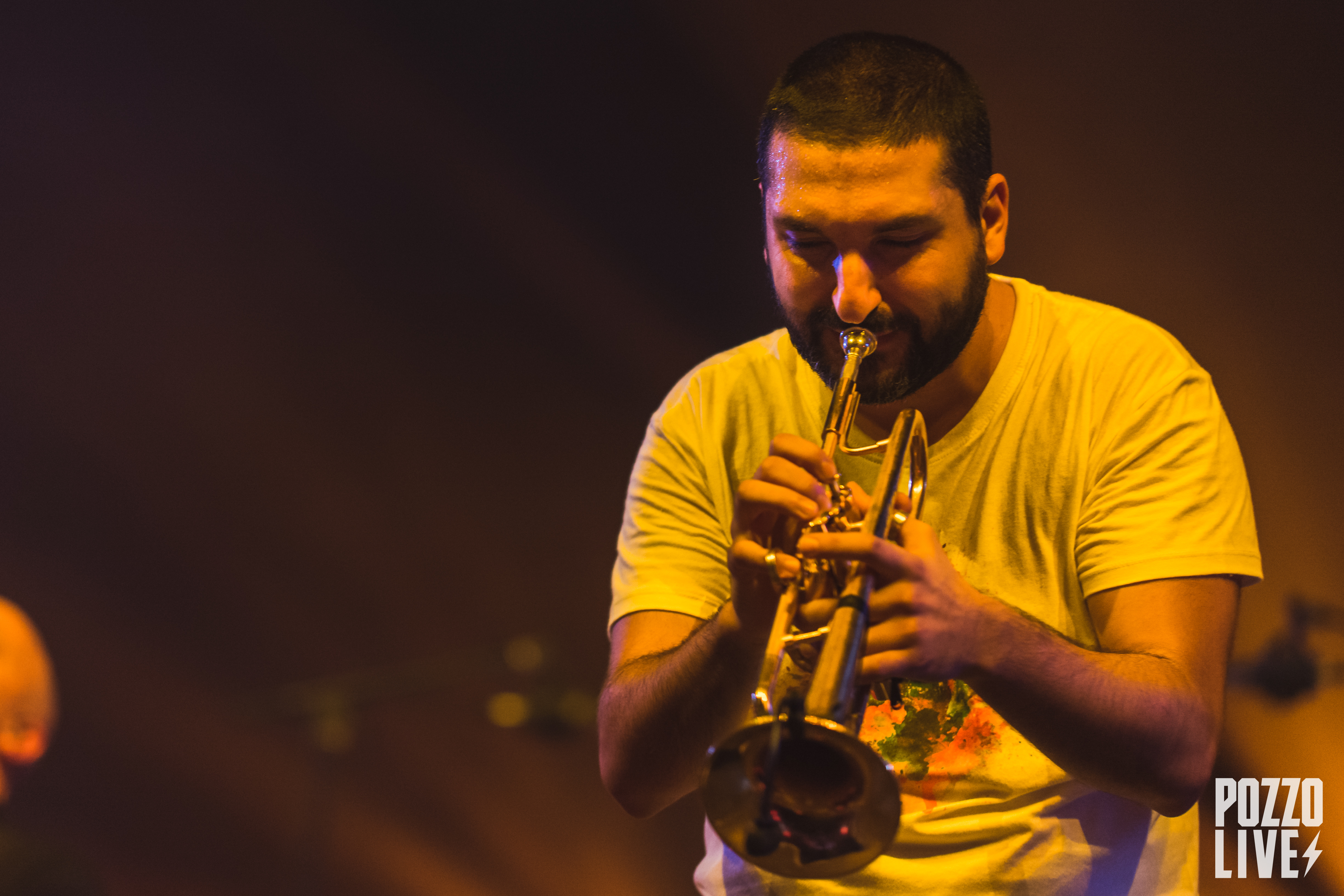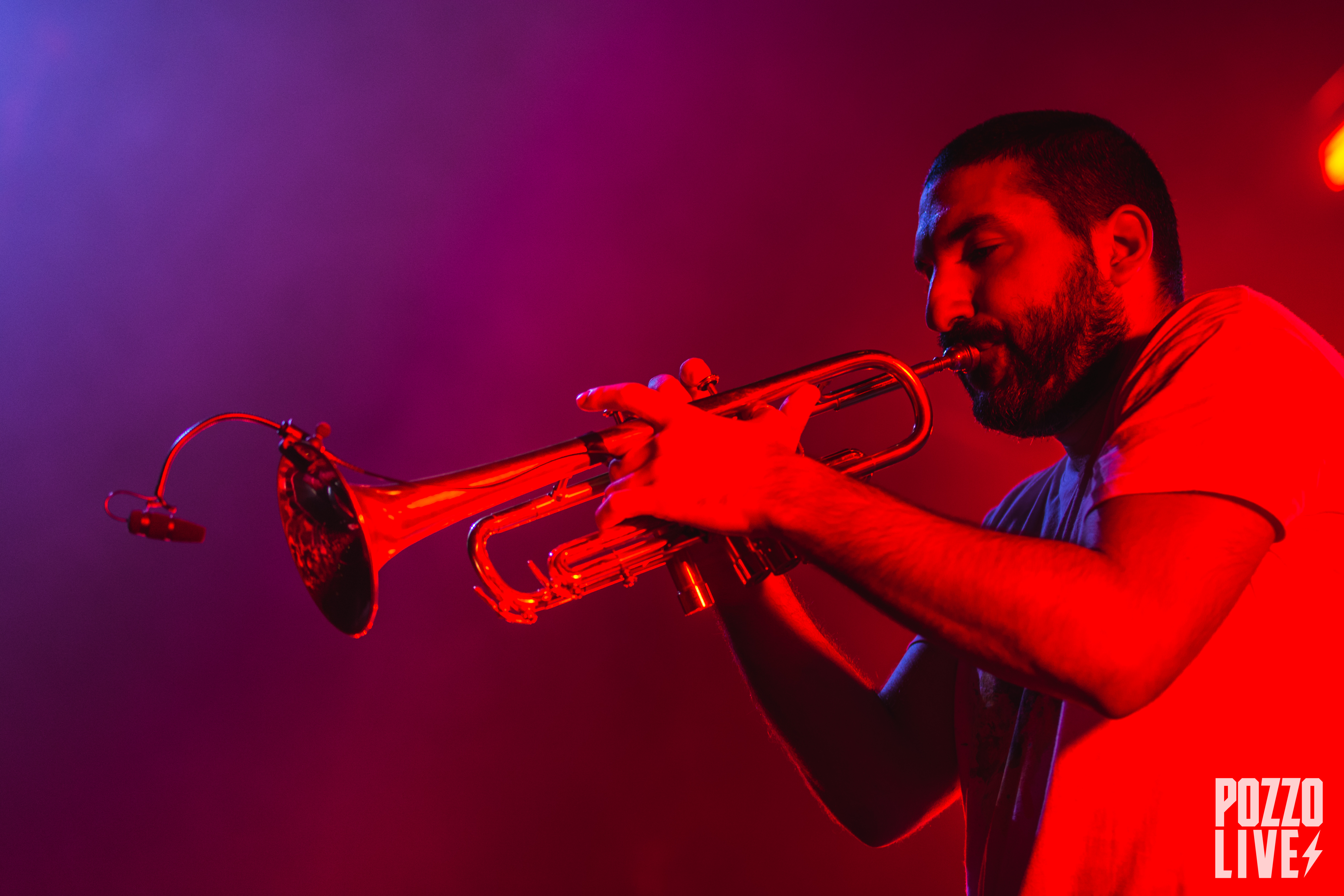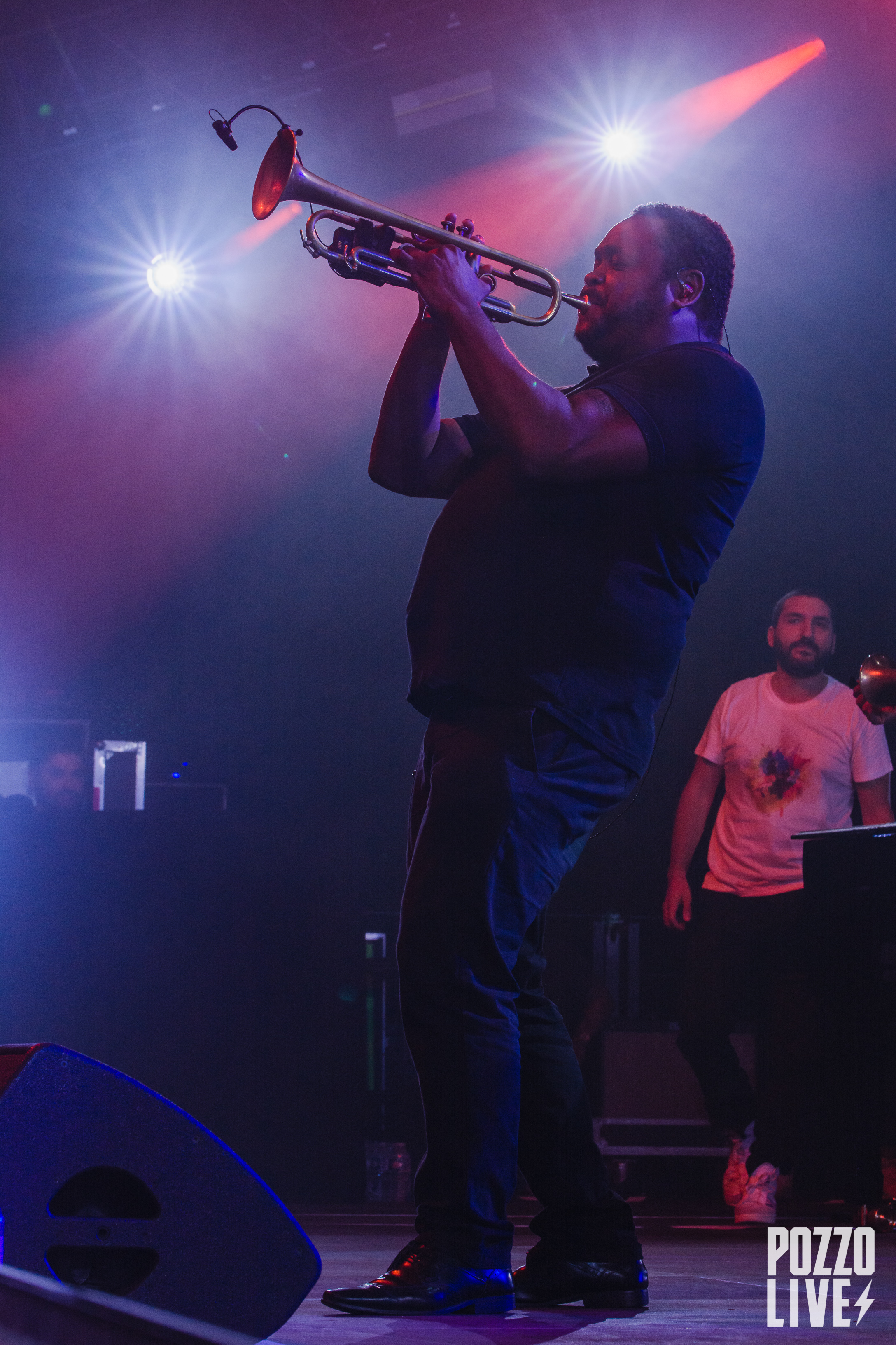 20h45, les musiciens entrent en scène. Un brass band de 6 cuivres et un percussionniste viennent compléter le groupe habituel (pianoguitarebasse et batterie). Ibrahim entre en scène trompette à la main, et c’est parti pour 2h de concert dantesque!
