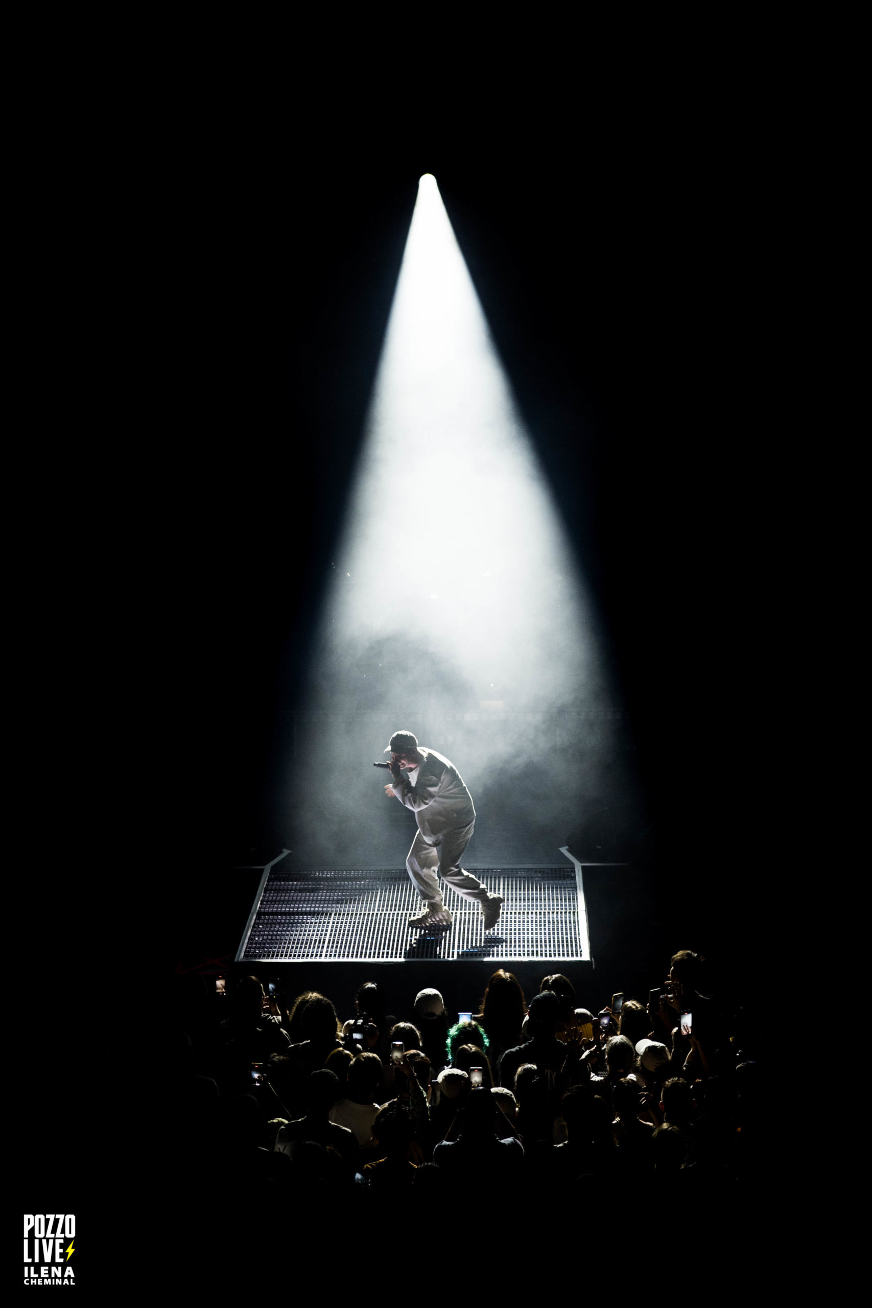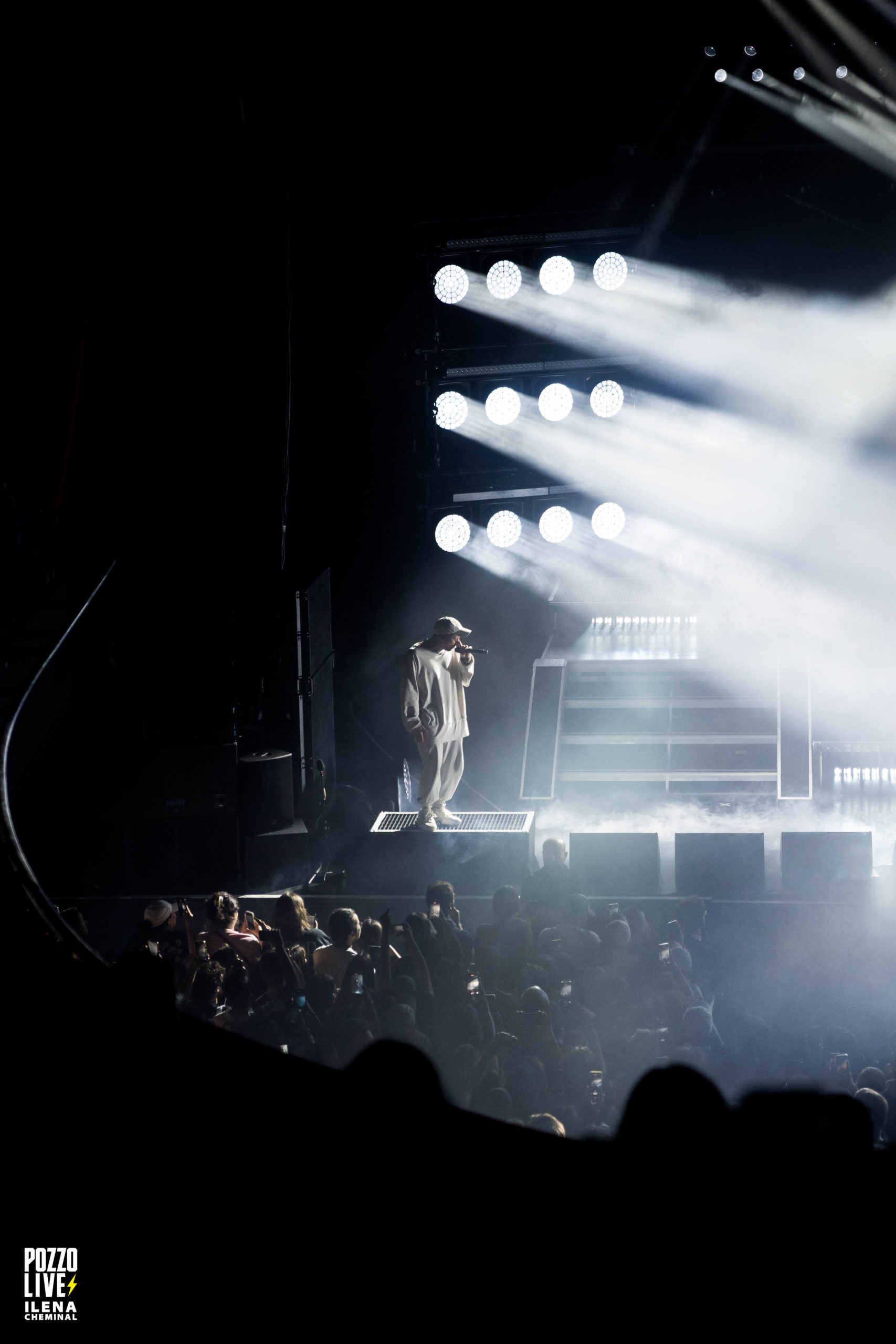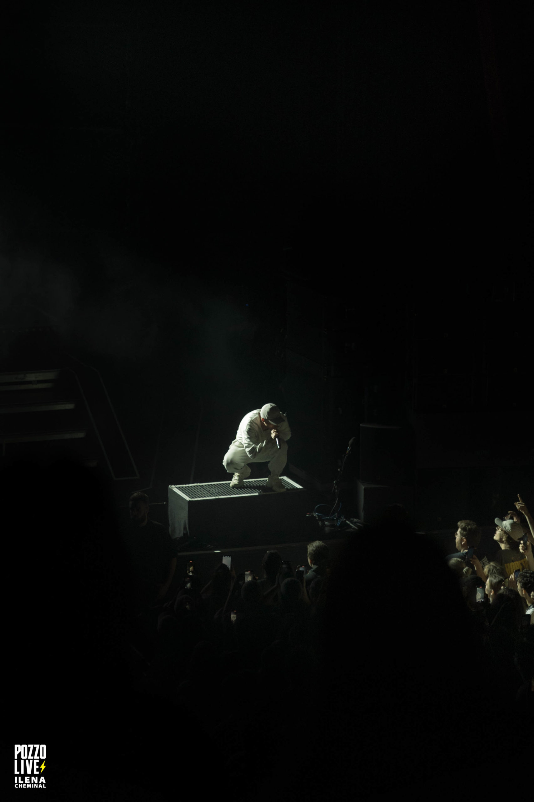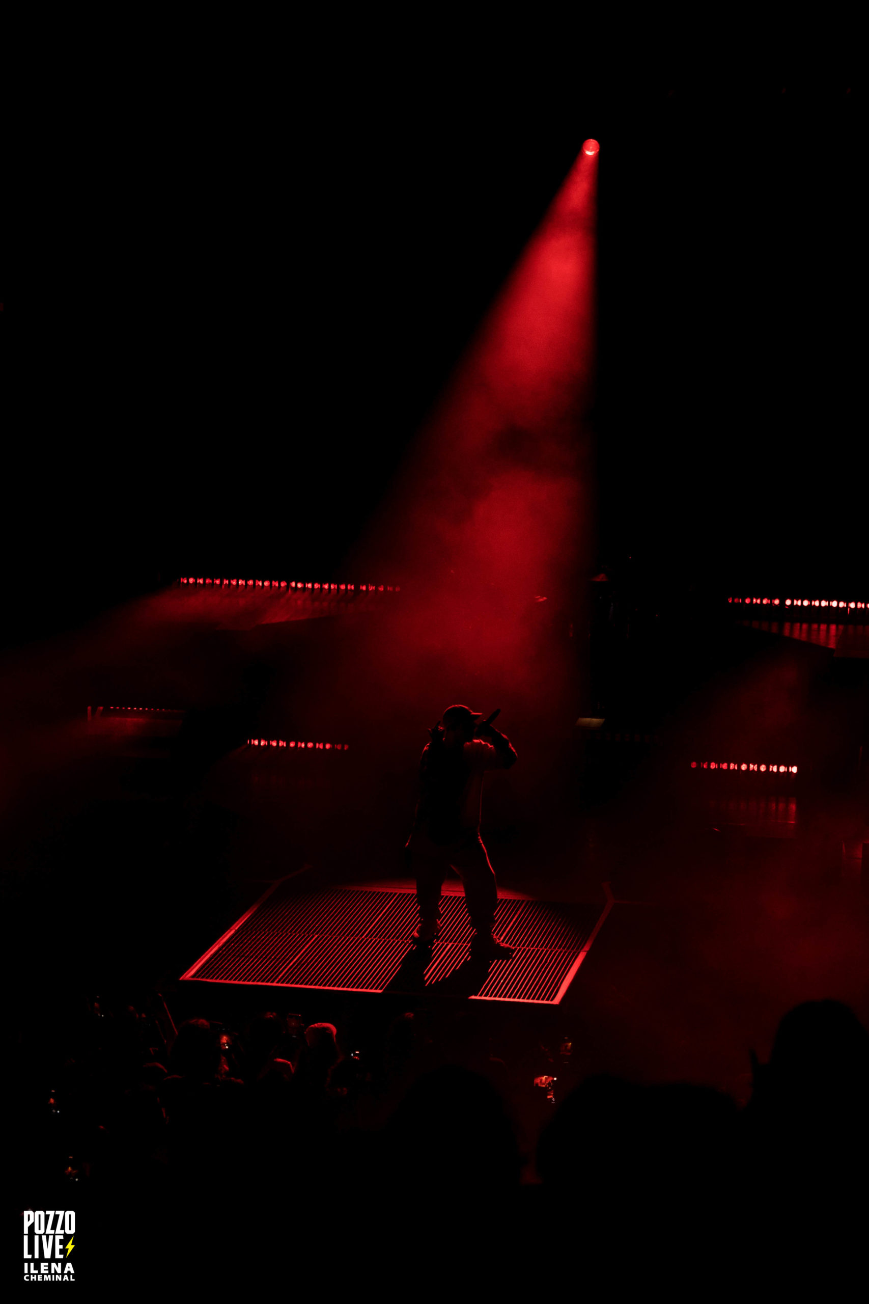 Les lumières s’éteignent, l’introduction de son titre phare HOPE démarre. Les fans s’égosillent déjà. Puis d’un coup des spots rouges éclairent le haut de la scène, et NF apparait, avec une grande cagoule sur la tête. Il l’enlève rapidement et commence à chanter son hit.