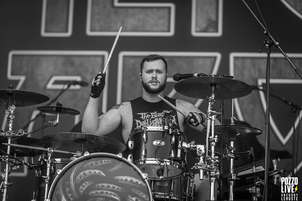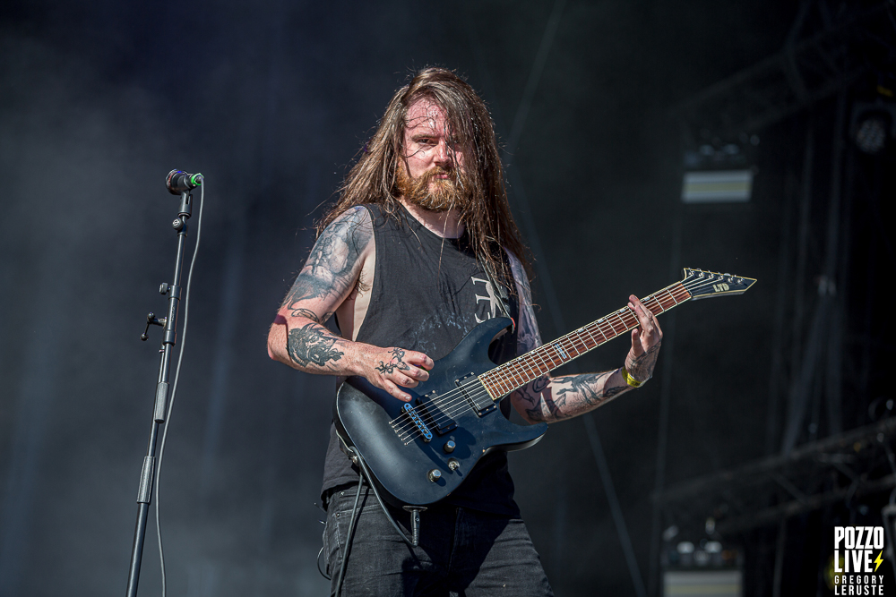 Visuellement, la scène est sobre : il n’y a aucun décor si ce n’est le nom du groupe affiché en arrière-plan, et les trois musiciens torse nu (excepté le batteur qui arbore un magnifique t-shirt de The Black Dahlia Murder). Cependant, le trio en lui-même a une prestance telle que le moindre élément ajouté aurait semblé déplacé. Tous ces tatouages n’y sont pas pour rien…