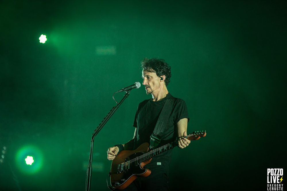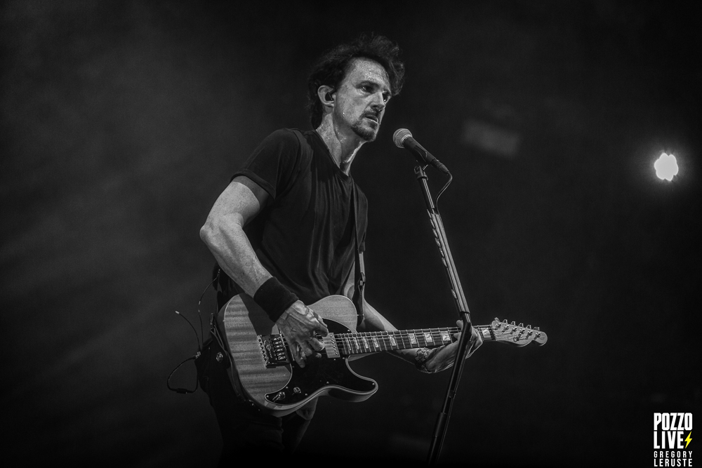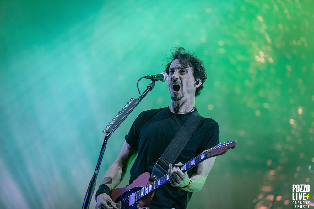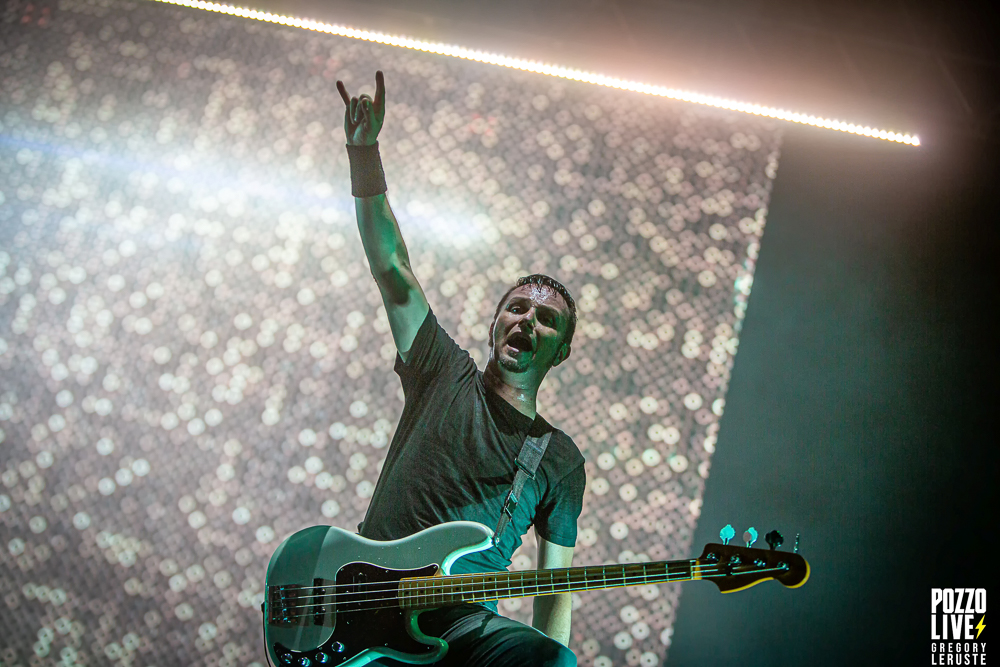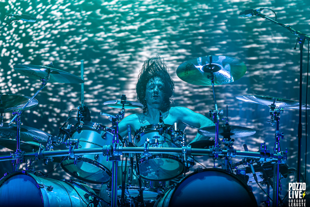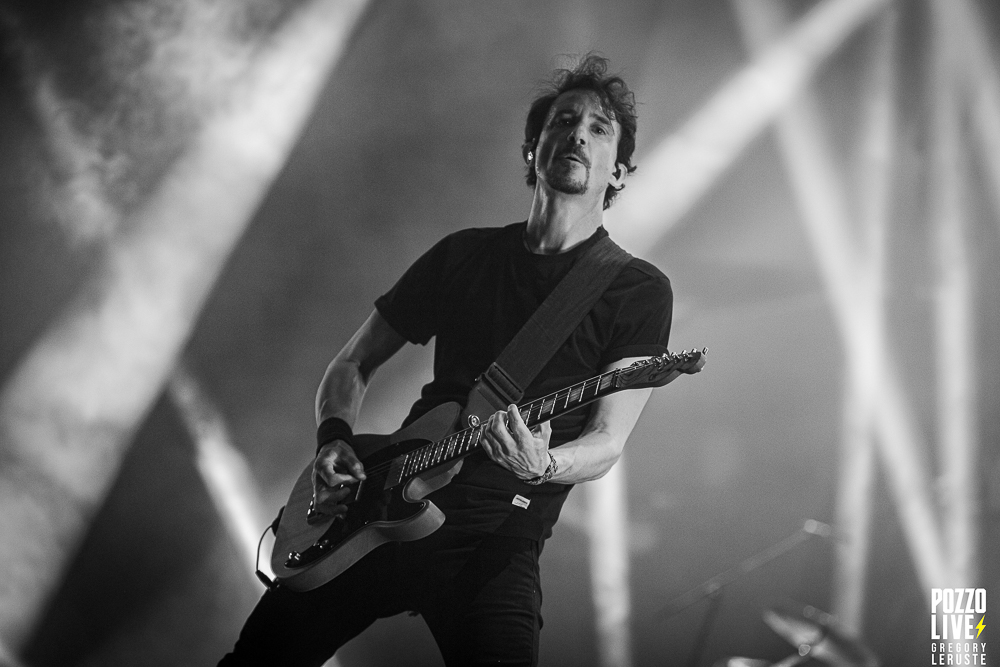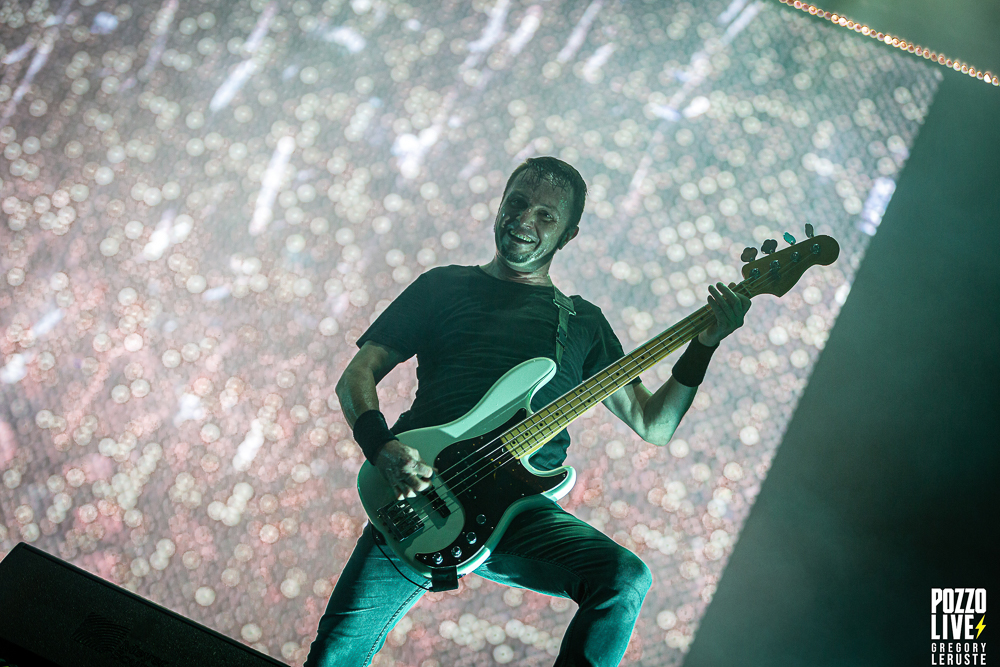 Malgré une scène sombre décorée d’un unique écran géant, des explosions de confettis pleuvront sur le public à plusieurs reprises, notamment sur Stranded et The Gift of Guilt. Dommage de ne pas avoir eu droit à des flammes, même si vu la chaleur pesante ce n’était peut-être pas si mal… Enfin, la majorité des animations défilant sur l’écran en fond auront en commun de rester sur des tons froids, avec majoritairement du noir et du blanc, même si un jeu de lumières bleues viendront donner l’impression d’assister à un live sous-marin durant l’indispensable Flying Whales. Juste une exception à ceci, Another World aura droit à son clip ultra coloré pour notre plus grand plaisir.