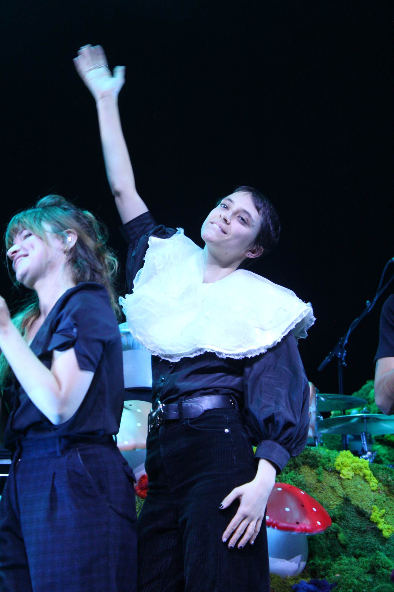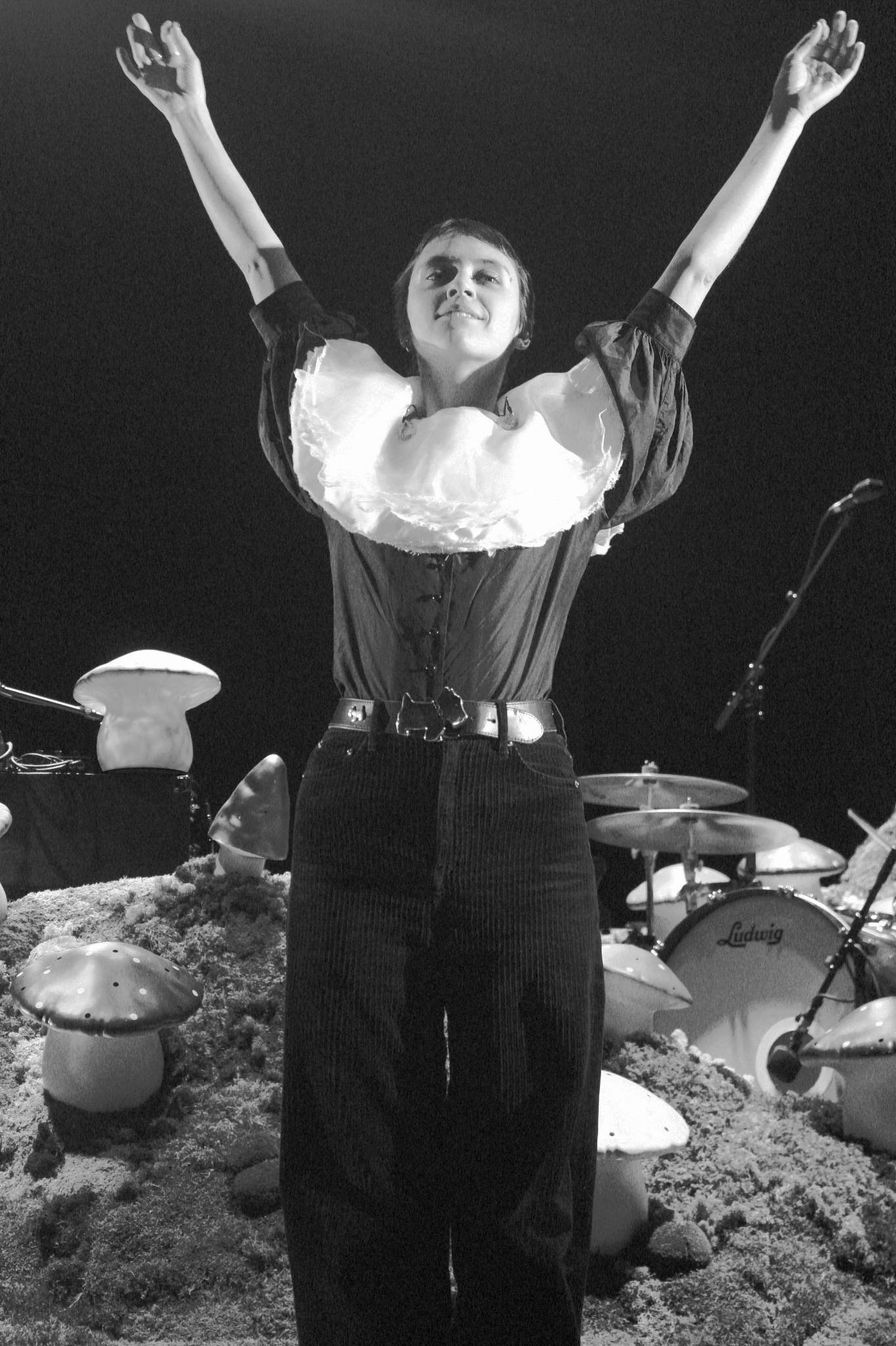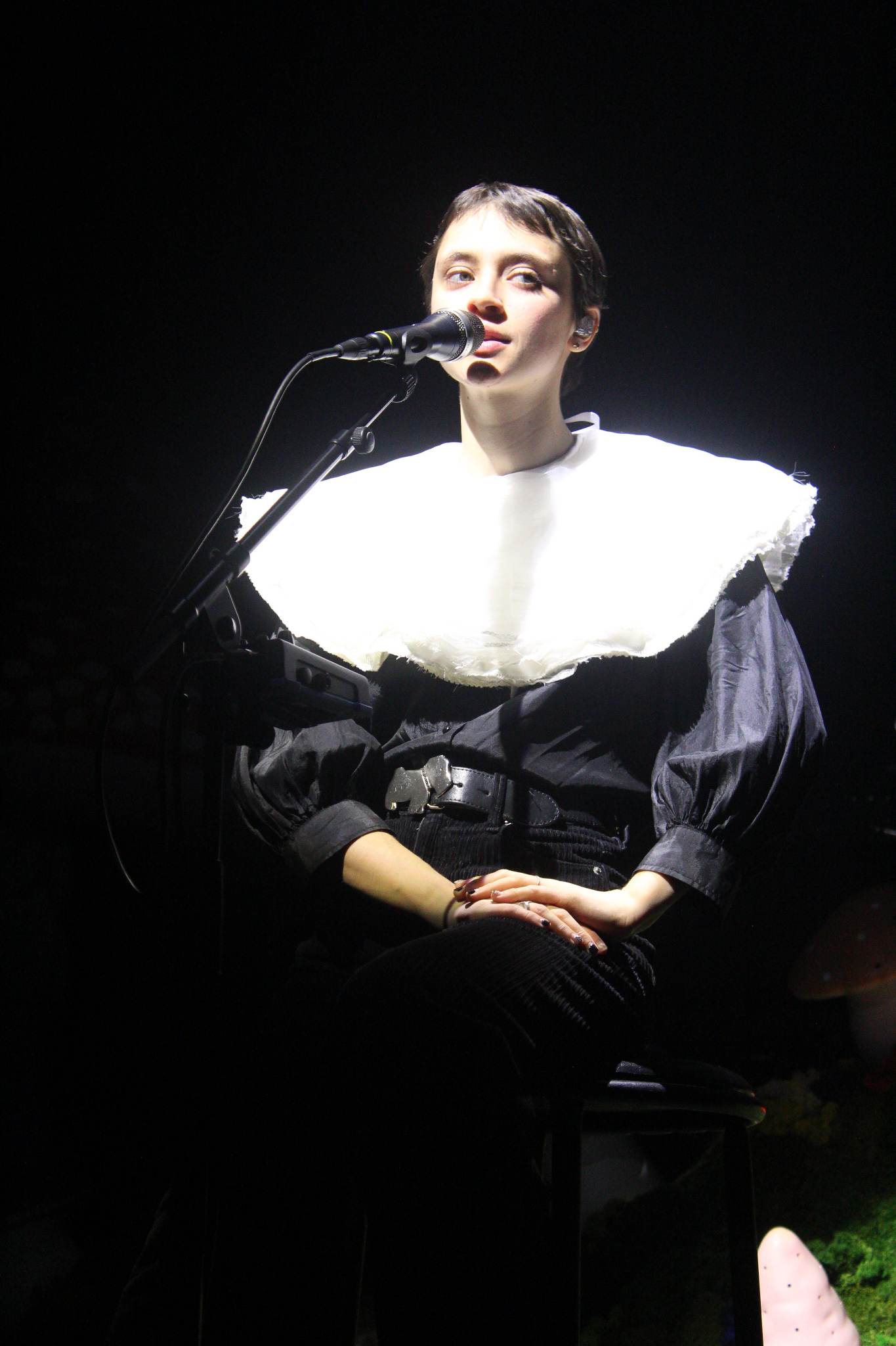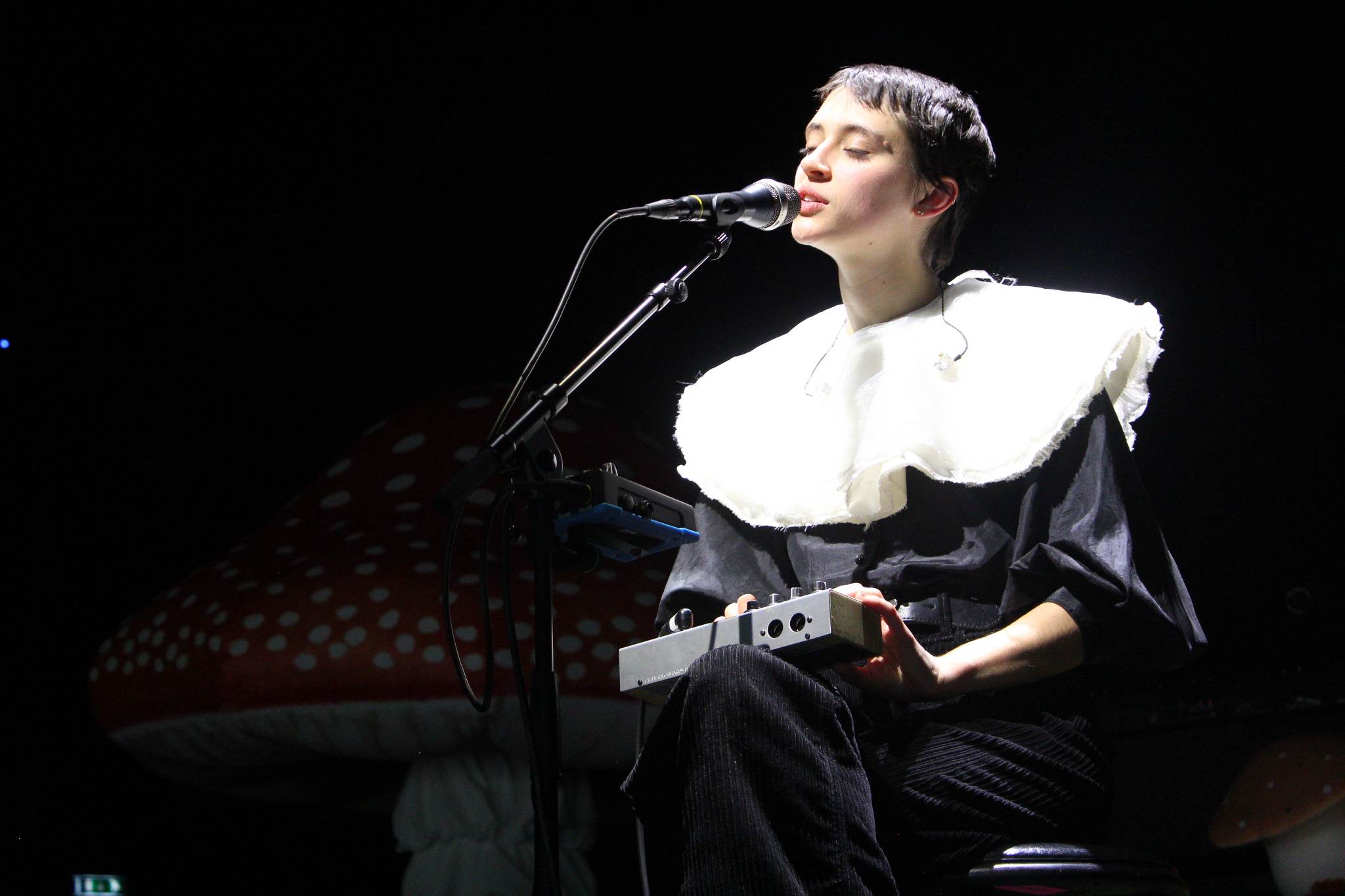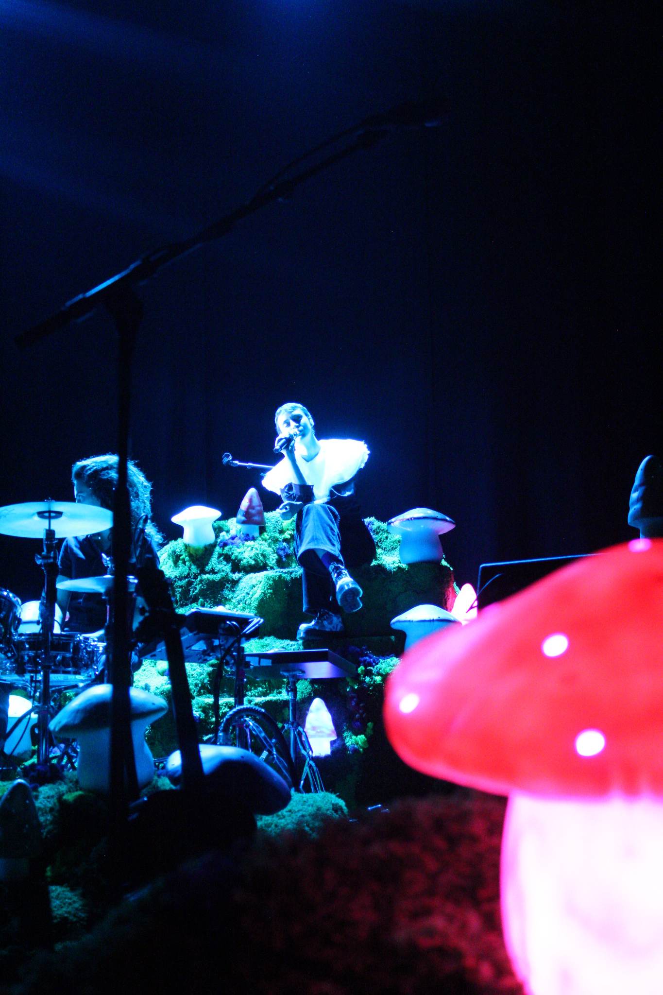 Car oui, parée de sa plus belle collerette et de ses Dr.Martens Jadon Polka, Pomme n’aura de cesse de blaguer avec un cynisme plus qu’appréciable. Entre autres entourée de champignons géants et de lichen (qui pue la pisse de chat selon elle), nous sommes happés par sa voix d’une douceur angevine. Un million, chanson qui parle de ses émotions qu’elle a du mal à exprimer, captive la salle. S’amusant ensuite avec son boîtier d’autotune, elle se feindra d’imiter PNL avant d’interrompre brièvement le spectacle. En effet, suite à un petit malaise survenu dans la foule, elle agira avec bienveillance et dérision, demandant avec blinde d’autotune à la sécurité d’intervenir.