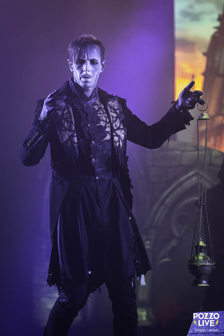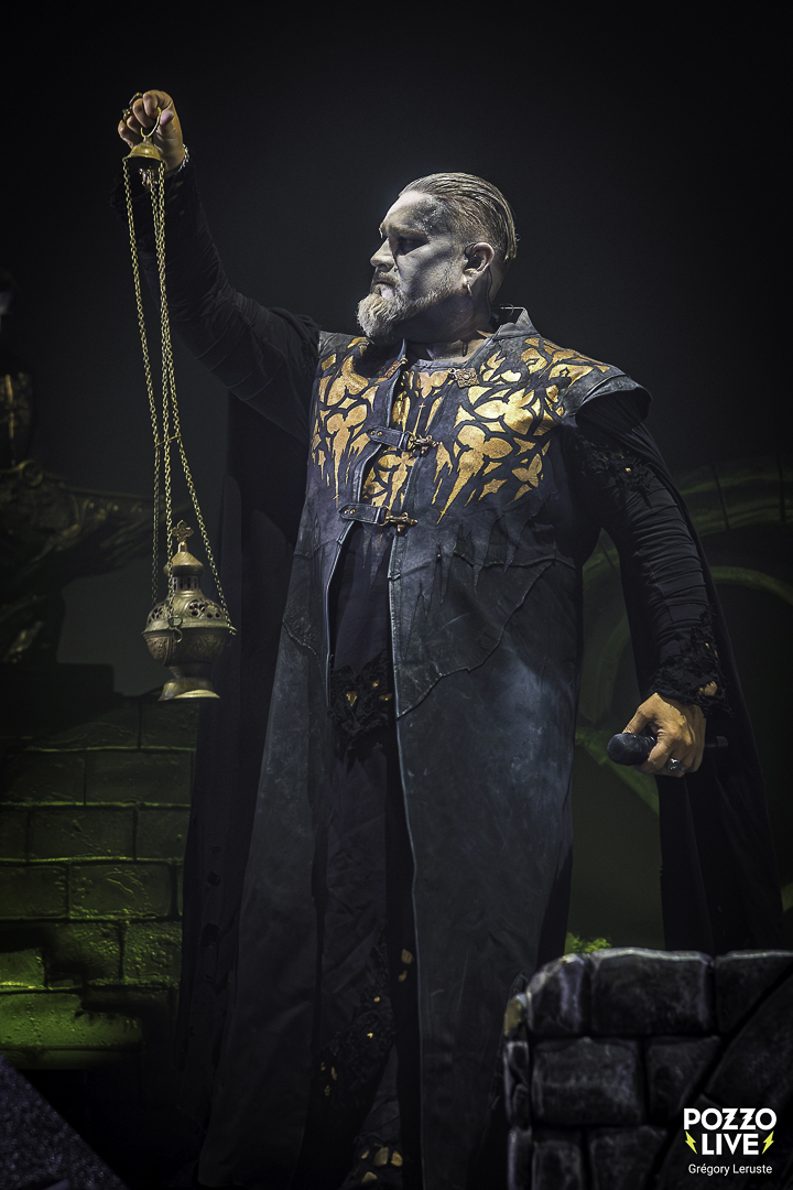 La musique débute et le noir se fait. Le rideau tombe et nous dévoile une scène de désolation. Les membres de Powerwolf se tiennent debout au milieu de ruines en feu, Attila tout en haut d’un piédestal nous invite à la grande messe du Heavy Metal de Powerwolf. Il est appréciable de noter qu’il s’exprimera toute la soirée dans un Français remarquable.