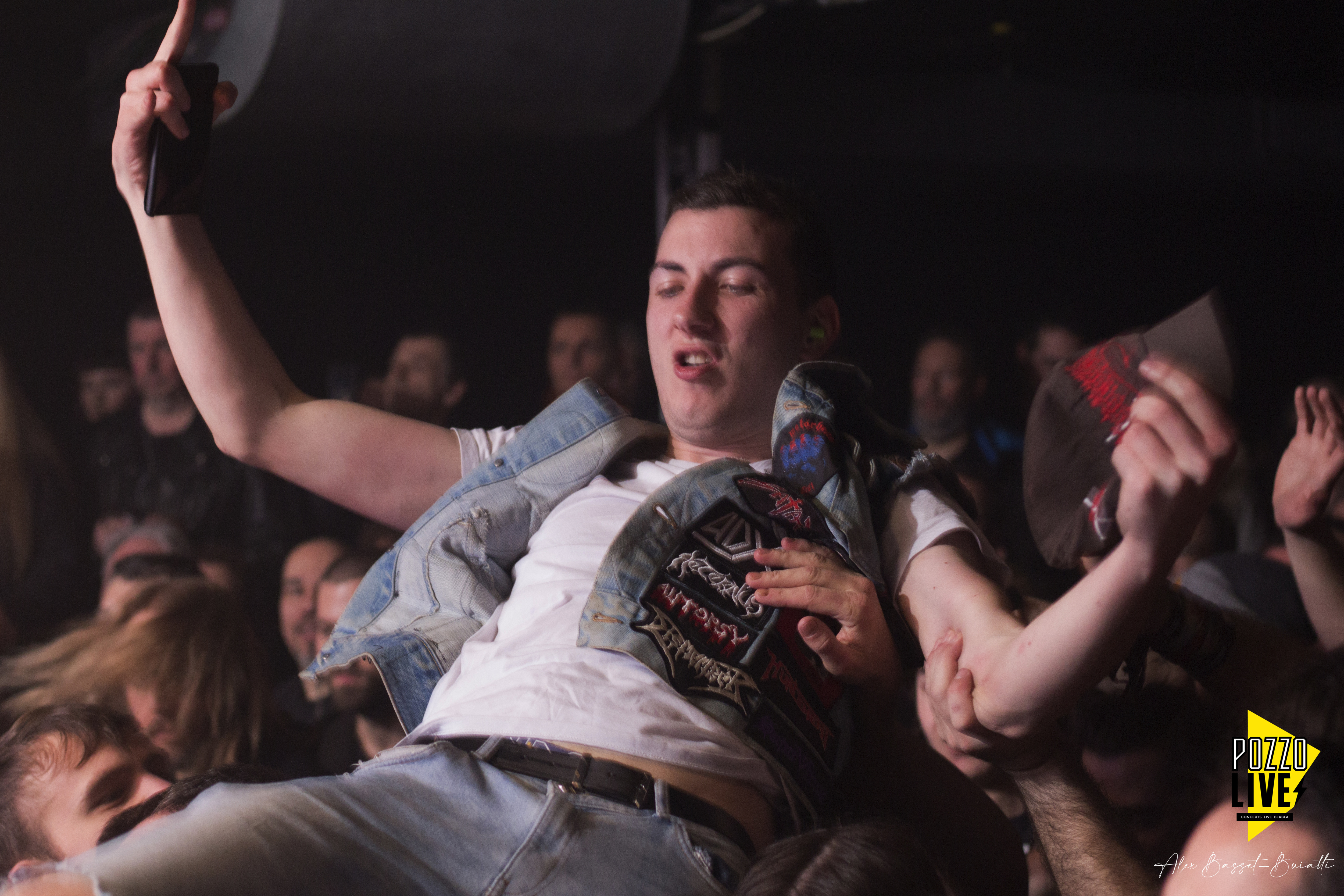 Déesse du Crime démarre et le public fait clairement savoir qu’il est présent et fier d’être là ce soir pour cette date exceptionnelle à guichet fermé. Ça chante fort et les premiers slammeurs atterrissent sur scène et repartent illico presto dans la direction opposée en crowd surfing .