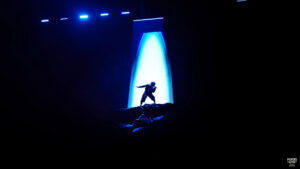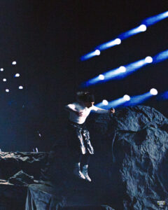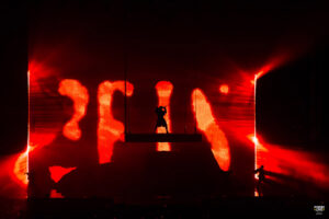 C’est suspendu à plusieurs mètres de haut avant d’être complètement détaché dans le vide que Rilès arrive sur scène. Une entrée qui impressionne, qui fracasse et qui stresse mais c’est surtout une arrivée qui marque les esprits.