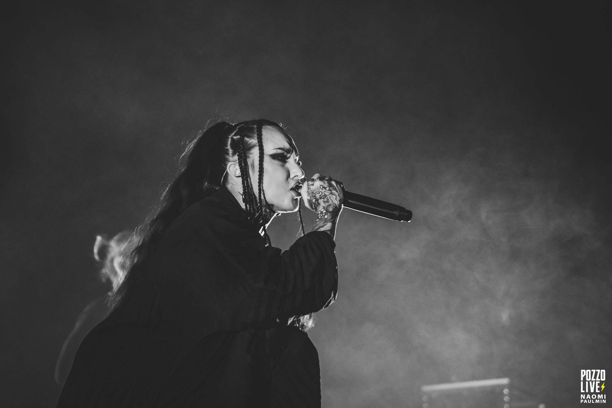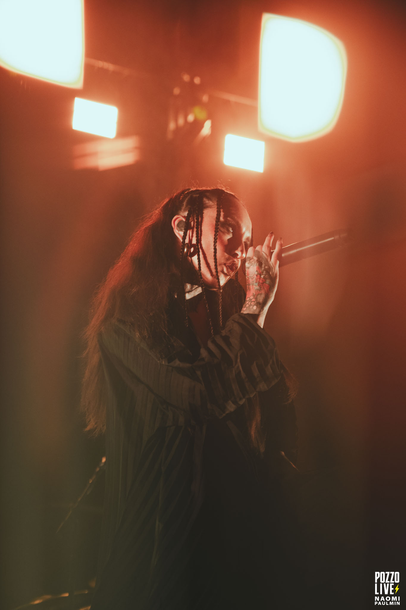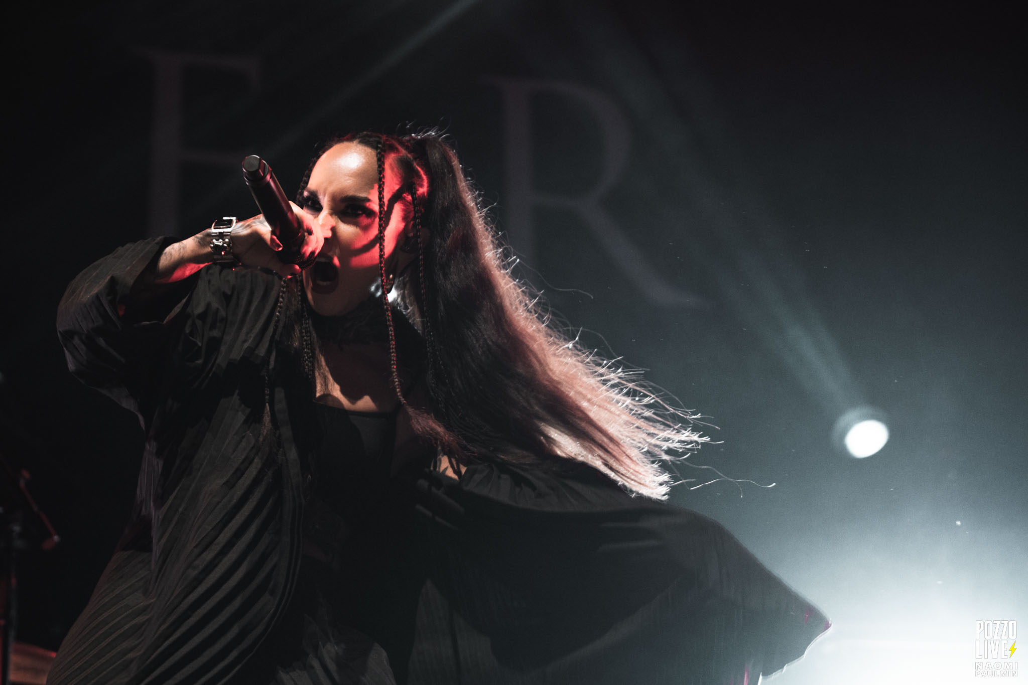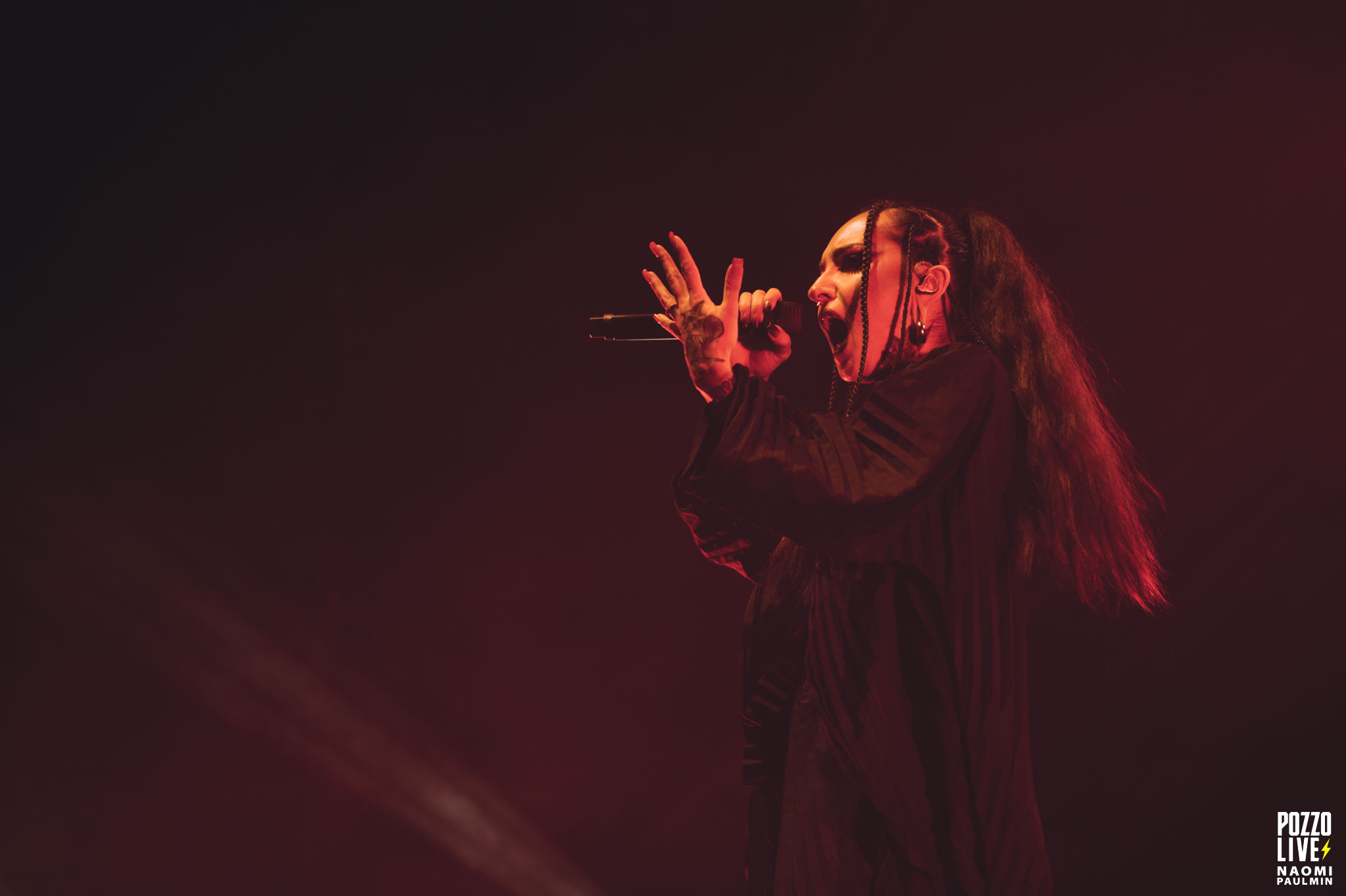 J’attendais beaucoup de voir les ukrainiens de Jinjer, et je suis assez déçu de leur performance. La scène, qui est enfin intégralement découverte, me semble mal exploitée par le groupe. Roman Ibramkhalilov (guitare) et Eugene Abdukhanov (basse) sont plantés chacun à un bout de la scène et ne bougent pas. Seule Tatiana Shmayluk occupe le centre de la scène et alterne les poses en fonction de ses chants. Globalement, tout ça manque d’engagement, j’ai l’impression que le groupe est fatigué après deux ans de tournée ininterrompue.