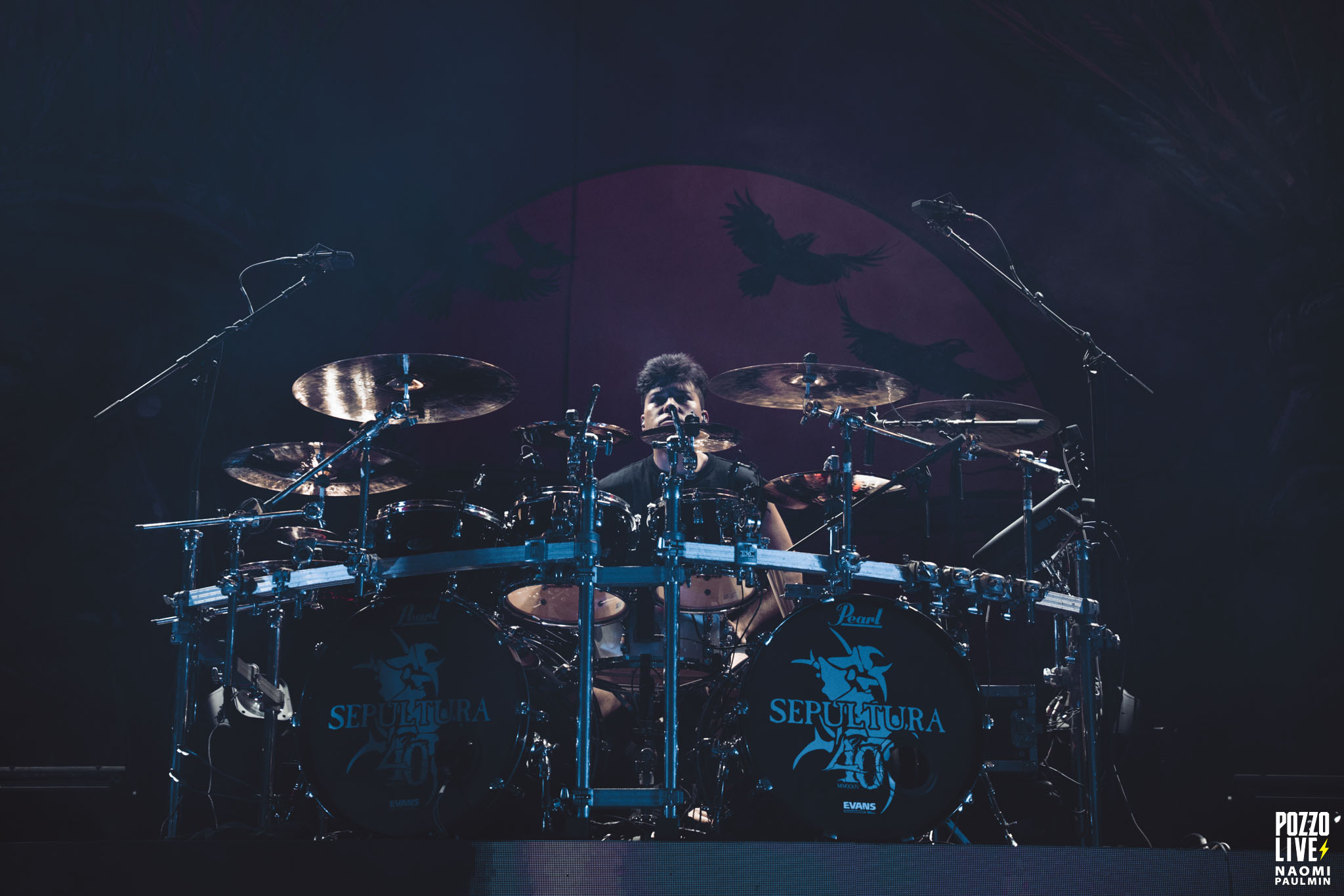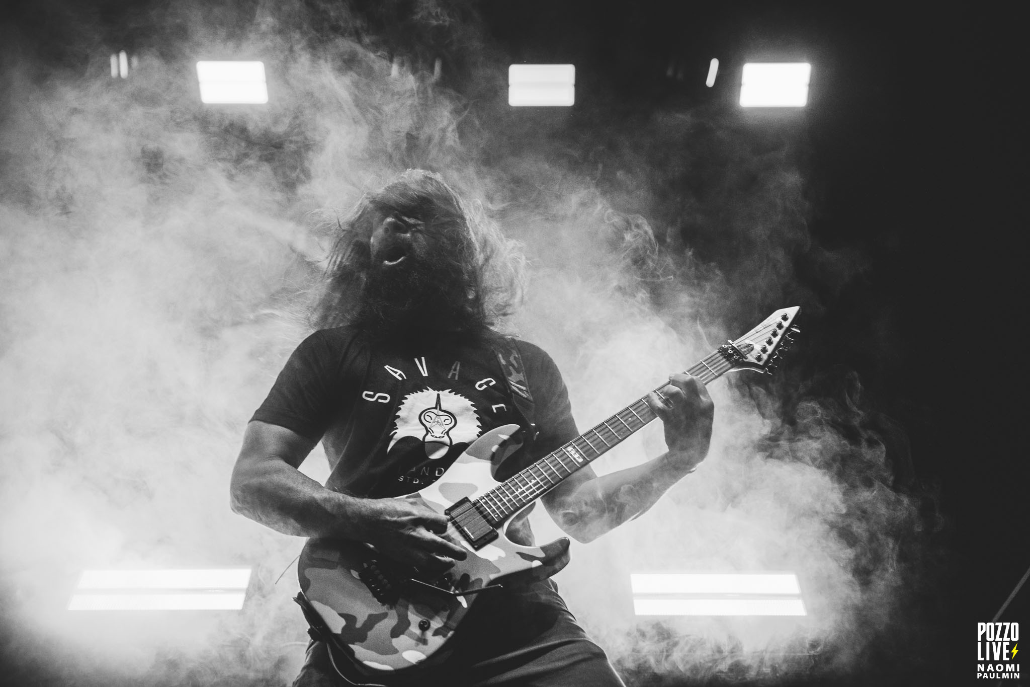 Le show commence avec une scénographie minimaliste, seul un immense drapeau barre le fond de scène. Mais rapidement, il laisse la place à un grand écran et des relais sur les plateformes qui diffusent des images des clips ou des montages issus des pochettes. Nous avons également droit avant « Guardians of the Earth » à une vidéo issue des sessions de l’époque Roots avec les tribus indigènes. Les frères Cavalera sont bien évidemment absents des images, mais Andreas en profite pour rendre hommage au combat des indigènes pour préserver leur mode de vie.