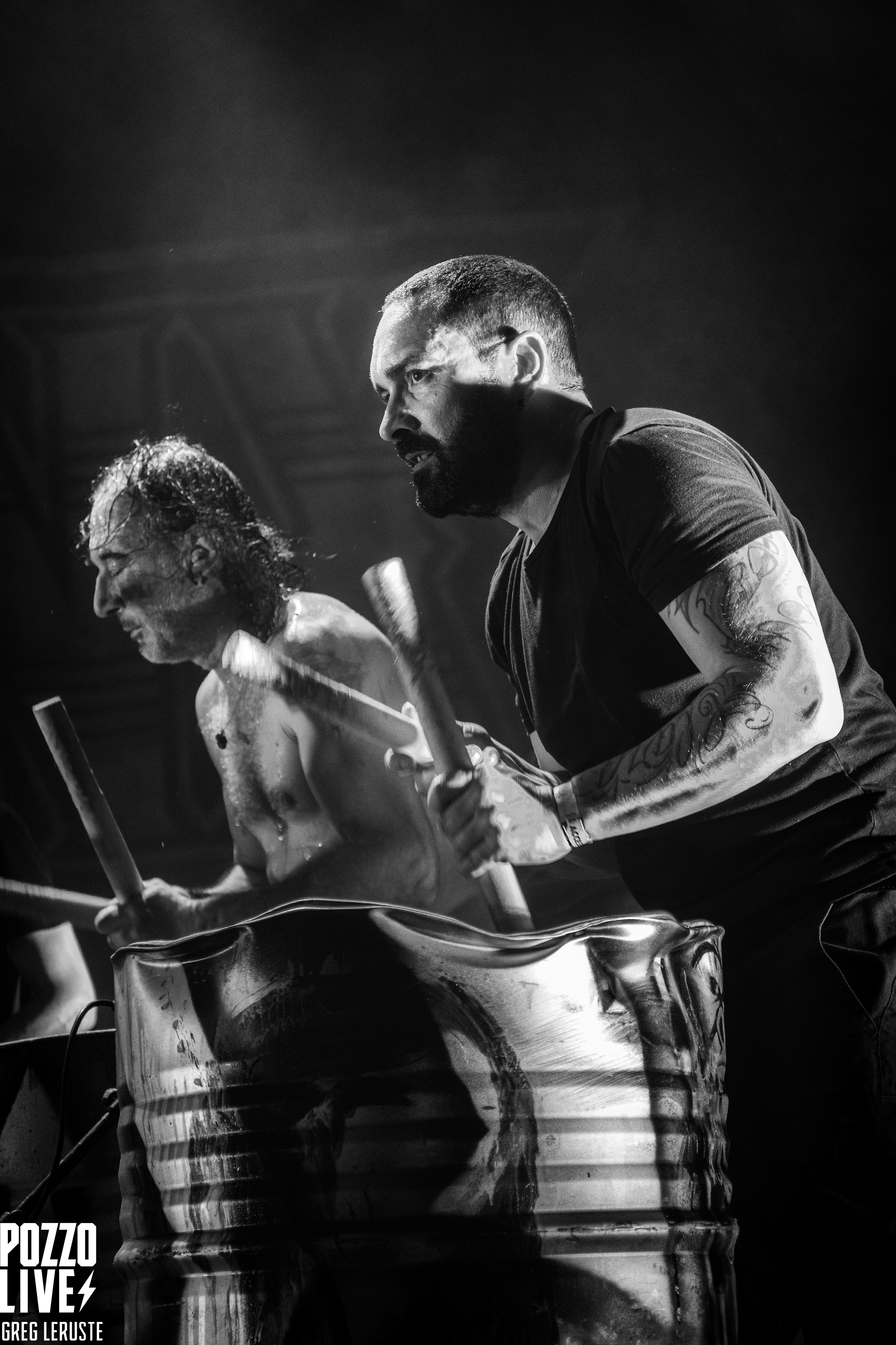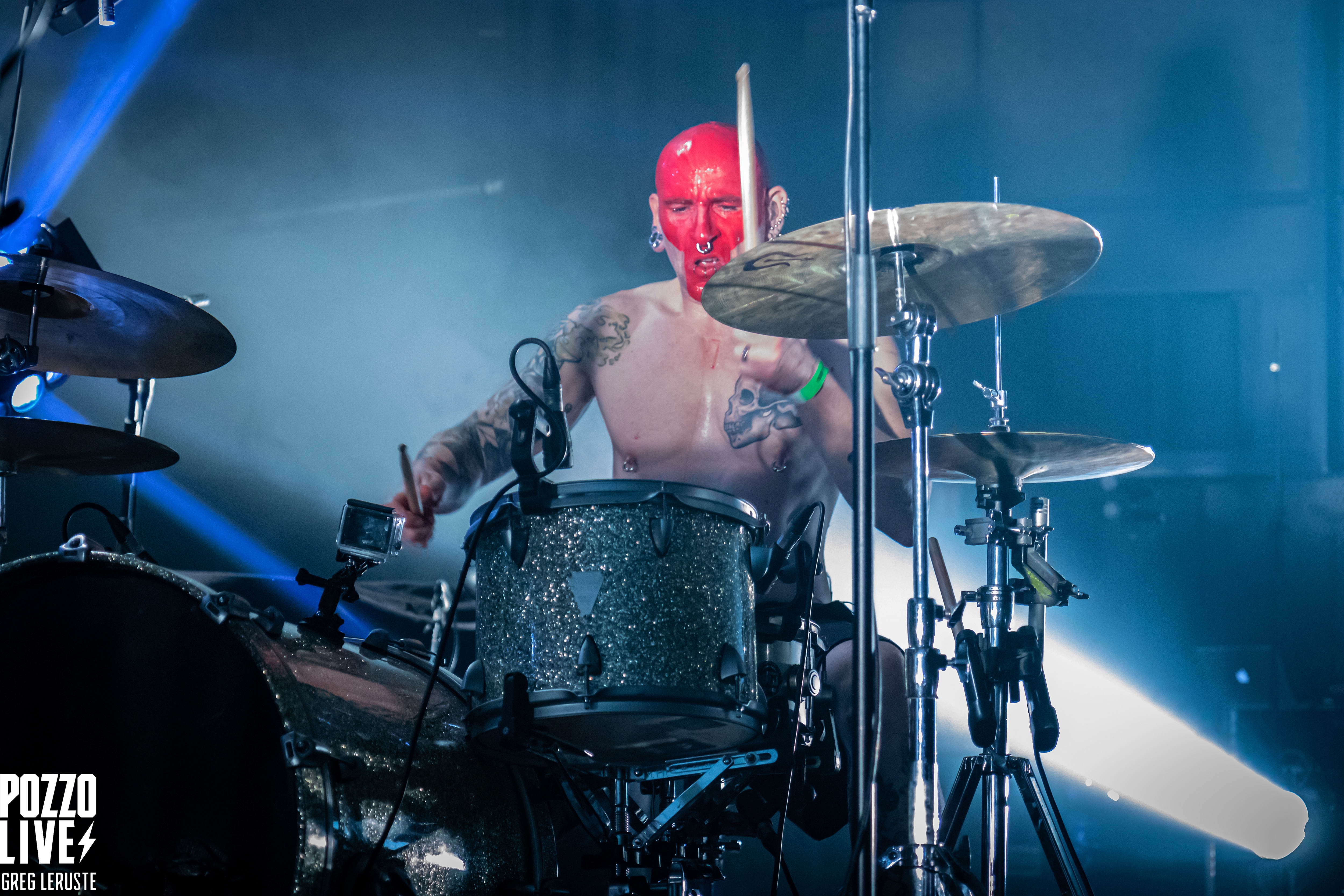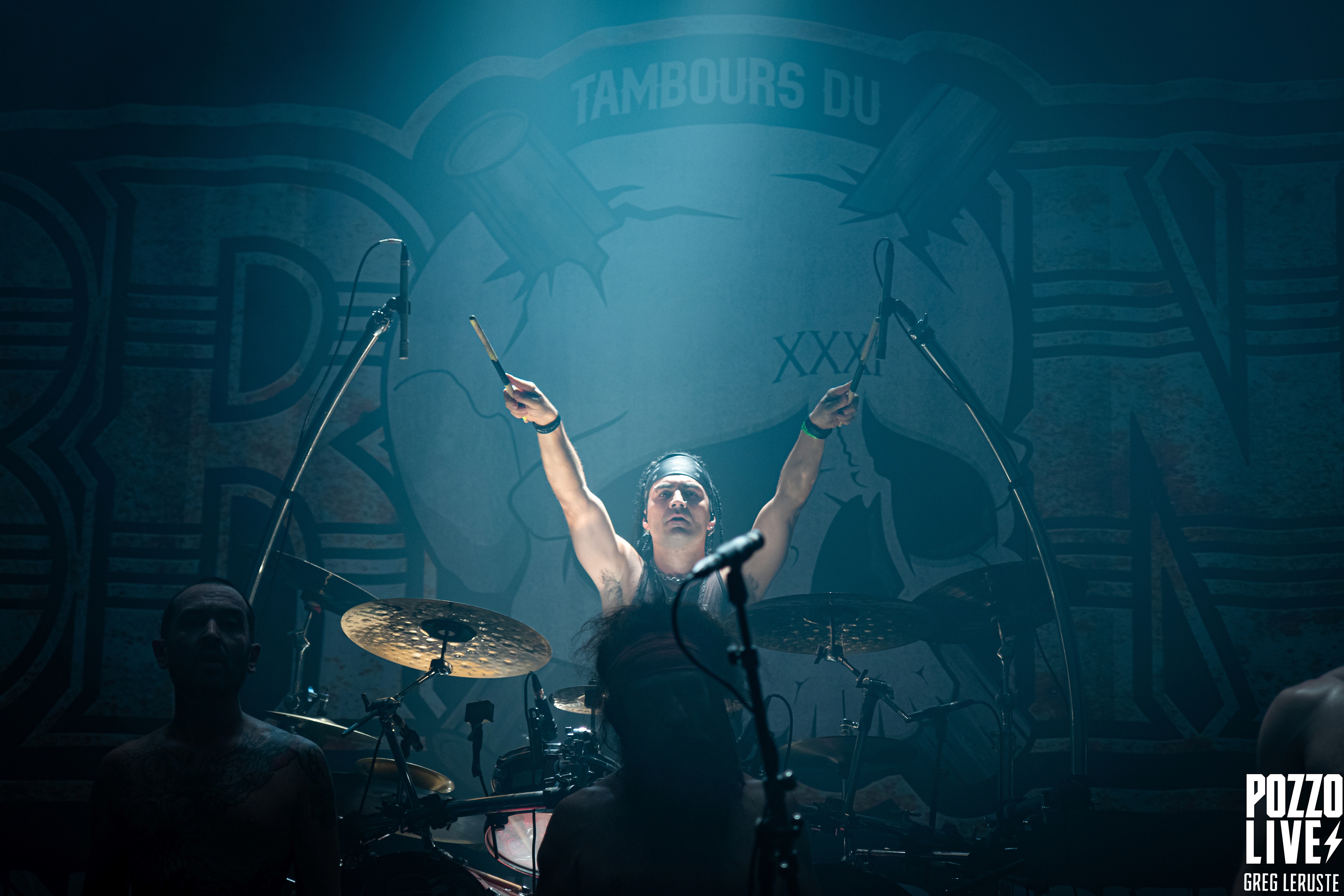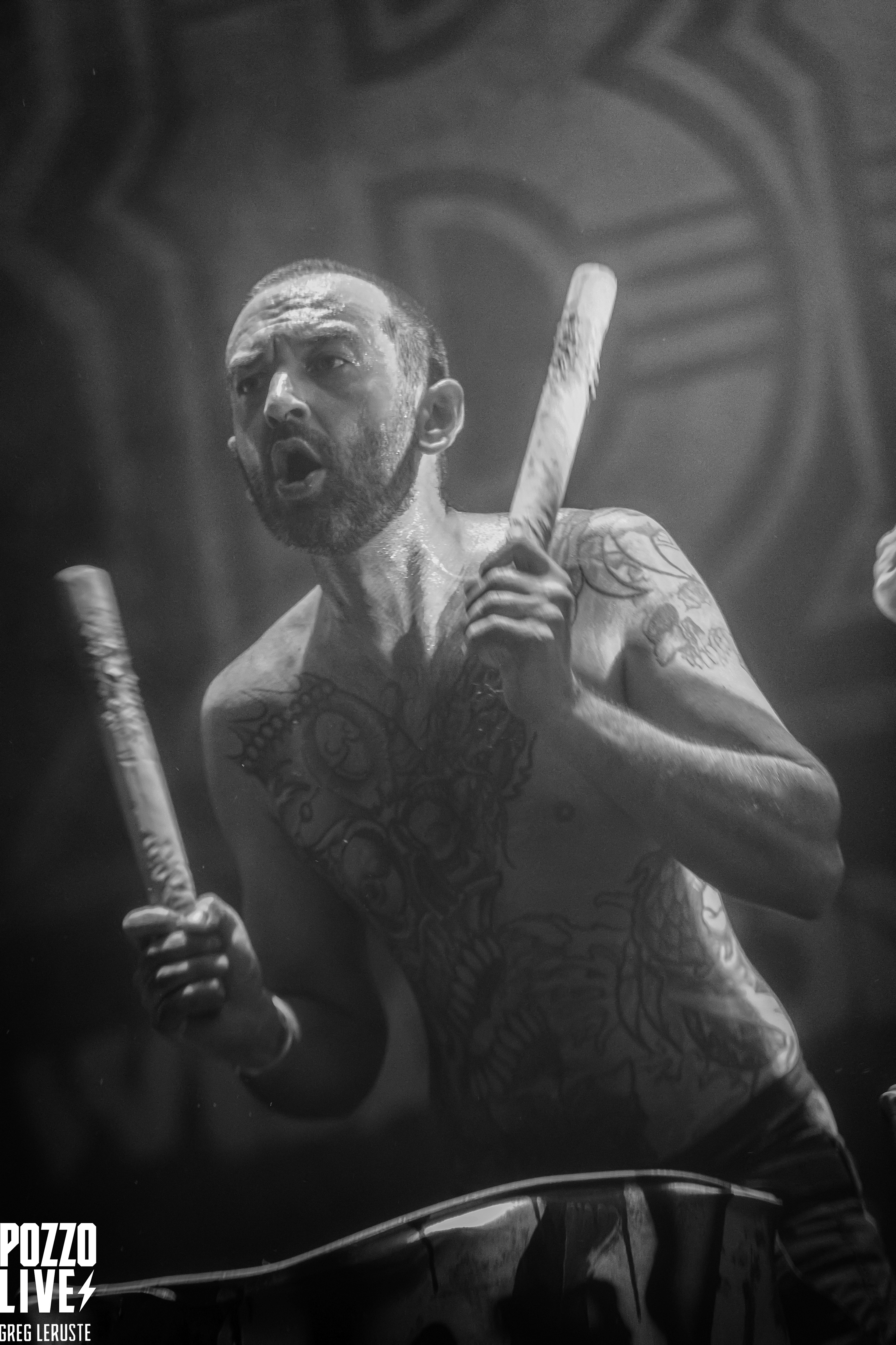 Après cette première partie électronique tonitruante, c’est au tour des Tambours du Bronx de retourner la scène du Bikini. Et petit plaisir de la soirée, la présence de Stéphane Buriez au chant, pour accompagner notre Renato national. Clairement, dès le premier morceau, on est soufflé par la puissance sonore que dégagent les bidons! La formation est impressionnante: une dizaine de bidons sur scène, deux guitares, une batterie et des machines! Beaucoup de visages connus d’ailleurs, comme par exemple Franky Costanza, ancien batteur de Dagoba. Les morceaux s’enchaînent et ne se ressemblent pas, nous avons même droit à quelques reprises (The Day Is My Enemy de The Prodigy, Roots Bloody Roots de Sepultura, et Dragula de Rob Zombie). Tout le public est conquis à en voir l’accueil qu’il réserve à nos marteleurs de fûts préférés! Tout le monde prend son pied, autant sur scène que dans la fosse, et la salle est chaude comme la braise à la fin du set des Tambours.