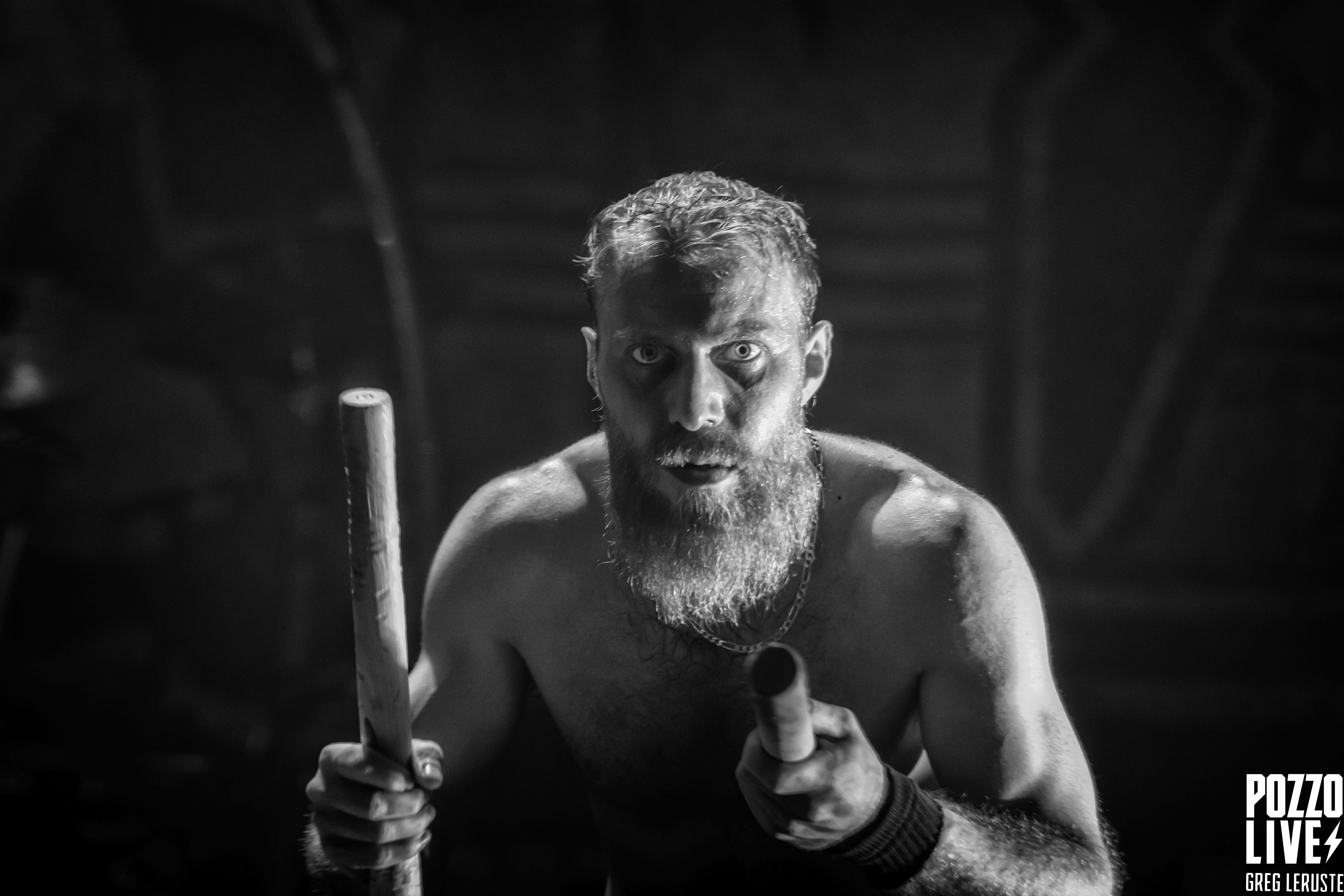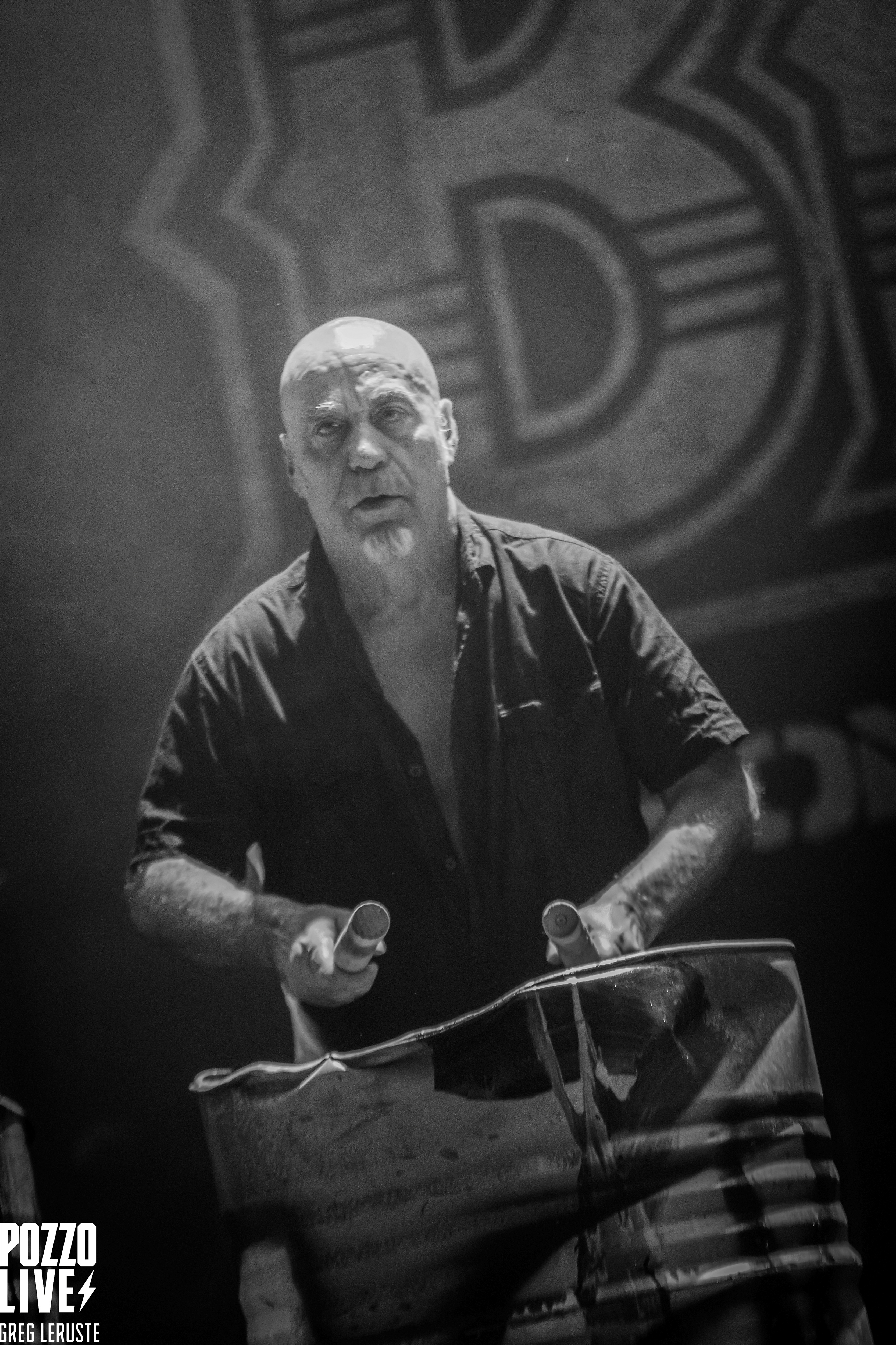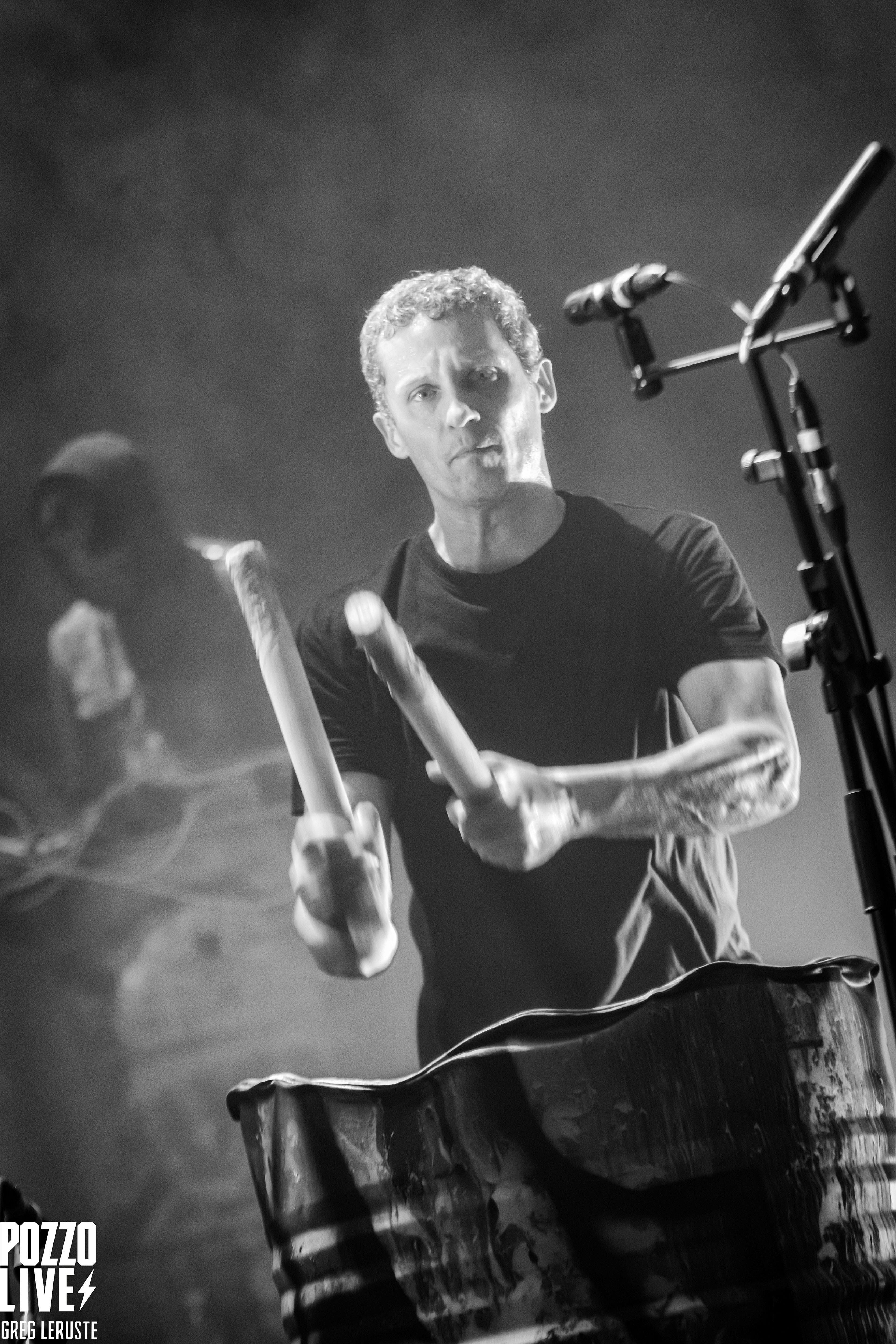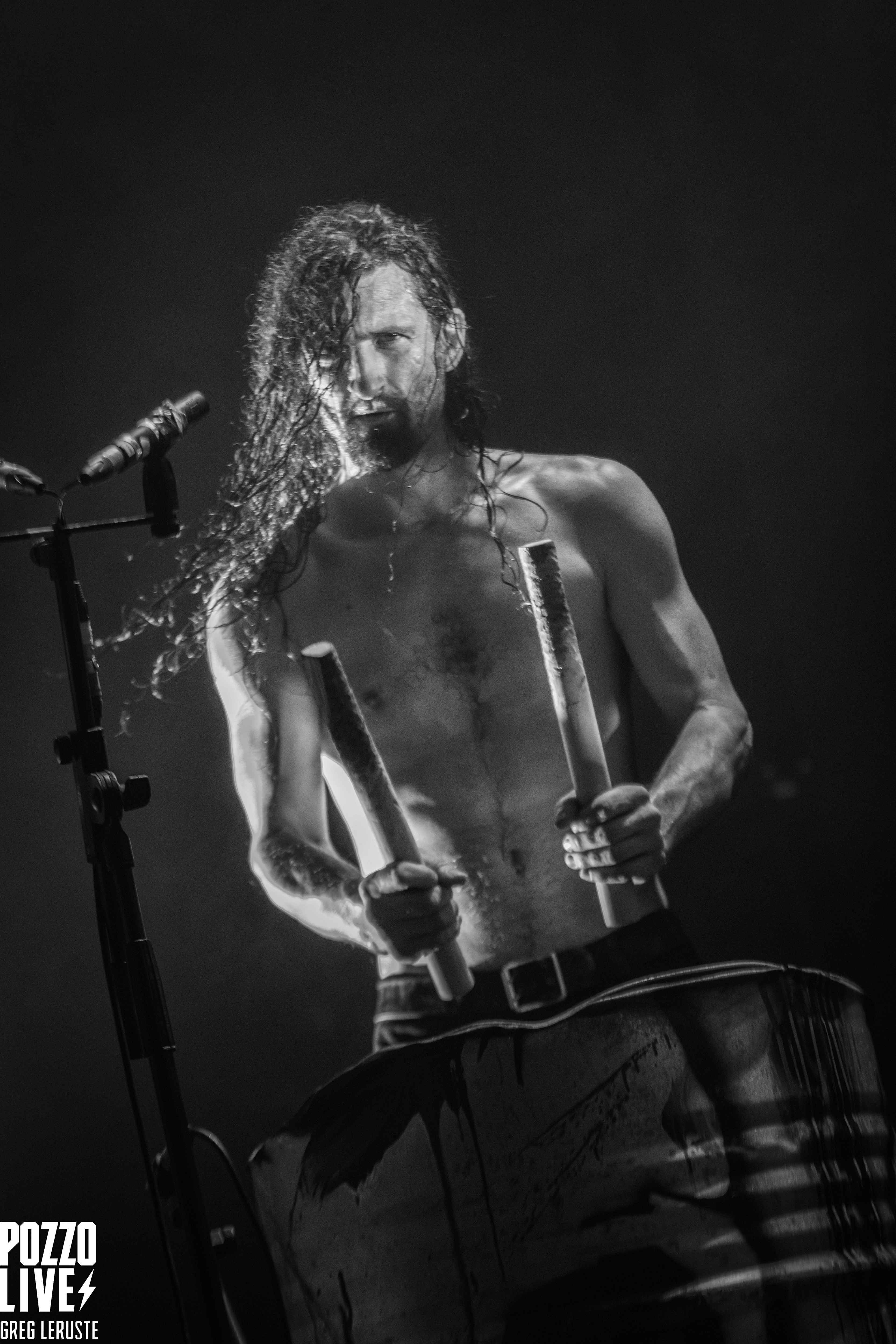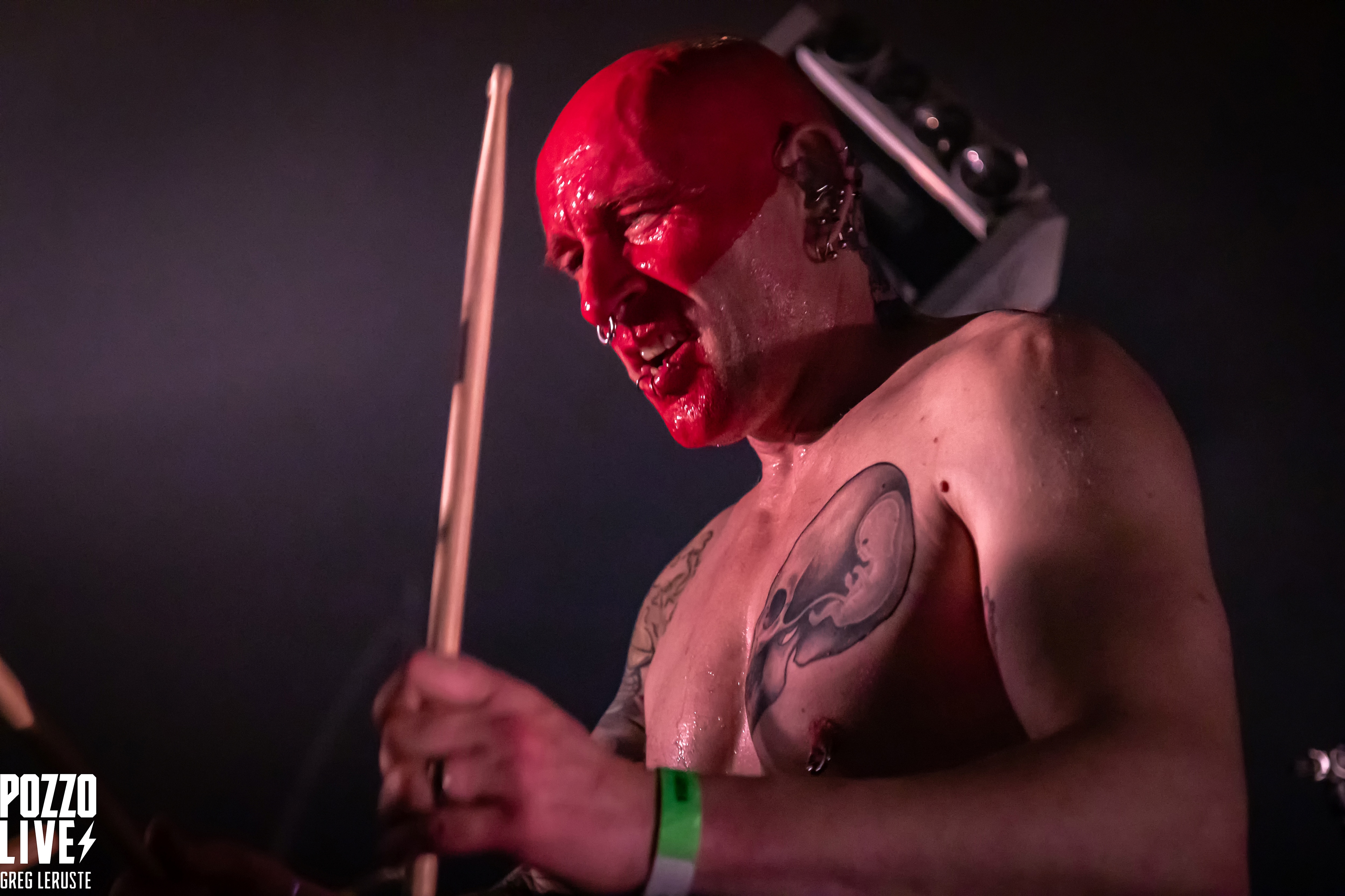 Après cette première partie électronique tonitruante, c’est au tour des Tambours du Bronx de retourner la scène du Bikini. Et petit plaisir de la soirée, la présence de Stéphane Buriez au chant, pour accompagner notre Renato national. Clairement, dès le premier morceau, on est soufflé par la puissance sonore que dégagent les bidons! La formation est impressionnante: une dizaine de bidons sur scène, deux guitares, une batterie et des machines! Beaucoup de visages connus d’ailleurs, comme par exemple Franky Costanza, ancien batteur de Dagoba. Les morceaux s’enchaînent et ne se ressemblent pas, nous avons même droit à quelques reprises (The Day Is My Enemy de The Prodigy, Roots Bloody Roots de Sepultura, et Dragula de Rob Zombie). Tout le public est conquis à en voir l’accueil qu’il réserve à nos marteleurs de fûts préférés! Tout le monde prend son pied, autant sur scène que dans la fosse, et la salle est chaude comme la braise à la fin du set des Tambours.