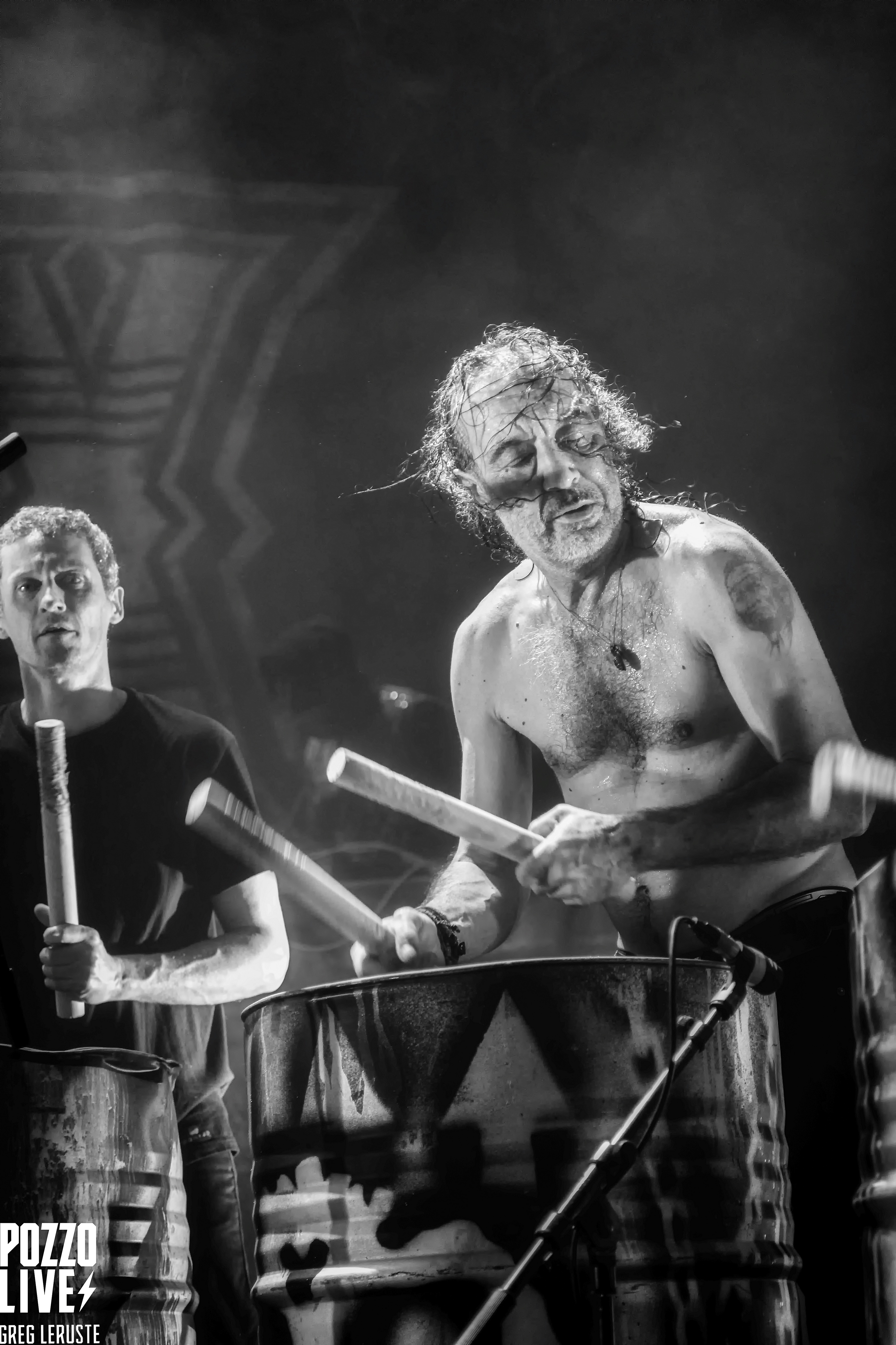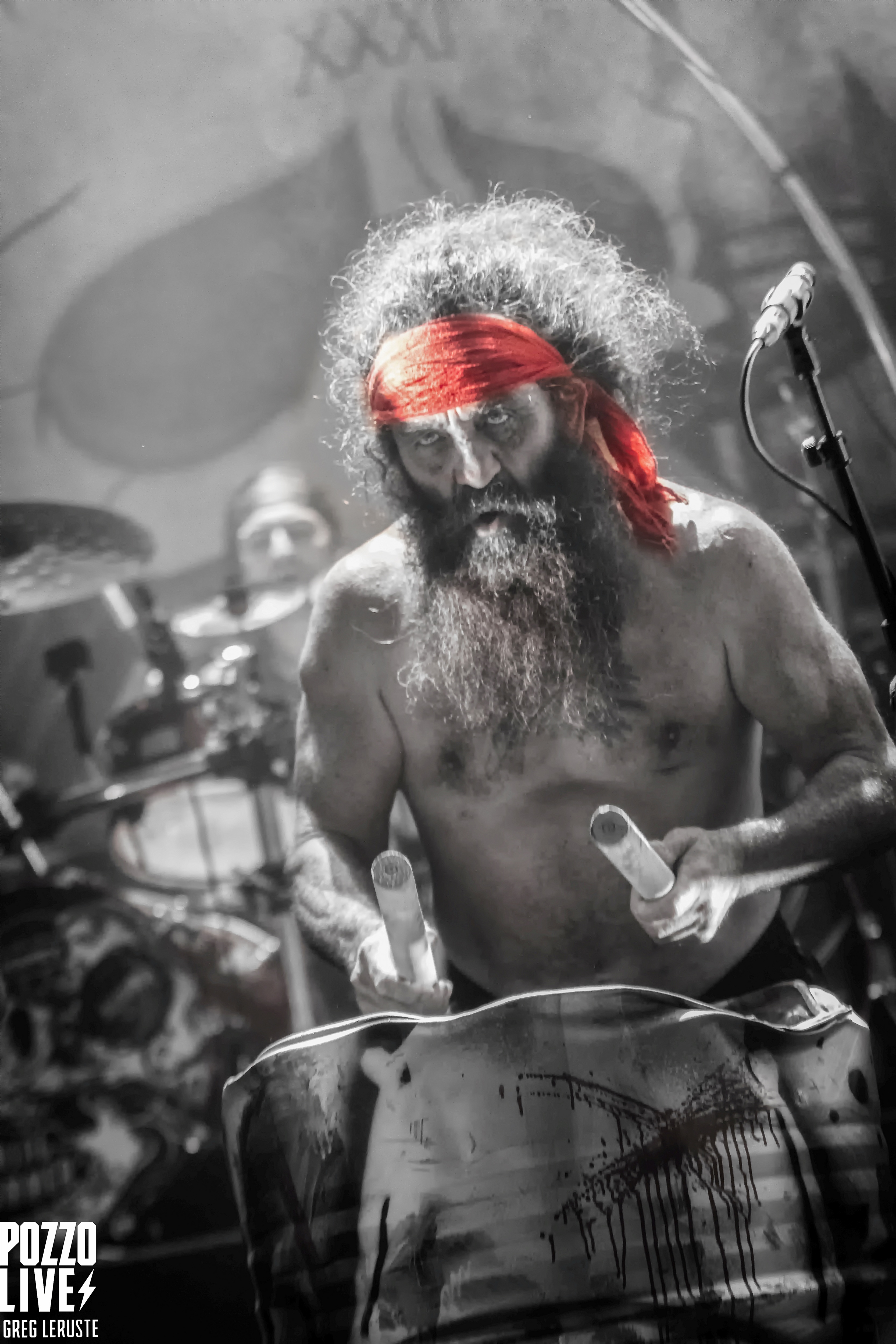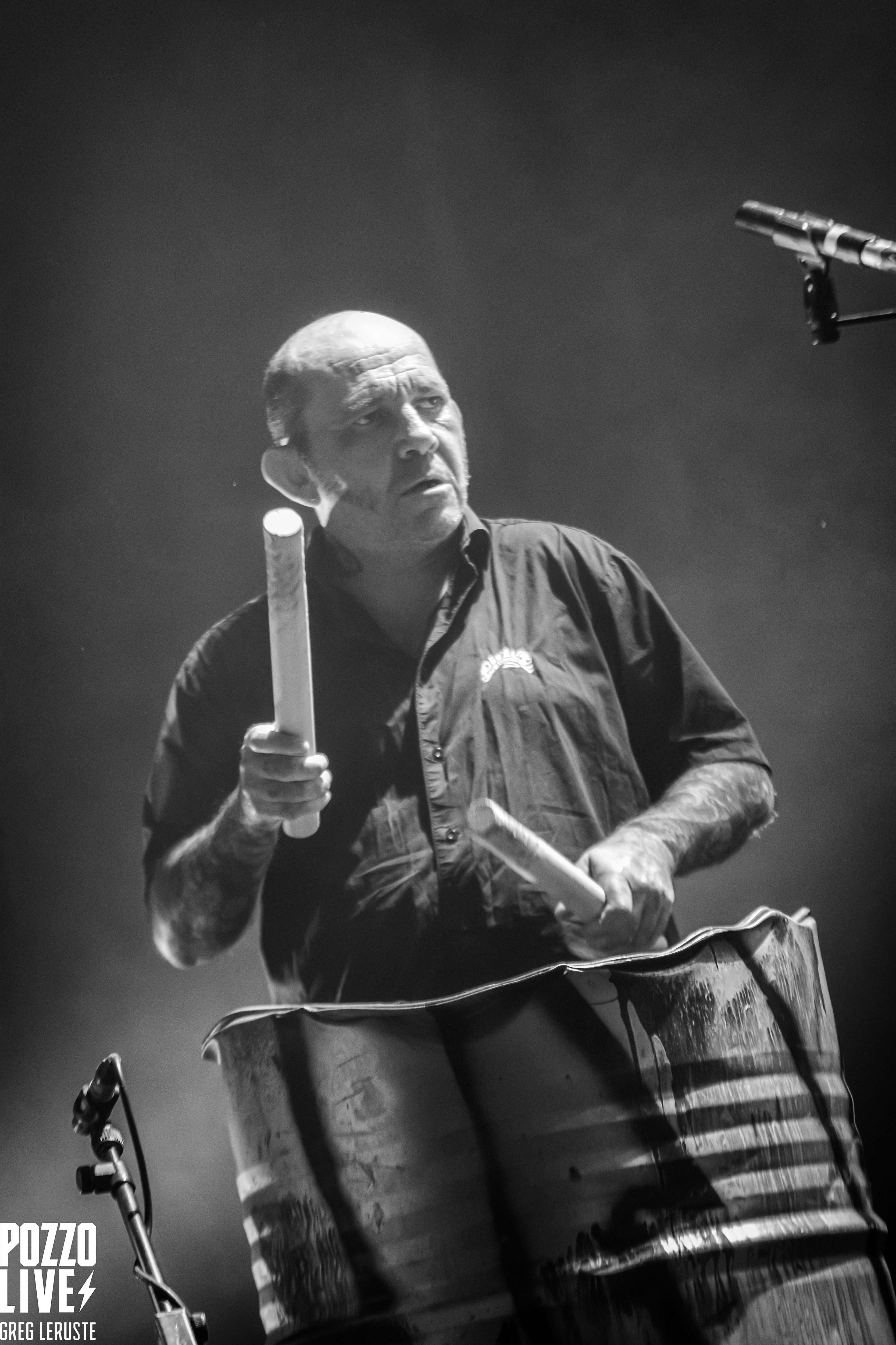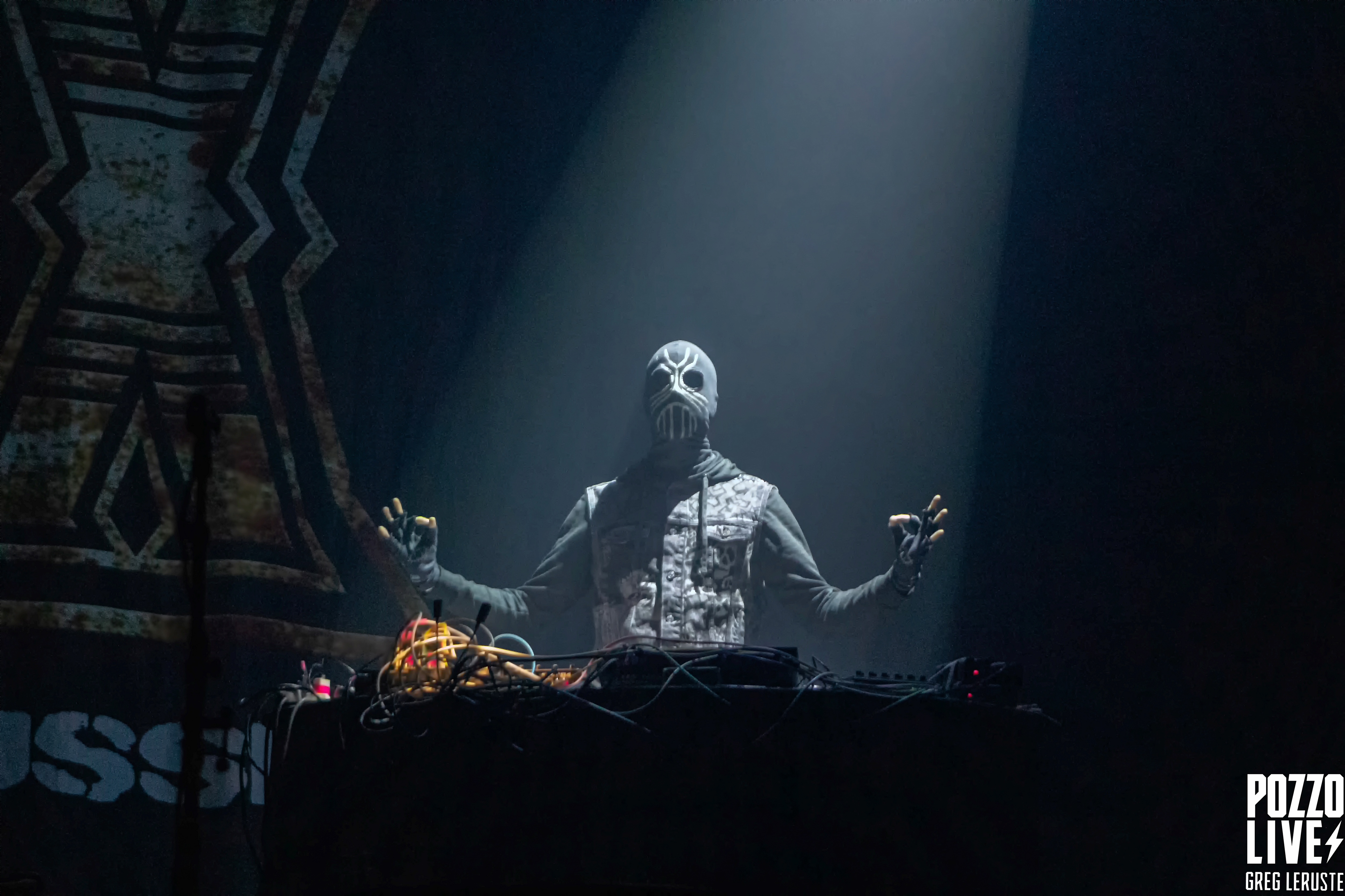 Après cette première partie électronique tonitruante, c’est au tour des Tambours du Bronx de retourner la scène du Bikini. Et petit plaisir de la soirée, la présence de Stéphane Buriez au chant, pour accompagner notre Renato national. Clairement, dès le premier morceau, on est soufflé par la puissance sonore que dégagent les bidons! La formation est impressionnante: une dizaine de bidons sur scène, deux guitares, une batterie et des machines! Beaucoup de visages connus d’ailleurs, comme par exemple Franky Costanza, ancien batteur de Dagoba. Les morceaux s’enchaînent et ne se ressemblent pas, nous avons même droit à quelques reprises (The Day Is My Enemy de The Prodigy, Roots Bloody Roots de Sepultura, et Dragula de Rob Zombie). Tout le public est conquis à en voir l’accueil qu’il réserve à nos marteleurs de fûts préférés! Tout le monde prend son pied, autant sur scène que dans la fosse, et la salle est chaude comme la braise à la fin du set des Tambours.