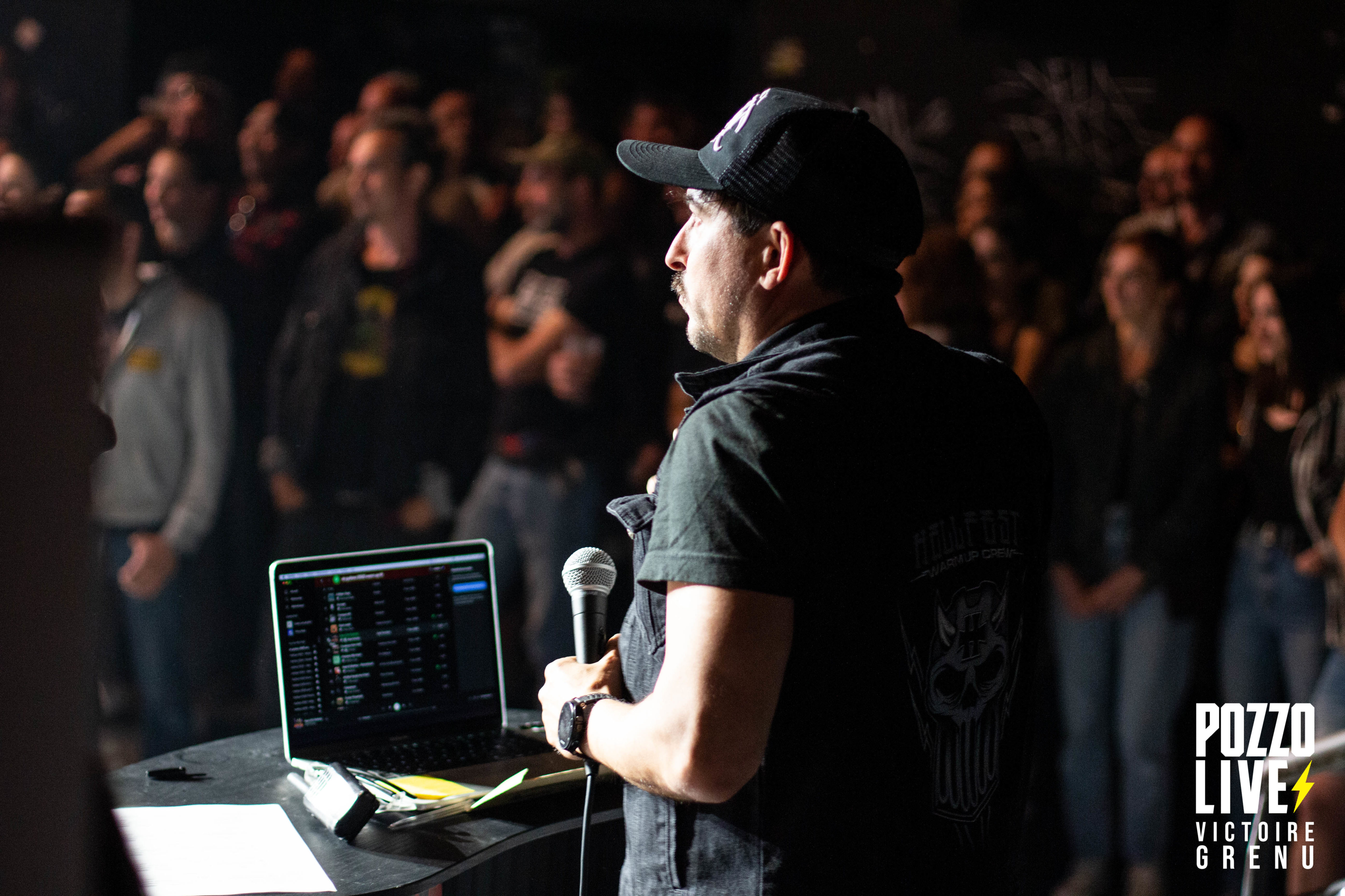 21h00 : c’est parti pour l’animation de cette soirée Warm Up à Bordeaux : concours de Air Guitar ! A gagner : 1 pass 3 jour pour le premier week-end du Hellfest 2022 et le droit de participer à la grande finale nationale de ce concours de Air Guitar. Les débuts sont néanmoins timides. Nous comptons en effet seulement 4 participants qui s’affrontent sur Municipal Waste, Megadeth, Steel Panther et Dropkick Murphys. Le système de notation est très simple : le public note le participant avec ses doigts de 0 à 5. En cas de coup de cœur, il est possible de mettre une note « metal » en faisant le \m/ avec les mains pour signaler que la note doit être supérieure à 5. Après rires et frayeurs, le gagnant de la 1ère session est consacré, mais la concurrence sera rude ! A peine la session terminée, les futurs participants se bousculent déjà pour s’inscrire pour la session suivante.