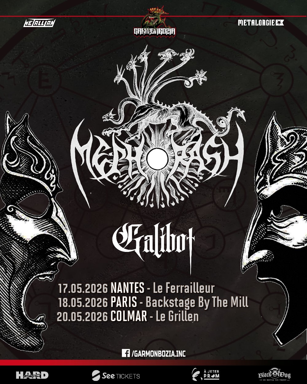 Pour ce run français, le délire s’étale donc sur trois soirées intenses. Ça commence à Nantes le 17 mai 2026, puis ça enchaîne à Paris le 18 mai, avant de refermer le grimoire à Colmar le 20 mai. Trois dates seulement, donc mieux vaut ne pas trop traîner si tu veux voir comment les nouveaux titres de Galibot se frottent à la liturgie sombre de Mephorash. En plus, ces soirées se montent en collaboration avec Black Speech et Aching, ce qui garantit une sélection de groupes et une ambiance clairement orientées vers les tréfonds.