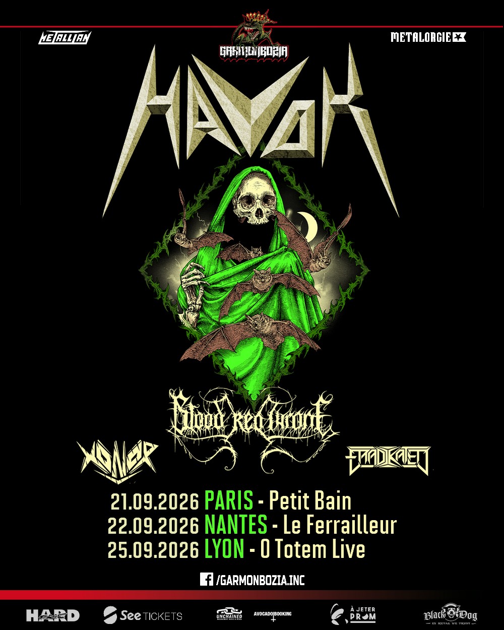 Prépare ton cou : HAVOK débarque en France avec une équipe prête à tout ravager. À l’automne 2026, le thrash survolté des Américains s’invite chez nous, accompagné de BLOOD RED THRONE, XONOR et ERADIKATED. Au programme, trois soirées en mode bulldozer à Paris, Nantes et Lyon. Si tu aimes les riffs qui tranchent, les tempos qui s’emballent et l’odeur de sueur métallique, tu peux déjà encercler septembre sur ton calendrier.
